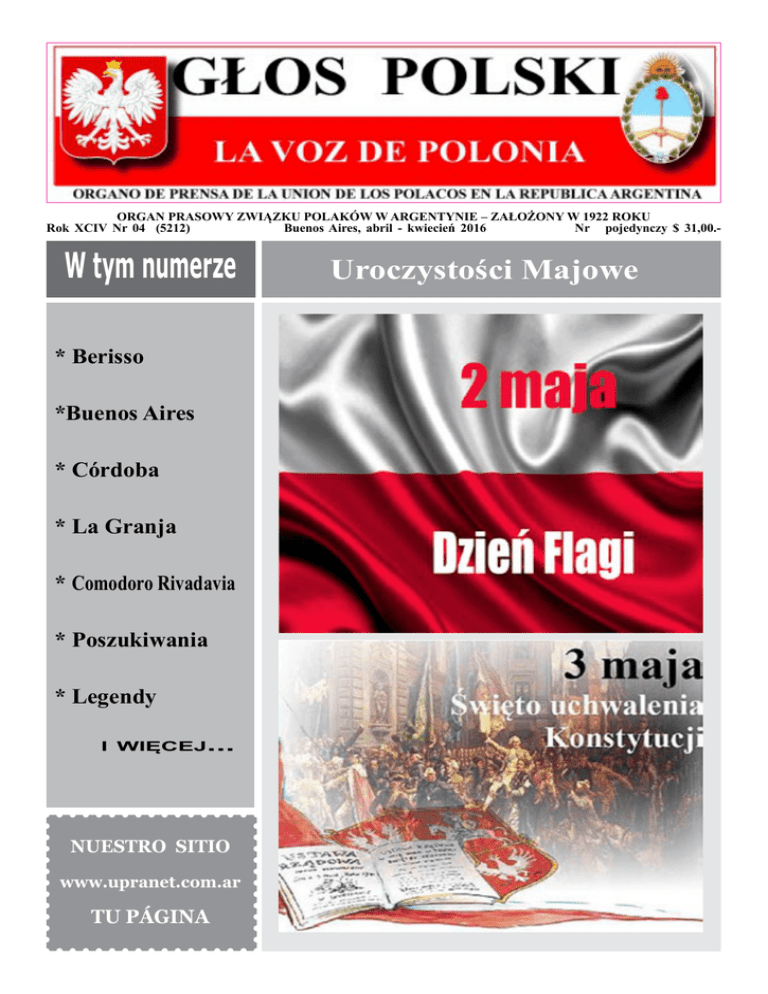 ORGAN PRASOWY ZWIĄZKU POLAKÓW W ARGENTYNIE – ZAŁOŻONY W 1922 ROKU Rok XCIV Nr 04 (5212) Buenos Aires, abril - kwiecień 2016 Nr pojedynczy $ 31,00.- W tym numerze * Berisso *Buenos Aires * Córdoba * La Granja * Comodoro Rivadavia * Poszukiwania * Legendy i więcej... NUESTRO SITIO www.upranet.com.ar TU PÁGINA Uroczystości Majowe Str. 2 Głos Polski Buenos Aires, Nr 04 / 2016 3 maja 1791 3 maja 1791 roku została uchwalona Konstytucja Rzeczypospolitej Obojga Narodów. Była pierwszą spisaną konstytucją w nowożytnej Europie, drugą na świecie po amerykańskiej. Już w dwa dni po uchwaleniu Konstytucji przez Sejm Wielki (1788-1792) dzień 3 maja uznano za święto narodowe, które później z powodu niewoli kraju zostało na długi czas zawieszone. Przywrócono je po odzyskaniu niepodległości w 1918 roku. Po II wojnie światowej w roku 1946 władze komunistyczne zabroniły publicznego świętowania, a próby manifestacji były tłumione przez milicję. W 1951 roku święto zostało oficjalnie zniesione. Od 1990 roku 3 Maja znów jest oficjalnym świętem państwowym w Polsce i dniem wolnym od pracy. Od 2007 roku jest również świętem narodowym Litwy. W szczególnie podniosłej atmosferze odbywają się główne obchody Święta 3 Maja przed Grobem Nieznanego Żołnierza na Placu Piłsudskiego w Warszawie. Towarzyszą im defilada wojskowa, salwy armatnie, uroczysta odprawa warty, składanie wieńców. Hołd dziełu wybitnych Polaków oddają przedstawiciele najwyższych władz państwowych, wojskowych, duchowieństwa, reprezentanci korpusu dyplomatycznego, kombatanci, harcerze i tysiące warszawiaków. Święto 3 maja jest świętem radosnym. W całej Polsce odbywają się wiosenne imprezy, koncerty, rodzinne majówki. Na ulicach stolicy rozgrywany jest „Bieg Konstytucji 3 maja” na dystansie 5 km. źródło: http://www.polska.pl/ ©2016 Ministerstwo Spraw Zagranicznych (5212) Dzień Flagi Rzeczypospolitej Polskiej Święto przypada 2 maja. Tego dnia Polacy wspominają długą historię białoczerwonych barw narodowych i z dumą eksponują flagi na zewnątrz. Polskie barwy narodowe jako jedne z nielicznych w świecie mają pochodzenie heraldyczne. Wywodzą się z barw herbu Królestwa Polskiego i herbu Wielkiego Księstwa Litewskiego. W symbolice polskiej flagi biel pochodzi od bieli Orła, będącego godłem Polski, i bieli Pogoni - rycerza galopującego na koniu, który jest godłem Litwy. Oba te godła znajdują się na czerwonych tarczach herbowych. Na fladze biel znalazła się u góry, a czerwień na dole, ponieważ w polskiej heraldyce ważniejszy jest kolor godła niż tła. Barwy biała i czerwona zostały po raz pierwszy uznane za narodowe 3 maja 1792 r., w pierwszą rocznicę uchwalenia Konstytucji 3 Maja. Formalnie zostały przyjęte jako kolory państwa polskiego przez Sejm Królestwa Polskiego w 1831 r., w czasie powstania listopadowego. Po odzyskaniu niepodległości wygląd polskiej flagi zatwierdził Sejm Ustawodawczy 1 sierpnia 1919 r. Dzień Flagi Rzeczypospolitej Polskiej jako święto obchodzony jest od 2004 roku. Tego dnia organizowane są liczne akcje patriotyczne, które przypominają o biało- czerwonych barwach narodowych. W ostatnich latach do łask wróciła też kokarda narodowa – biało-czerwona rozetka, noszona przez powstańców w XIX wieku. Dziś Polacy przypinają ją do ubrania podczas świąt państwowych. Drugiego maja Polska świętuje również Dzień Polonii i Polaków za Granicą. Zostało ono ustanowione przez Sejm Rzeczypospolitej Polskiej w 2002 roku w dowód uznania wielowiekowego dorobku i wkładu Polonii i Polaków za granicą w odzyskanie przez Polskę niepodległości oraz pomoc krajowi w najtrudniejszych momentach. Ocenia się, że poza Polską mieszka około 20 milionów osób o polskich korzeniach. źródło: http://www.polska.pl/ ©2016 Ministerstwo Spraw Zagranicznych (5212) Głos Polski Buenos Aires, Nr 04 / 2016 Córdoba CÓRDOBA Str. 3 CELEBRACIÓN DE LAS PASCUAS EN OGNISKO POLSKIE El domingo 27 de marzo asistimos a la misa de Pascuas de Resurrección en la iglesia Nuestra Señora Se llevó a cabo en la Asociación Polaca la tradicional de Guadalupe, celebrada por el Rvdo. Padre Javier Misa de Pascuas (Msza Wielkanocna). La ceremonia Solecki. Luego nos reunimos en Ognisko Polskie para contó con una numerosa cantidad de asistentes y cecompartir el tradicional almuerzo de camaradería. lebrada por uno de nuestros sacerdotes, el Padre GrLa Sra. presidente Krystyna Wardyga de Ferrari nos zegorz Górski. dio la bienvenida a los amigos de siempre y a los que llegaron por primera vez, para celebrar las Pascuas e iniciar los almuerzos mensuales del presente año. Presentó a las autoridades y a las personas provenientes de Inglaterra y Polonia, que llegaron a la ciudad para visitar a sus familiares en estas fiestas. Nos deseó Felices Pascuas en un clima familiar, que Jesús Resucitado llene de alegría los hogares y las Asociaciones Polacas en la Argentina y la llama de Ognisko Polskie nunca se apague. -El huevo de Pascuas representa el símbolo de vida, es En un ambiente familiar y dominical, familias y una tradición muy arraigada en los polacos - Aclaró. miembros que integran e integraron durante generaciones nuestra institución llevaron sus canastas pascuales con elementos tradicionales de esta celebración para ser bendecidos por Ks. Grzegorz: Huevos de chocolate, espigas de trigo, panes, kiełbasa, pisanki, entre otros. Al finalizar se invitó a los presentes a un breve brindis con degustación de bocadillos tradicionales como deliciosa kielbasa ahumada (salchicha polaca hecha artesanalmente por el Sr. Ricardo Iwulski), huevos duros, puré de remolacha, panes y roscas de Pascua Agradecemos a todos los socios y amigos por haber estado presentes en otra jornada entre polacos llevada a cabo en nuestra institución. Llamó a los sacerdotes para que bendijeran los Los esperamos en Mayo para celebrar juntos el 3 Maj