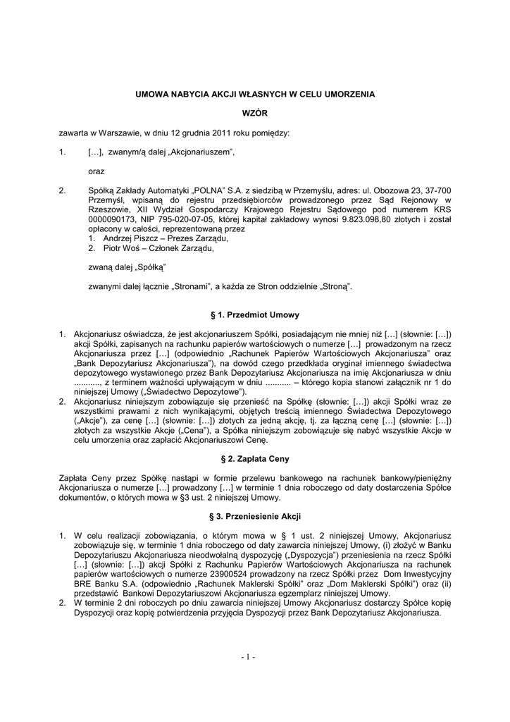 UMOWA NABYCIA AKCJI WŁASNYCH W CELU UMORZENIA WZÓR zawarta w Warszawie, w dniu 12 grudnia 2011 roku pomiędzy: 1. […], zwanym/ą dalej „Akcjonariuszem”, oraz 2. Spółką Zakłady Automatyki „POLNA” S.A. z siedzibą w Przemyślu, adres: ul. Obozowa 23, 37-700 Przemyśl, wpisaną do rejestru przedsiębiorców prowadzonego przez Sąd Rejonowy w Rzeszowie, XII Wydział Gospodarczy Krajowego Rejestru Sądowego pod numerem KRS 0000090173, NIP 795-020-07-05, której kapitał zakładowy wynosi 9.823.098,80 złotych i został opłacony w całości, reprezentowaną przez 1. Andrzej Piszcz – Prezes Zarządu, 2. Piotr Woś – Członek Zarządu, zwaną dalej „Spółką” zwanymi dalej łącznie „Stronami”, a każda ze Stron oddzielnie „Stroną”. § 1. Przedmiot Umowy 1. Akcjonariusz oświadcza, że jest akcjonariuszem Spółki, posiadającym nie mniej niż […] (słownie: […]) akcji Spółki, zapisanych na rachunku papierów wartościowych o numerze […] prowadzonym na rzecz Akcjonariusza przez […] (odpowiednio „Rachunek Papierów Wartościowych Akcjonariusza” oraz „Bank Depozytariusz Akcjonariusza”), na dowód czego przedkłada oryginał imiennego świadectwa depozytowego wystawionego przez Bank Depozytariusz Akcjonariusza na imię Akcjonariusza w dniu ..........., z terminem ważności upływającym w dniu ........... – którego kopia stanowi załącznik nr 1 do niniejszej Umowy („Świadectwo Depozytowe”). 2. Akcjonariusz niniejszym zobowiązuje się przenieść na Spółkę (słownie: […]) akcji Spółki wraz ze wszystkimi prawami z nich wynikającymi, objętych treścią imiennego Świadectwa Depozytowego („Akcje”), za cenę […] (słownie: […]) złotych za jedną akcję, tj. za łączną cenę […] (słownie: […]) złotych za wszystkie Akcje („Cena”), a Spółka niniejszym zobowiązuje się nabyć wszystkie Akcje w celu umorzenia oraz zapłacić Akcjonariuszowi Cenę. § 2. Zapłata Ceny Zapłata Ceny przez Spółkę nastąpi w formie przelewu bankowego na rachunek bankowy/pieniężny Akcjonariusza o numerze […] prowadzony […] w terminie 1 dnia roboczego od daty dostarczenia Spółce dokumentów, o których mowa w §3 ust. 2 niniejszej Umowy. § 3. Przeniesienie Akcji 1. W celu realizacji zobowiązania, o którym mowa w § 1 ust. 2 niniejszej Umowy, Akcjonariusz zobowiązuje się, w terminie 1 dnia roboczego od daty zawarcia niniejszej Umowy, (i) złożyć w Banku Depozytariuszu Akcjonariusza nieodwołalną dyspozycję („Dyspozycja”) przeniesienia na rzecz Spółki […] (słownie: […]) akcji Spółki z Rachunku Papierów Wartościowych Akcjonariusza na rachunek papierów wartościowych o numerze 23900524 prowadzony na rzecz Spółki przez Dom Inwestycyjny BRE Banku S.A. (odpowiednio „Rachunek Maklerski Spółki” oraz „Dom Maklerski Spółki”) oraz (ii) przedstawić Bankowi Depozytariuszowi Akcjonariusza egzemplarz niniejszej Umowy. 2. W terminie 2 dni roboczych po dniu zawarcia niniejszej Umowy Akcjonariusz dostarczy Spółce kopię Dyspozycji oraz kopię potwierdzenia przyjęcia Dyspozycji przez Bank Depozytariusz Akcjonariusza. -1- 3. Przeniesienie wszelkich praw wynikających z Akcji z Akcjonariusza na Spółkę nastąpi z chwilą rejestracji Akcji na Rachunku Maklerskim Spółki. § 4. Oświadczenia i zapewnienia Akcjonariusza Akcjonariusz niniejszym oświadcza i zapewnia Spółkę, że: 1) posiada pełną zdolność do zawarcia i wykonania niniejszej Umowy, a osoby podpisujące Umowę w imieniu Akcjonariusza są prawidłowo umocowane do związania Akcjonariusza postanowieniami Umowy; 2) podpisanie i wykonanie przez Akcjonariusza niniejszej Umowy nie spowoduje niemożliwości wykonania jakiejkolwiek innej umowy, której Akcjonariusz jest stroną, ani nie naruszy jakiejkolwiek decyzji administracyjnej ani orzeczenia sądowego (w tym sądu polubownego), którymi jest związany; 3) brak jest jakichkolwiek ograniczeń co do możliwości rozporządzania przez Akcjonariusza Akcjami (w tym ograniczeń umownych i roszczeń osób trzecich) i w związku z tym Akcje są w pełni zbywalne; Akcje są wolne od obciążeń jakimikolwiek prawami na rzecz osób trzecich, w tym w szczególności prawem pierwokupu, nie istnieją jakiekolwiek umowy, zobowiązania, ustalenia ani innego rodzaju porozumienia zobowiązujące Akcjonariusza do sprzedaży Akcji na rzecz osób trzecich, jak również Akcje nie są przedmiotem prowadzonego postępowania egzekucyjnego lub upadłościowego; 4) Świadectwo Depozytowe nie utraciło ważności. § 5. Oświadczenia i zapewnienia Spółki Spółka niniejszym oświadcza i zapewnia Akcjonariusza, że: 1) posiada pełną zdolność do zawarcia i wykonania niniejszej Umowy, a osoby podpisujące Umowę w imieniu Spółki są prawidłowo umocowane do związania Spółki postanowieniami Umowy; 2) podpisanie i wykonanie przez Spółkę niniejszej Umowy nie spowoduje niemożliwości wykonania jakiejkolwiek innej umowy, której Spółka jest stroną, ani nie naruszy jakiejkolwiek decyzji administracyjnej ani orzeczenia sądowego (w tym sądu polubownego), którymi jest związana. § 6. Polityka informacyjna. Zobowiązanie do zachowania poufności 1. Strony niniejszym postanawiają, że Spółka będzie koordynowała rozpowszechnianie informacji o fakcie zawarcia niniejszej Umowy oraz o jej treści, z uwzględnieniem przepisów prawa dotyczących tajemnicy zawodowej. 2. Strony zobowiązują się do zachowania w poufności faktu zawarcia niniejszej Umowy oraz jej treści, jak również wszelkich innych informacji zebranych w trakcie negocjacji mających na celu zawarcie Umowy. 3. Zobowiązaniem do zachowania poufności, o którym mowa w ust. 2 powyżej, nie są objęte informacje, które: i) są znane Stronie z innych źródeł, bez obowiązku zachowania ich w tajemnicy oraz bez naruszenia Umowy; ii) mogą być podane do publicznej wiadomości na podstawie pisemnej zgody drugiej Strony. 4. Zobowiązanie do z