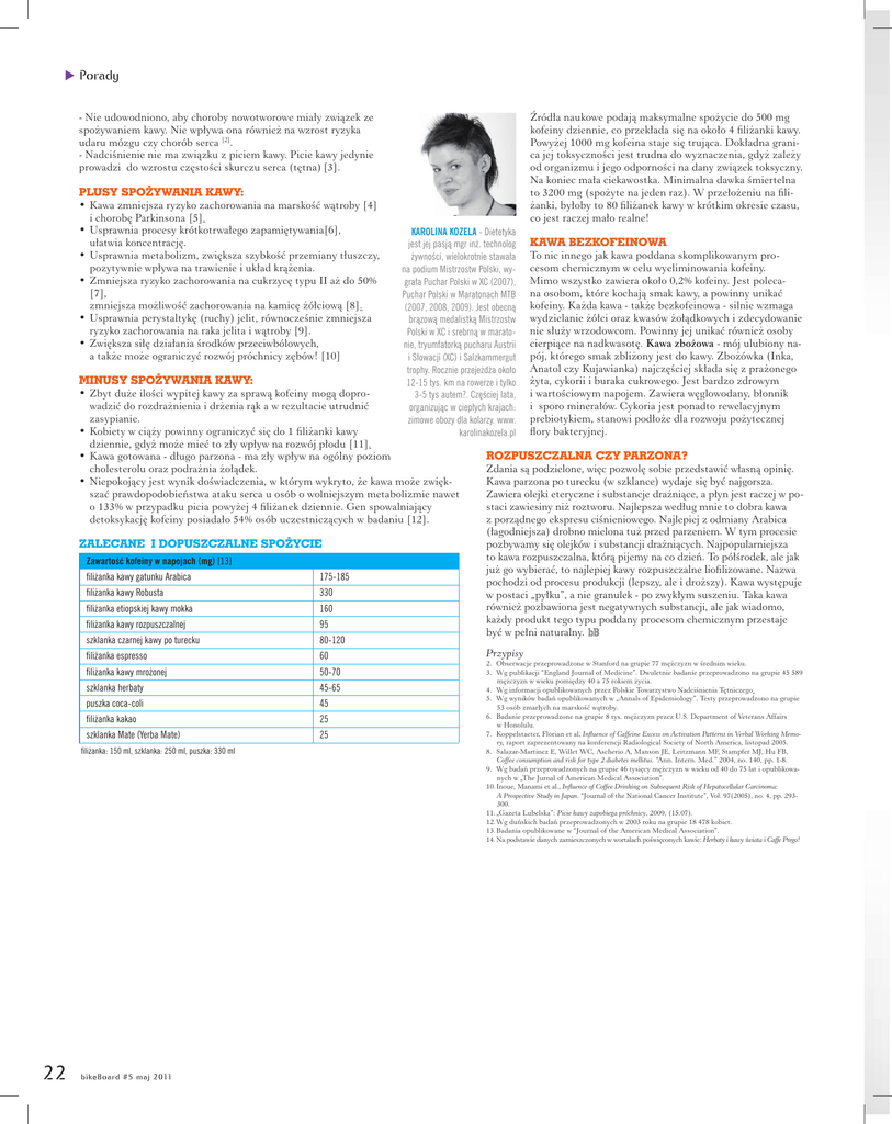 Porady - Nie udowodniono, aby choroby nowotworowe miały związek ze spożywaniem kawy. Nie wpływa ona również na wzrost ryzyka udaru mózgu czy chorób serca [2]. - Nadciśnienie nie ma związku z piciem kawy. Picie kawy jedynie prowadzi do wzrostu częstości skurczu serca (tętna) [3]. PLUSY SPOŻYWANIA KAWY: • Kawa zmniejsza ryzyko zachorowania na marskość wątroby [4] i chorobę Parkinsona [5]. • Usprawnia procesy krótkotrwałego zapamiętywania[6], ułatwia koncentrację. • Usprawnia metabolizm, zwiększa szybkość przemiany tłuszczy, pozytywnie wpływa na trawienie i układ krążenia. • Zmniejsza ryzyko zachorowania na cukrzycę typu II aż do 50% [7], zmniejsza możliwość zachorowania na kamicę żółciową [8]. • Usprawnia perystaltykę (ruchy) jelit, równocześnie zmniejsza ryzyko zachorowania na raka jelita i wątroby [9]. • Zwiększa siłę działania środków przeciwbólowych, a także może ograniczyć rozwój próchnicy zębów! [10] Źródła naukowe podają maksymalne spożycie do 500 mg kofeiny dziennie, co przekłada się na około 4 filiżanki kawy. Powyżej 1000 mg kofeina staje się trująca. Dokładna granica jej toksyczności jest trudna do wyznaczenia, gdyż zależy od organizmu i jego odporności na dany związek toksyczny. Na koniec mała ciekawostka. Minimalna dawka śmiertelna to 3200 mg (spożyte na jeden raz). W przełożeniu na filiżanki, byłoby to 80 filiżanek kawy w krótkim okresie czasu, co jest raczej mało realne! KAROLINA KOZELA - Dietetyka jest jej pasją mgr inż. technolog żywności, wielokrotnie stawała na podium Mistrzostw Polski, wygrała Puchar Polski w XC (2007), Puchar Polski w Maratonach MTB (2007, 2008, 2009). Jest obecną brązową medalistką Mistrzostw Polski w XC i srebrną w maratonie, tryumfatorką pucharu Austrii i Słowacji (XC) i Salzkammergut trophy. Rocznie przejeżdża około 12-15 tys. km na rowerze i tylko 3-5 tys autem?. Częściej lata, organizując w ciepłych krajach: zimowe obozy dla kolarzy. www. karolinakozela.pl MINUSY SPOŻYWANIA KAWY: • Zbyt duże ilości wypitej kawy za sprawą kofeiny mogą doprowadzić do rozdrażnienia i drżenia rąk a w rezultacie utrudnić zasypianie. • Kobiety w ciąży powinny ograniczyć się do 1 filiżanki kawy dziennie, gdyż może mieć to zły wpływ na rozwój płodu [11]. • Kawa gotowana - długo parzona - ma zły wpływ na ogólny poziom cholesterolu oraz podrażnia żołądek. • Niepokojący jest wynik doświadczenia, w którym wykryto, że kawa może zwiększać prawdopodobieństwa ataku serca u osób o wolniejszym metabolizmie nawet o 133% w przypadku picia powyżej 4 filiżanek dziennie. Gen spowalniający detoksykację kofeiny posiadało 54% osób uczestniczących w badaniu [12]. ZALECANE I DOPUSZCZALNE SPOŻYCIE Zawartość kofeiny w napojach (mg) [13] filiżanka kawy gatunku Arabica 330 filiżanka etiopskiej kawy mokka 160 filiżanka kawy rozpuszczalnej 95 szklanka czarnej kawy po turecku 80-120 filiżanka espresso 60 filiżanka kawy mrożonej 50-70 szklanka herbaty 45-65 puszka coca-coli 45 filiżanka kakao 25 szklanka Mate (Yerba Mate) 25 filiżanka: 150 ml, szklanka: 250 ml, puszka: 330 ml 22 175-185 filiżanka kawy Robusta bikeBoar d #5 maj 2011 KAWA BEZKOFEINOWA To nic innego jak kawa poddana skomplikowanym procesom chemicznym w celu wyeliminowania kofeiny. Mimo wszystko zawiera około 0,2% kofeiny. Jest polecana osobom, które kochają smak kawy, a powinny unikać kofeiny. Każda kawa - także bezkofeinowa - silnie wzmaga wydzielanie żółci oraz kwasów żołądkowych i zdecydowanie nie służy wrzodowcom. Powinny jej unikać również osoby cierpiące na nadkwasotę. Kawa zbożowa - mój ulubiony napój, którego smak zbliżony jest do kawy. Zbożówka (Inka, Anatol czy Kujawianka) najczęściej składa się z prażonego żyta, cykorii i buraka cukrowego. Jest bardzo zdrowym i wartościowym napojem. Zawiera węglowodany, błonnik i sporo minerałów. Cykoria jest ponadto rewelacyjnym prebiotykiem, stanowi podłoże dla rozwoju pożytecznej flory bakteryjnej. ROZPUSZCZALNA CZY PARZONA? Zdania są podzielone, więc pozwolę sobie przedstawić własną opinię. Kawa parzona po turecku (w szklance) wydaje się być najgorsza. Zawiera olejki eteryczne i substancje drażniące, a płyn jest raczej w postaci zawiesiny niż roztworu. Najlepsza według mnie to dobra kawa z porządnego ekspresu ciśnieniowego. Najlepiej z odmiany Arabica (łagodniejsza) drobno mielona tuż przed parzeniem. W tym procesie pozbywamy się olejków i substancji drażniących. Najpopularniejsza to kawa rozpuszczalna, którą pijemy na co dzień. To półśrodek, ale jak już go wybierać, to najlepiej kawy rozpuszczalne liofilizowane. Nazwa pochodzi od procesu produkcji (lepszy, ale i droższy). Kawa występuje w postaci „pyłku”, a nie granulek - po zwykłym suszeniu. Taka kawa również pozbawiona jest negatywnych substancji, ale jak wiadomo, każdy produkt tego typu poddany procesom chemicznym przestaje być w pełni naturalny. Przypisy 2. Obserwacje przeprowadzone w Stanford na grupie 77 mężczyzn w średnim wieku. 3. Wg publikacji “England Journal of Medicine”. Dwuletnie badanie przeprowadzono na grupie 45 589 mężczyzn w wieku pomiędzy 40 a 75 rokiem życia. 4. Wg informacji opublikowanych przez Polskie Towarzystwo Nadciśnienia Tętniczego. 5. Wg wyników badań opublikowanych w „Annals of Epidemiology”. Testy przeprowadzono na grupie 53 osób zmarłych na marskość wątroby. 6. Badanie przeprowadzone na grupie 8 tys. mężczyzn przez U.S. Department of Veterans Affairs w Honolulu. 7. Koppelstaeter, Florian et al, Influence of Caffeine Excess on Activation Patterns in Verbal Working Memory, raport zaprezentowany na konferencji Radiological Society of North America, listopad 2005. 8. Salazar-Martinez E, Willet WC, Ascherio A, Manson JE, Leitzmann MF, Stampfer MJ, Hu FB, Coffee consumption and risk for type 2 diabetes mellitus. “Ann. I