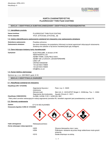 Aktualizacja APRIL 2013 Weryfikacja 6 KARTA CHARAKTERYSTYKI FLUOROCOAT THIN FILM COATING SEKCJA 1: IDENTYFIKACJA SUBSTANCJI/MIESZANINY I IDENTYFIKACJA PRZEDSIĘBIORSTWA 1.1. Identyfikator produktu Nazwa handlowa Numer preparatu FLUOROCOAT THIN FILM COATING TFCF, ETFCF250, ETFCF05L, ZE 1.2. Istotne zidentyfikowane zastosowania substancji lub mieszaniny oraz zastosowania odradzane Stwierdzone zastosowania Zastosowania odradzane Powłoka ochronna Na dzień dzisiejszy nie posiadamy informacji na temat ograniczeń dotyczących stosowania. Zostaną one zawarte w tej karcie charakterystyki gdy dostępne. 1.3. Dane dotyczące dostawcy karty charakterystyki Dystrybutor ELECTROLUBE. A division of HK WENTWORTH LTD ASHBY PARK, COALFIELD WAY, ASHBY DE LA ZOUCH, LEICESTERSHIRE LE65 1JR UNITED KINGDOM +44 (0)1530 419600 +44 (0)1530 416640 [email protected] 1.4. Numer telefonu alarmowego Semicon sp. z o.o. 226156431 godz: 8-16 SEKCJA 2: IDENTYFIKACJA ZAGROŻEŃ 2.1. Klasyfikacja substancji lub mieszaniny Klasyfikacja (WE 1272/2008) Zagrożenia fizyczne i Flam. Liq. 2 - H225 chemiczne Zdrowie ludzi Skin Irrit. 2 - H315;STOT Single 3 - H336;Asp. Tox. 1 - H304 Zagrożenie dla środowiska Aquatic Chronic 2 - H411 Klasyfikacja (1999/45/EWG) Xn;R65. Xi;R38. F;R11. N;R51/53. R67. Pełny tekst zwrotów wskazujących rodzaj zagrożenia (zwrotów R) i określeń zagrożeń jest przedstawiony w sekcji 16. 2.2. Elementy oznakowania Zawiera C7-C10 ISO-ALKANES Oznaczenia Zgodnie Z (WE) Nr 1272/2008 Hasło ostrzegawcze Niebezpieczeństwo Zwroty wskazujące rodzaj zagrożenia H225 H304 H315 Wysoce łatwopalna ciecz i pary. Połknięcie i dostanie się przez drogi oddechowe może grozić śmiercią. Działa drażniąco na skórę. 1/ 7 FLUOROCOAT THIN FILM COATING H336 H411 Może wywoływać uczucie senności lub zawroty głowy. Działa toksycznie na organizmy wodne, powodując długotrwałe skutki. P210 Przechowywać z dala od źródeł ciepła/iskrzenia/otwar tego ognia/gorących powierzchni. Palenie wzbronione. Stosować rękawice ochronne, ochronę oczu i twarzy. Zwroty wskazujące środki ostrożności P280 Dodatkowe zwroty wskazujące środki ostrożności P261 P301+310 P331 P332+313 Unikać wdychania par/rozpylonej cieczy. W PRZYPADKU POŁKNIĘCIA: Natychmiast skontaktować się z OŚRODKIEM ZATRUĆ lub z lekarzem. NIE wywoływać wymiotów. W przypadku wystąpienia podrażnienia skóry: Zasięgnąć porady/zgłosić się pod opiekę lekarza. 2.3. Inne zagrożenia Nieklasyfikowany jako PBT / vPvB na podstawie obecnych kryteriów UE. SEKCJA 3: SKŁAD/INFORMACJA O SKŁADNIKACH 3.2. Mieszaniny C7-C10 ISO-ALKANES Numer CAS: 90622-56-3 80-100% Numer WE: 292-458-5 Klasyfikacja (WE 1272/2008) Nie sklasyfikowane. Klasyfikacja (67/548/EWG) Xn;R65. Xi;R38. F;R11. N;R51/53. R67. Pełny tekst zwrotów wskazujących rodzaj zagrożenia (zwrotów R) i określeń zagrożeń jest przedstawiony w sekcji 16. Uwagi względem składu Składniki nie wymienione są zakwalifikowe jako sybstancje nieszkodliwe lub w stężeniu poniżej dopuszczalnego poziomu. SEKCJA 4: ŚRODKI PIERWSZEJ POMOCY 4.1. Opis środków pierwszej pomocy Wdychanie Niezwłocznie wynieść/wyprowadzić osobę narażoną na wdychanie na świeże powietrze. Zapewnić poszkodowanej osobie ciepło i odpoczynek. Zapewnić niezwłoczną opiekę lekarską. Spożycie Dokładnie wypłukać usta. Nie wywoływać wymiotów. W przypadku wymiotów trzymać głowę nisko, aby wymioty nie przedostały się z żołądka do płuc. Zapewnić odpoczynek, ciepło i świeże powietrze. Natychmiast zapewnić opiekę lekarską! Kontakt ze skórą Natychmiast umyć skórę wodą z mydłem. Jeśli podrażnienie nie zniknie po myciu, skontaktować się z lekarzem. Kontakt z oczami Przed płukaniem upewnić się, że ewentualne soczewki kontaktowe zostały wyjęte z oczu. Niezwłocznie przemyć oczy dużą ilością wody, podnosząc powieki. Kontynuować płukanie przez co najmniej 15 minut. W przypadku utrzymującego się podrażnienia skontaktować się z lekarzem. 4.2. Najważniejsze ostre i opóźnione objawy oraz skutki narażenia 4.3. Wskazania dotyczące wszelkiej natychmiastowej pomocy lekarskiej i szczególnego postępowania z poszkodowanym Leczyć objawowo. SEKCJA 5: POSTĘPOWANIE W PRZYPADKU POŻARU 5.1. Środki gaśnicze 2/ 7 FLUOROCOAT THIN FILM COATING Środki gaśnicze Pożar można ugasić stosując: Piana. Suche środki chemiczne, piasek, dolomit itp. 5.2. Szczególne zagrożenia związane z substancją lub mieszaniną Niebezpieczne produkty spalania Wskutek rozkładu termicznego lub spalania mogą uwalniać się tlenki węgla i inne toksyczne gazy oraz pary. Nadzwyczajne zagrożenia pożarowe i wybuchowe Nie stwierdzono nadzwyczajnych zagrożeń pożarem ani wybuchem. Zagrożenia specyficzne Preparat jest łatwo palny i przy podgrzewaniu może wydzielać pary, które mogą tworzyć wybuchowe mieszaniny z powietrzem. 5.3. Informacje dla straży pożarnej Szczególne Procedury Gasnicze Unikać wdychania par z pożaru. Pojemniki narażone na pożar chłodzić wodą jeszcze długo po ugaszeniu pożaru. Środki ochrony personelu straży pożarnej W warunkach pożarowych stosować urządzenia oddechowe z własnym obiegiem powietrza i odzież ochronną na całe ciało. SEKCJA 6: POSTĘPOWANIE W PRZYPADKU NIEZAMIERZONEGO UWOLNIENIA DO ŚRODOWISKA 6.1. Indywidualne środki ostrożności, wyposażenie ochronne i procedury w sytuacjach awaryjnych Stosować odzież ochronną zgodnie z sekcją 8 niniejszej karty charakterystyki preparatu niebezpiecznego. 6.2. Środki ostrożności w zakresie ochrony środowiska Nie odprowadzać do kanalizacji, gruntu i cieków wodnych. 6.3. Metody i materiały zapobiegające rozprzestrzenianiu się skażenia i służące do usuwania skażenia Wygasić wszystkie źródła zapłonu. Unikać iskier, płomieni, wysokiej temperatury i dymienia. Wietrzyć. Zebrać wermikulitem, suchym piaskiem albo ziemią i przesypać do pojemników. 6.4. Odniesienia do inny