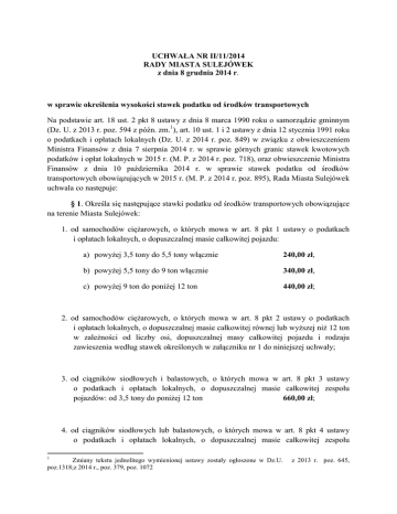 UCHWAŁA NR II/11/2014 RADY MIASTA SULEJÓWEK z dnia 8 grudnia 2014 r. w sprawie określenia wysokości stawek podatku od środków transportowych Na podstawie art. 18 ust. 2 pkt 8 ustawy z dnia 8 marca 1990 roku o samorządzie gminnym (Dz. U. z 2013 r. poz. 594 z późn. zm.1), art. 10 ust. 1 i 2 ustawy z dnia 12 stycznia 1991 roku o podatkach i opłatach lokalnych (Dz. U. z 2014 r. poz. 849) w związku z obwieszczeniem Ministra Finansów z dnia 7 sierpnia 2014 r. w sprawie górnych granic stawek kwotowych podatków i opłat lokalnych w 2015 r. (M. P. z 2014 r. poz. 718), oraz obwieszczenie Ministra Finansów z dnia 10 października 2014 r. w sprawie stawek podatku od środków transportowych obowiązujących w 2015 r. (M. P. z 2014 r. poz. 895), Rada Miasta Sulejówek uchwala co następuje: § 1. Określa się następujące stawki podatku od środków transportowych obowiązujące na terenie Miasta Sulejówek: 1. od samochodów ciężarowych, o których mowa w art. 8 pkt 1 ustawy o podatkach i opłatach lokalnych, o dopuszczalnej masie całkowitej pojazdu: a) powyżej 3,5 tony do 5,5 tony włącznie 240,00 zł, b) powyżej 5,5 tony do 9 ton włącznie 340,00 zł, c) powyżej 9 ton do poniżej 12 ton 440,00 zł; 2. od samochodów ciężarowych, o których mowa w art. 8 pkt 2 ustawy o podatkach i opłatach lokalnych, o dopuszczalnej masie całkowitej równej lub wyższej niż 12 ton w zależności od liczby osi, dopuszczalnej masy całkowitej pojazdu i rodzaju zawieszenia według stawek określonych w załączniku nr 1 do niniejszej uchwały; 3. od ciągników siodłowych i balastowych, o których mowa w art. 8 pkt 3 ustawy o podatkach i opłatach lokalnych, o dopuszczalnej masie całkowitej zespołu pojazdów: od 3,5 tony do poniżej 12 ton 660,00 zł; 4. od ciągników siodłowych lub balastowych, o których mowa w art. 8 pkt 4 ustawy o podatkach i opłatach lokalnych, o dopuszczalnej masie całkowitej zespołu 1 Zmiany tekstu jednolitego wymienionej ustawy zostały ogłoszone w Dz.U. poz.1318;z 2014 r., poz. 379, poz. 1072 z 2013 r. poz. 645, pojazdów równej lub wyższej niż 12 ton w zależności od liczby osi jezdnych i rodzaju zawieszenia według stawek określonych w załączniku nr 2 do niniejszej uchwały; 5. od przyczep i naczep, o których mowa w art. 8 pkt 5 ustawy o podatkach i opłatach lokalnych, które łącznie z pojazdem silnikowym posiadają dopuszczalną masę całkowitą od 7 ton i poniżej 12 ton (z wyjątkiem związanych wyłącznie z działalnością rolniczą prowadzoną przez podatnika podatku rolnego) 500,00 zł; 6. od przyczep i naczep, o których mowa w art. 8 pkt 6 ustawy o podatkach i opłatach lokalnych (z wyjątkiem związanych wyłącznie z działalnością rolniczą prowadzoną przez podatnika podatku rolnego), które łącznie z pojazdem silnikowym posiadają dopuszczalną masę całkowitą równą lub wyższą niż 12 ton według stawek określonych w załączniku nr 3 do niniejszej uchwały; 7. od autobusów, o których mowa w art. 8 pkt 7 ustawy o podatkach i opłatach lokalnych, o liczbie miejsc do siedzenia: a) mniejszej niż 30 miejsc 440,00 zł, b) równej lub wyższej niż 30 miejsc 590,00 zł. § 2. Wykonanie uchwały powierza się Burmistrzowi Miasta Sulejówek. § 3. Traci moc uchwała Rady Miasta Sulejówek Nr XXXVI/276/2012 z dnia 13 grudnia 2012 r. w sprawie określenia stawek podatku od środków transportowych. § 4. Uchwała wchodzi w życie po upływie 14 dni od jej ogłoszenia w Dzienniku Urzędowym Województwa Mazowieckiego, z mocą obowiązującą od dnia 1 stycznia 2015 roku. Przewodniczący Rady Miasta Sulejówek Daniel Dąbrowski Załącznik nr 1 do Uchwały nr II/11/2014 Rady Miasta Sulejówek z dnia 8 grudnia 2014 r. STAWKI PODATKU DLA POJAZDÓW OKREŚLONYCH w art. 8 pkt 2 ustawy o podatkach i opłatach lokalnych Liczba osi i dopuszczalna masa całkowita (w tonach) nie mniej niż mniej niż 1 2 12 13 14 15 13 14 15 12 17 19 21 23 25 17 19 21 23 25 12 25 27 29 31 25 27 29 31 Stawka podatku (w złotych) Oś jezdna (osie jezdne) z zawieszeniem pneumatycznym lub zawieszeniem uznanym za równoważne Inny system zawieszenia osi jezdnych 3 4 Dwie osie 390 400 410 570 Trzy osie 500 490 530 700 1059 1050 Cztery osie i więcej 690 700 1087 1726 1720 450 500 580 1300 600 600 690 1060 1645 1640 700 1090 1730 2560 2550 Załącznik nr 2 do Uchwały nr II/11/2014 Rady Miasta Sulejówek z dnia 8 grudnia 2014 r. STAWKI PODATKU DLA POJAZDÓW OKREŚLONYCH w art. 8 pkt 4 ustawy o podatkach i opłatach lokalnych Liczba osi i dopuszczalna masa całkowita (w tonach) nie mniej niż mniej niż 1 2 12 18 25 31 18 25 31 12 40 40 Stawka podatku (w złotych) Oś jezdna (osie jezdne) z zawieszeniem pneumatycznym lub zawieszeniem uznanym za równoważne Inny system zawieszenia osi jezdnych 3 4 Dwie osie 400 450 600 1398 Trzy osie i więcej 1301 1788 450 502 960 2023 1798 2660 Załącznik nr 3 do Uchwały nr II/11/2014 Rady Miasta Sulejówek z dnia 8 grudnia 2014 r. STAWKI PODATKU DLA POJAZDÓW OKREŚLONYCH w art. 8 pkt 6 ustawy o podatkach i opłatach lokalnych Liczba osi i dopuszczalna masa całkowita (w tonach) nie mniej niż mniej niż 1 2 12 18 25 18 25 12 28 33 38 28 33 38 12 38 38 Stawka podatku (w złotych) Oś jezdna (osie jezdne) z zawieszeniem pneumatycznym lub zawieszeniem uznanym za równoważne 3 Jedna oś 200 200 330 Dwie osie 240 630 890 1200 Trzy osie i więcej 707 922 Inny system zawieszenia osi jezdnych 4 200 340 590 330 887 1348 1774 984 1337 UZASADNIENIE Na podstawie art. 10 ust. 1 i ust. 2 ustawy z dnia 12 stycznia 1991 r. o podatkach i opłatach lokalnych (tekst jednolity Dz. U. z 2014 r. poz. 849) rady gmin w drodze uchwały określają wysokość stawek podatku od środków transportowych mając na względzie roczne stawki podatku od jednego środka transportowego, które nie mogą przekroczyć stawki maksymalnej oraz nie mogą być niższe od stawki minimalnej. Przy określaniu stawek uwzględniono rodzaj środka transportowego, 