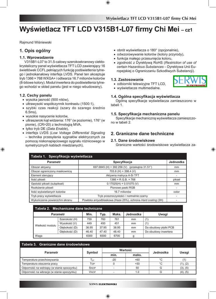 Wyświetlacz TFT LCD V315B1-L07 firmy Chi Mei Wyświetlacz TFT LCD V315B1-L07 firmy Chi Mei – cz1 Rajmund Wiśniewski 1. Opis ogólny 1.1. Wprowadzenie V315B1-L07 to 31.5-calowy szerokoekranowy ciekłokrystaliczny panel wyświetlacza TFT LCD zawierający 16 świetlówek CCFL pełniących funkcję podświetlenia tylnego i jednokanałowy interfejs LVDS. Panel ten akceptuje tryb 1366 × 768 WXGA+ i odtwarza 16.7 milionów kolorów (8-bitowe kolory). Moduł inwertera do podświetlenia tylnego wchodzi w skład panelu (jest w niego wbudowany). 1.2. Cechy panelu • wysoka jasność (500 nitów), • ultrawysoki współczynnik kontrastu (1500:1), • szybki czas reakcji (szary do szarego średnio 6.5ms), • wysokie nasycenie kolorów, • ultraszeroki kąt widzenia: 176° (w poziomie), 176° (w pionie), (CR>20) z technologią MVA, • tylko tryb DE (Data Enable), • interfejs LVDS (Low Voltage Differential Signaling – technika przesyłania sygnałów elektrycznych za pomocą niskonapięciowego sygnału różnicowego w symetrycznych kablach miedzianych), • obrót wyświetlacza o 180° (opcjonalnie), • odwzorowywanie kolorów (kolory przyrody), • funkcja małego przesunięcia koloru, • zgodność z Dyrektywą RoHS (Restriction of use of certain Hazardous Substances – Dyrektywa Unii Europejskiej o Ograniczaniu Szkodliwych Substancji). 1.3. Zastosowanie • odbiorniki telewizyjne TFT LCD, • wyświetlacze multimedialne. 1.4. Ogólna specyfikacja wyświetlacza Ogólną specyfikacje wyświetlacza zamieszczono w tabeli 1. 1.5. Specyfikacja mechaniczna panelu Specyfikacje mechaniczną wyświetlacza zamieszczono w tabeli 2. 2. Graniczne dane techniczne 2.1. Dane środowiskowe Graniczne wartości środowiskowe wyświetlacza za- Tabela 1. Specyfikacja wyświetlacza Parametr Obszaraktywny Obszar ograniczony maskownicą Element sterujący Ilość pikseli Gęstość pikseli (subpiksel) Rozłożenie pikseli Ilość wyświetlanych kolorów Tryb pracy wyświetlacza Wykończenie powierzchni ekranu Specyfikacja Jednostka 697.6845 (H) × 392.256 (V) (przekątna 31.51”) 703.8(H)× 398.4(V) AktywnamatrycaA-SiTFT 1366 × R.G.B.× 768 0.17025(H)× 0.51075(V) Pionowepaski RGB 16.7 milionów Tryb przezroczystości / normalnie czarny Powłoka antyodblaskowa (Haze 25%), ochrona Hard coating (3H) mm mm piksel mm color - Tabela2.Mechanicznedanetechniczne Parametr Wielkość modułu Szerokość (H) Wysokość (V) Głębokość (D) Głębokość (D) Waga Min. Typ. Maks. Jednostka 759 449 36.95 46.40 6300 760 450 37.95 47.40 6500 761 451 38.95 48.40 6700 mm mm mm mm g Uwagi (1) (1) Do obudowy płytki PCB Do obudowyinwertera Tabela3. Graniczne dane środowiskowe Parametr Temperaturaprzechowywania Temperaturaotoczenia pracy Odporność na wstrząsy (wstaniespoczynku) Odporność nawibracje(wstaniespoczynku) Symbol TST TOP SNOP VNOP Wartość min. maks. -20 0 - +60 +50 50 1.0 SERWIS ELEKTRONIKI Jednostka Uwagi °C °C G G (1) (1),(2) (3),(5) (4),(5) Wyświetlacz TFT LCD V315B1-L07 firmy Chi Mei mieszczono w tabeli 3. Uwagi do tabeli 3: 1. Zakresy temperatury i wilgotności względnej pokazane na rysunku 1 zostały zdjęte w następujących warunkach: a/ 90% maksymalnej wilgotności względnej (temperatura otoczenia Ta ≤ 40°C), b/ temperatura wilgotnego termometru powinna wynosić 39°C maks. (Ta > 40°C), c/ brak kondensacji. 2. Maksymalna temperatura pracy opiera się na warunku badania, że temperatura powierzchni obszaru wyświetlacza jest mniejsza lub równa 65°C z samym modułem LCD w komorze z kontrolowaną temperaturą. Zarządzanie termiczne powinno być uwzględnione w końcowym projekcie produktu aby nie dopuścić do przekroczenia przez powierzchnię obszaru wyświetlania temperatury 65°C. Zakres temperatury pracy może się pogorszyć w przypadku termicznego zarządzania w projekcie końcowym produktu. 3. 11ms, połówka sinusoidy, 1 raz dla ±X, ±Y, ±Z. 4. 10 - 200Hz, 10 min, 1 raz X, Y, Z. 5. Na badania wibracji i wstrząsów wyświetlacz musi być zamocowany na sztywno, moduł nie może być skręcony lub wygięty. 3. Elektryczne dane charakterystyczne 3.1. Moduł TFT LCD Charakterystyczne parametry elektryczne modułu TFT LCD V315B1-L07 zamieszczono w tabeli 6. Schemat pomiarowy, w którym mierzy się parametry elektryczne modułu wyświetlacza pokazano na rysunku 2. Moduł TFT LCD powinien pracować w wyspecyfikowanych zakresach parametrów. Q1 Si4435DY +12V Bezpiecznik R1 1k VR1 47k (Low to High) (Control Signal) Follow CMOS Interface R2 Q2 2N7002 SW 1k C1 0.01µF Rys.2. Schemat pomiarowy parametrów modułu TFT LCD Wilgotność względna (%RH) +12.0V 100 0.9Vcc 90 Czas narastania 470µs 80 60 0.1Vcc Zakres pracy Rys.3. Definicja czasu narastania napięcia VCC 20 Zakres przechowywania 10 -20 470µs GND 40 -40 Vcc C3 (wejście 1µF modułu LCD) 0 20 40 60 80 Temperatura (°C) Rys.1 Uwagi do tabeli 6: 1. Moduł TFT LCD powinien pracować w wyspecyfikowanych zakresach parametrów. Tabela4. Graniczne wartości elektryczne dla modułu TFT LCD Parametr Napięcie zasilające Napięcie wejściowe sygnału Symbol Vcc VIN Wartość Min. Maks. -0.3 -0.3 Jednostka Uwaga V V (1) Jednostka Uwagi VRMS V V (1) (1),(2) 13.0 3.6 Tabela 5. Graniczne wartości układu podświetlenia tylnego Parametr Maksymalnenapięcie lamy Napięcie zasilające Poziom sygnału sterującego Symbol VW VIN – Wartość Min. Maks. – 0 -0.3 3000 30 7 Uwagi do tabel 4 i 5: (1) – Trwałe uszkodzenie urządzenia może nastąpić wówczas, gdy maksymalne wartości zostaną przekroczone. Funkcjonalne działanie powinno być ograniczone do warunków opisanych w warunkach normalnej eksploatacji. (2) – Sygnały sterujące zawierają sygnały: Backlight On/Off Control, I_PWM Control, E_PWM Control and ERRdla ustalenia statusu wyjścia inwertera. SERWIS ELEKTRONIKI Wyświetlacz TFT LCD V315B1-L07 firmy Chi Mei Tabela 6. Parametry elektryczne modułu TFT LCD Parametr Napięcie zasilające Maksymalnetętnienia napięcie zasilające
