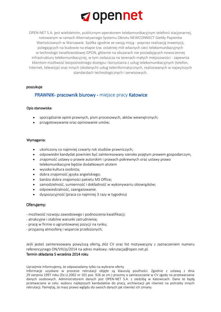 OPEN-NET S.A. jest wieloletnim, publicznym operatorem telekomunikacyjnym telefonii stacjonarnej, notowanym w ramach Alternatywnego Systemu Obrotu NEWCONNECT Giełdy Papierów Wartościowych w Warszawie. Spółka zgodnie ze swoją misją - poprzez realizację inwestycji, polegających na budowie na etapie tzw. ostatniej mili własnych sieci telekomunikacyjnych w technologii światłowodowej GPON, głównie na obszarach nie posiadających nowoczesnej infrastruktury telekomunikacyjnej, w tym zwłaszcza na terenach małych miejscowości - zapewnia klientom możliwość bezpośredniego dostępu i korzystania z usług telekomunikacyjnych (telefon, Internet, telewizja) oraz innych (dodanych) usług teleinformatycznych, realizowanych w najwyższych standardach technologicznych i serwisowych. poszukuje PRAWNIK- pracownik biurowy - miejsce pracy Katowice Opis stanowiska: sporządzanie opinii prawnych, pism procesowych, aktów wewnętrznych; przygotowywanie oraz opiniowanie umów; Wymagania: ukończony co najmniej czwarty rok studiów prawniczych; odpowiedni kandydat powinien być zainteresowany szeroko pojętym prawem gospodarczym, znajomość ustawy o prawie autorskim i prawach pokrewnych oraz ustawy prawo telekomunikacyjne będzie dodatkowym atutem wysoka kultura osobista; dobra znajomość języka angielskiego; bardzo dobra znajomości pakietu MS Office; samodzielność, sumienność i dokładność w wykonywaniu obowiązków; odpowiedzialność, zaangażowanie. dyspozycyjność (praca co najmniej 3 razy w tygodniu) Oferujemy: - możliwość rozwoju zawodowego i podnoszenia kwalifikacji; - atrakcyjne i stabilne warunki zatrudnienia; - pracę w firmie o ugruntowanej pozycji na rynku; - przyjazną atmosferę i wsparcie przełożonych; Jeśli jesteś zainteresowany powyższą ofertą, złóż CV oraz list motywacyjny z zaznaczeniem numeru referencyjnego ON/VIII/p/2014 na adres mailowy: [email protected]. Termin składania 5 września 2014 roku Uprzejmie informujemy, że odpowiadamy tylko na wybrane oferty. Informacje uzyskane w procesie rekrutacji objęte są klauzulą poufności. Zgodnie z ustawą z dnia 29 sierpnia 1997 roku (Dz.U.2002 nr 101 poz. 926 ze zm.) prosimy o zamieszczanie w CV zgody na przetwarzanie danych osobowych. Administratorem danych jest OPEN-NET S.A. z siedzibą w Katowicach. Dane te będą przetwarzane w celu: wyboru najlepszych kandydatów do pracy, archiwizacji jak również na potrzeby innych rekrutacji. Pamiętaj, że masz prawo wglądu do swoich danych jak również ich zmiany.