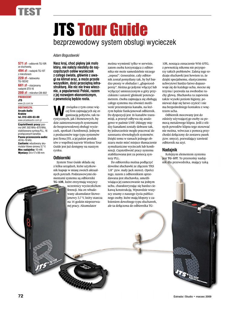 TEST JTS Tour Guide bezprzewodowy system obsugi wycieczek Adam Bogusawski 571 z – odbiornik TG-10R ze suchawk 494 z – nadajnik TG-10T z mikrofonem 220 z – adowarka TG-10CH2 681 z – stacjonarny nadajnik STX-16 200 z – mikrofon CM-802 PRODUCENT JTS www.jts.com.tw DOSTARCZY Arcade Audio Kraków tel. 012-420-63-00 www.arcadeaudio.com.pl Czstotliwo pracy: pasmo UHF, 502 MHz–870 MHz, stabilizowana syntez PLL, 16 przeczanych kanaów. Pasmo przenoszenia audio: 40 Hz–18 kHz. Zasilanie: wbudowany akumulator litowo-jonowy 3,7 V. Moc nadajnika: 10 mW. Wymiary: 54×17×99 mm Nasz kraj, cho pikny jak mao który, nie naley niestety do najczstszych celów wycieczek z caego wiata, gównie z uwagi na klimat oraz, a moe przede wszystkim, do przecitn infrastruktur. Ale nic nie trwa wiecznie, a popularno Polski, razem z jej rozwojem ekonomicznym, z pewnoci bdzie rosa. W związku z tym coraz więcej firm zajmujących się organizacją pobytów, tak turystycznych, jak i biznesowych, będzie zainteresowanych systemami do bezprzewodowej obsługi wycieczek, spotkań i konferencji. Jednym z producentów tego typu systemów jest firma JTS, a jej pakiet produktów o wspólnej nazwie Wireless Tour Guide jest już dostępny na naszym rynku. Odbiorniki System Tour Guide składa się z kilku urządzeń, które użytkownik kupuje w miarę swoich aktualnych potrzeb. Podstawowymi elementami systemu są odbiorniki TG-10R, które otrzymują wszyscy uczestnicy wycieczki/konferencji. Ma on wbudowany akumulator litowojonowy 3,7 V, który starcza na 14 godzin nieprzerwanej pracy. Akumulator 72 można wymienić tylko w serwisie, zatem osoba korzystająca z odbiornika nie może samodzielnie niczego „zepsuć”. Generalnie, cały odbiornik został pomyślany tak, by był bardzo prosty w obsłudze i „głupotoodporny”. Można go jedynie włączyć lub wyłączyć umieszczonym u góry przyciskiem i ustawić głośność potencjometrem. Osoba zajmująca się obsługą całego systemu ma również możliwość przestrojenia kanału, na którym będzie funkcjonował odbiornik. Do dyspozycji jest 16 kanałów transmisji, a przesył odbywa się analogowo w paśmie UHF. Odstępy między kanałami zostały dobrane tak, by jednocześnie mogło pracować do szesnastu równoległych systemów. Dzięki temu w ramach jednego obszaru może mieć miejsce tłumaczenie symultaniczne wycieczek lub konferencji. Częstotliwość pracy systemu stabilizowana jest za pomocą syntezy PLL. Do odbiornika można podłączyć dowolne słuchawki ze złączem TRS 1/8” (tzw. mały jack stereo). Oprócz tego, razem z odbiornikiem sprzedawana jest słuchawka, umożliwiająca jej zamocowanie na jednym uchu, charakteryzując się bardzo ciekawą konstrukcją. Wprawdzie wszyscy znamy z naszego życia publicznego osoby, które mają kłopoty z założeniem dowolnego typu słuchawek, ale ta dołączona do odbiornika TG- 10R, nosząca oznaczenie WM-10TG, z pewnością nikomu nie przysporzy takich problemów. Zaletą tego rodzaju słuchawki jest bowiem to, że dzięki specjalnemu, elastycznemu uchwytowi bardzo łatwo dopasowuje się do każdego ucha, mocno się trzyma i pozwala na swobodne ruchy głową. Słuchawka ta zapewnia także wysoki poziom higieny, ponieważ daje się łatwo czyścić i nie ma bezpośredniego kontaktu z wnętrzem ucha. Odbiornik mocowany jest do odzieży używającej go osoby za pomocą metalowego klipsu. Jeśli z różnych powodów klipsu tego stosować nie można, wówczas z pomocą przychodzi dołączony do zestawu pasek (tzw. smycz), pozwalający zawiesić odbiornik na szyi. Nadajnik Kolejnym elementem systemu jest TG-10T. To przenośny nadajnik dla przewodnika, mający taką Estrada i Studio • marzec 2009 System stacjonarny am gdzie w gr wchodzi praca w warunkach stacjonarnych (np. na sali konferencyjnej), a jednoczenie uytkownikowi zaley na zapewnieniu jak najlepszych parametrów transmisji i zwizanego z tym zasigu, tam mona zastosowa dwa inne elementy systemu Tour Guide. T Pierwszym z nich jest dwukanaowy, stacjonarny nadajnik TG-10STX, z duym wywietlaczem LED, wskanikami poziomu sygnau z obu kanaów i pynn regulacj ich poziomu. Zadbano równie o wyposaenie nadajnika w wyjcie suchawkowe z regulacj gonoci. Nadajnik taki ma wikszy zasig ni przypinany nadajnik TG-10T, pozwalajc obsuy wiksze obiekty, ze szczególnym ukierunkowaniem na sale konferencyjne. sam nadajnik ma też wbudowany mikrofon elektretowy. Model CM-501 to przypinany mikrofon lavalier o charakterystyce wszechkierunkowej. Dostępna jest też wersja tego mikrofonu o charakterystyce kierunkowej – CM-201. Jeśli wymagana jest bliższa odleod ust mówiącego, wówczas głość mikrofonu mik mikrof zaopatrzyć się w miniaturowy mikrowarto za opa wszechkierunkowy CM-802, pozwalający fon wsze chk na mocowanie mocow wan na uchu. Nadajnik obsługuje się podobnie jak odNadajn nik o biornik, p przy czym potencjometr głośności służy tu do rregulacji poziomu sygnału z miokazywało się, że najkrofonu. W praktyce p ustawić ten potencjometr na maklepiej jestt ust indywidualnym simum, pozostawiając pozo p użytkownikom użytkow wniko możliwość dobrania satysfakcjonującej fakcjonuj jące ich głośności odbioru. Nadajnik zasilany jest z takiego samego ogniwa, jaznajdziemy kie znajd dziem w każdym odbiorniku Tour wyjściowej 10 mW nadajGuide. Przy Prrzy mocy m pozwala nik pozw wala dotrzeć z sygnałem do odbiorsię w odległości maksyników znajdujących zn najd malnie e 50 metrów od niego. adowarka a TG-10SRX to jednokanaowy odbiornik pracujcy w trybie true diversity, który znajdzie zastosowanie np. tam gdzie wykorzystuje si nagonienie za pomoc systemów gonikowych lub odbiorcy przekazu korzystaj ze suchawek podczonych do jednego miejsca i nie przemieszczaj si. Zarówno odbiornik, jak i nadajnik mają styki wyprowadzone da w dolnej części korpusu, pozwalające na ładowanie akumulatolaj j są dwa rodzaje ładowarów. Do dyspozycji dysp d y p rek, w
