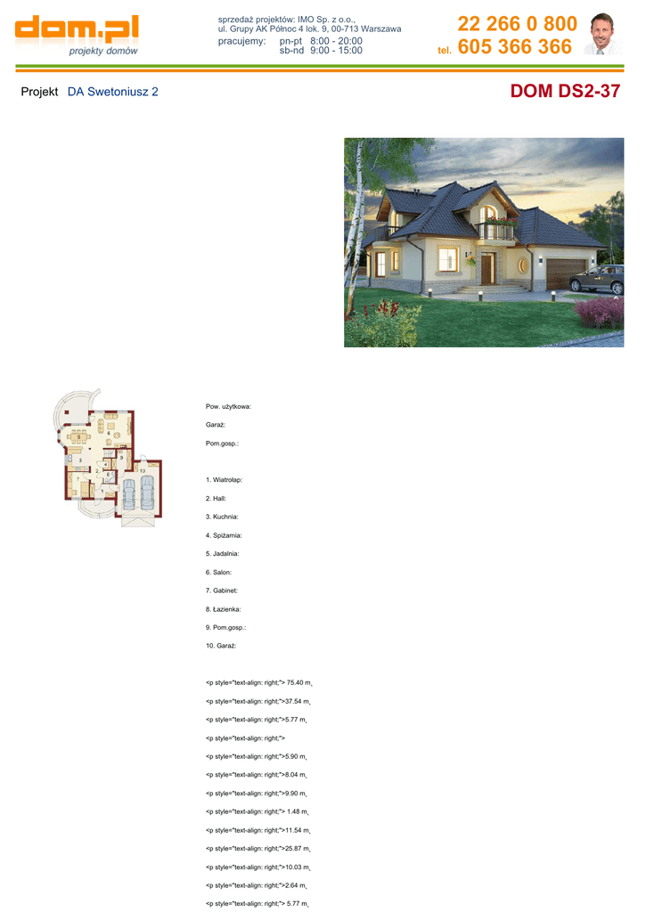 sprzedaż projektów: IMO Sp. z o.o., ul. Grupy AK Północ 4 lok. 9, 00-713 Warszawa pracujemy: pn-pt 8:00 - 20:00 sb-nd 9:00 - 15:00 22 266 0 800 tel. 605 366 366 DOM DS2-37 Projekt DA Swetoniusz 2 Pow. użytkowa: Garaż: Pom.gosp.: 1. Wiatrołap: 2. Hall: 3. Kuchnia: 4. Spiżarnia: 5. Jadalnia: 6. Salon: 7. Gabinet: 8. Łazienka: 9. Pom.gosp.: 10. Garaż: <p style="text-align: right;"> 75.40 m˛ <p style="text-align: right;">37.54 m˛ <p style="text-align: right;">5.77 m˛ <p style="text-align: right;"> <p style="text-align: right;">5.90 m˛ <p style="text-align: right;">8.04 m˛ <p style="text-align: right;">9.90 m˛ <p style="text-align: right;"> 1.48 m˛ <p style="text-align: right;">11.54 m˛ <p style="text-align: right;">25.87 m˛ <p style="text-align: right;">10.03 m˛ <p style="text-align: right;">2.64 m˛ <p style="text-align: right;"> 5.77 m˛ <p style="text-align: right;">37.54 m˛ Pow. użytkowa: 1. Hall: 2. Pokój: 3. Garderoba: 4. Pokój: 5. Pokój: 6. Łazienka: Informacje <p style="text-align: right;">71.51 m˛ Liczba pokoi: Pow. dachu: 5 267,29 m2 <p style="text-align: right;"> Typ zabudowy: z poddaszem 154,79 m2m˛ Pow. zabudowy: <p style="text-align: right;">5.10 145,60 m2 Pow. użytkowa: <p style="text-align: right;">18.02 m˛ 588,61 m3 Kubatura: 40,00 0m˛ Kąt nachylenia dachu: <p style="text-align: right;">5.56 21,28 m Min. szerokość działki: <p style="text-align: right;"> 12.44 m˛ Min. długość działki: 22,80 m 8,55 m m˛ Wysokość <pbudynku: style="text-align: right;">15.71 <p style="text-align: right;">14.68 m˛ Cena projektu: 2 200,00 zł Pokaż projekt w internecie DA Swetoniusz 2 - Dom jednorodzinny przeznaczony dla 4-5 osobowej rodzinny , o tradycyjnej bryle.Uniwersalna forma domu, pozwoli na wkomponowanie się w każde otoczenie.Parter to przede wszystkim otwarte, przestrzenne i słoneczne wnętrze. Działamy na rynku od 10 lat. Zaufało nam już kilkadziesiąt tysięcy osób.