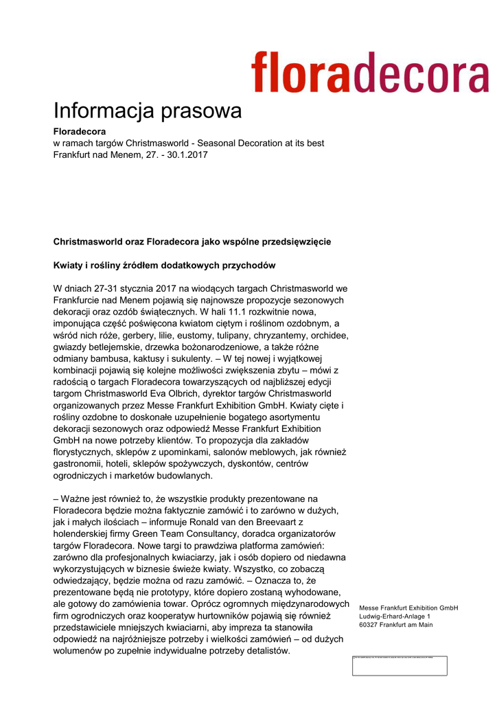 Informacja prasowa Floradecora w ramach targów Christmasworld - Seasonal Decoration at its best Frankfurt nad Menem, 27. - 30.1.2017 Christmasworld oraz Floradecora jako wspólne przedsięwzięcie Kwiaty i rośliny źródłem dodatkowych przychodów W dniach 27-31 stycznia 2017 na wiodących targach Christmasworld we Frankfurcie nad Menem pojawią się najnowsze propozycje sezonowych dekoracji oraz ozdób świątecznych. W hali 11.1 rozkwitnie nowa, imponująca część poświęcona kwiatom ciętym i roślinom ozdobnym, a wśród nich róże, gerbery, lilie, eustomy, tulipany, chryzantemy, orchidee, gwiazdy betlejemskie, drzewka bożonarodzeniowe, a także różne odmiany bambusa, kaktusy i sukulenty. – W tej nowej i wyjątkowej kombinacji pojawią się kolejne możliwości zwiększenia zbytu – mówi z radością o targach Floradecora towarzyszących od najbliższej edycji targom Christmasworld Eva Olbrich, dyrektor targów Christmasworld organizowanych przez Messe Frankfurt Exhibition GmbH. Kwiaty cięte i rośliny ozdobne to doskonałe uzupełnienie bogatego asortymentu dekoracji sezonowych oraz odpowiedź Messe Frankfurt Exhibition GmbH na nowe potrzeby klientów. To propozycja dla zakładów florystycznych, sklepów z upominkami, salonów meblowych, jak również gastronomii, hoteli, sklepów spożywczych, dyskontów, centrów ogrodniczych i marketów budowlanych. – Ważne jest również to, że wszystkie produkty prezentowane na Floradecora będzie można faktycznie zamówić i to zarówno w dużych, jak i małych ilościach – informuje Ronald van den Breevaart z holenderskiej firmy Green Team Consultancy, doradca organizatorów targów Floradecora. Nowe targi to prawdziwa platforma zamówień: zarówno dla profesjonalnych kwiaciarzy, jak i osób dopiero od niedawna wykorzystujących w biznesie świeże kwiaty. Wszystko, co zobaczą odwiedzający, będzie można od razu zamówić. – Oznacza to, że prezentowane będą nie prototypy, które dopiero zostaną wyhodowane, ale gotowy do zamówienia towar. Oprócz ogromnych międzynarodowych firm ogrodniczych oraz kooperatyw hurtowników pojawią się również przedstawiciele mniejszych kwiaciarni, aby impreza ta stanowiła odpowiedź na najróżniejsze potrzeby i wielkości zamówień – od dużych wolumenów po zupełnie indywidualne potrzeby detalistów. Messe Frankfurt Exhibition GmbH Ludwig-Erhard-Anlage 1 60327 Frankfurt am Main Kwiaty i rośliny ozdobne będą zaprezentowane w innowacyjnej aranżacji z przodu hali 11.1, co ułatwi kupującym dokonanie wyboru. I tak na przykład kwiaty cięte, takie jak czerwone róże od różnych producentów zaprezentowane zostaną dla porównania na specjalnych stołach wystawienniczych. W kolejnym kroku możliwe będzie złożenie zamówienia bezpośrednio u producenta: w razie potrzeby będzie można zamówić gotowe wózki wypełnione kwiatami, które można po prostu wstawić do sklepu i od razu zacząć sprzedaż. Wystawcy podzielą się również swoją fachową wiedzą oraz pokażą, w jaki sposób pielęgnować i obchodzić się ze świeżymi kwiatami i roślinami ozdobnymi. – Żaden kupujący nie pozostanie sam z tym nowym asortymentem, z przyjemnością pomożemy i udzielimy kilku wskazówek na temat wykorzystania go w swojej działalności – podkreśla van den Breevaart. – Handel świeżymi kwiatami i roślinami ozdobnymi jest bowiem mniej skomplikowany niż się uważa, także dzięki innowacyjnym sposobom aranżacji kwiatowego asortymentu w sprzedaży detalicznej. Natura działa: wszystko zależy od pomysłu Według niego idea wprowadzenia świeżych kwiatów i roślin ozdobnych jako uzupełnienia i rozszerzenia bogatej oferty dekoracji na targach Christmasworld jest naprawdę trafiona i stanowi odpowiedź na aktualne trendy. – Kwiaty i rośliny ozdobne to od dawna nieodłączna część świątecznych dekoracji, a także coś, co na co dzień towarzyszy dzisiejszym konsumentom. To one stanowią zapowiedź kolejnych pór roku, zdobią stolik śniadaniowy, upiększają salon, a także dodają uroku mniejszym i większym sklepom – wyjaśnia van den Breevaart. Kwiaty i rośliny ozdobne to jednak dużo więcej: Zieleń jest teraz w modzie. Naturalność to powszechnie obowiązujący trend, któremu należy się przyjrzeć: prosty i nieskomplikowany. Dzisiejszy klient bardziej niż kiedykolwiek pragnie pięknych artykułów dekoracyjnych, które nie wymagają dużego nakładu pracy. Konsumenci lubią rzeczy zaskakujące, ale i proste. Jak duży potencjał tkwi w połączeniu elementów dekoracyjnych i kwiatowych, widać na licznych, choć bardzo różnych przykładach: Tuż przed Mistrzostwami Europy w Piłce Nożnej firma ogrodnicza Löwer spod Frankfurtu włączyła do swojej oferty ozdobną misę obsadzoną kwiatami w kolorach niemieckiej flagi – uroczy prezent i element dekoracyjny, łatwy w transporcie. Takie pomysły budzą pozytywne emocje, a nawet zachwyt klientów, zachęcając ich do kolejnych zakupów. Coraz więcej dyskontów stawia też na poręczne upominki, takie jak gotowe bukiety. – I to z coraz większym powodzeniem – potwierdza Britta Tröster, menedżer działu kwiatów i roślin ozdobnych w firmie Agrarmarkt Informations-Gesellschaft mbH (AMI). Naprzeciw klientom wychodzą również Blume 2000 oraz meblowy gigant Ikea: w ich sklepach kupić można gotowe aranżacje kwiatowe. Wszystko dla wygody klienta. Właśnie tak będzie również na nowych targach Floradecora, gdzie od 27 do 30 stycznia 2017 w hali 11.1 będzie można nabyć świeże kwiaty i rośliny ozdobne. Floradecora w ramach targów Christmasworld, Seasonal Decoration at its best Frankfurt nad Menem, 27. - 2017-01-30 Frankfurt nad Menem, Wskazówka dla dziennikarzy: Więcej informacji oraz zdjęcia w wysokiej rozdzielczości na stronie: christmasworld.messefrankfurt.com oraz floradecora.messefrankfurt.com Strona 2 Targi Frankfurt Przedstawicielstwo w Polsce ul. Bohdanowicza 21 