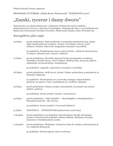 Wędrowniczek Junior zaprasza PROGRAM AUTORSKI „Małej Sceny Plastycznej” "KAMIANNA 2010" „Zamki, rycerze i damy dworu” Zapraszamy na zajęcia plastyczne w klimacie średniowiecznych zamków, nieustraszonych rycerzy i odważnych białogłów, obalających mity o swej delikatności. Będą nam towarzyszyć turnieje rycerskie, zdobywanie zamku, tańce dworskie itp. Szczegółowy plan zajęć 26 lipiec przed południem: Wprowadzenie w tematykę średniowieczną, pokaz zdjęć najokazalszych zamków, strojów rycerskich, mieczy, tarcz, hełmów, herbów rodowych, fragmenty turniejów rycerskich. po południu: Projektujemy nasze rodowe herby, z których skorzystamy w trakcie robienia tarcz, mieczy i hełmów. 27 lipiec przed południem: Rysunki odręczne herbu przenosimy na tekturę, określamy kształt tarczy, zbroi i hełmu. Robimy klej, moczymy płótno, nakładamy na konstrukcję i modelujemy. po południu: Legendy i opowieści o tematyce rycerskiej. 28 lipiec przed południem: Jeśli tarcze, zbroje i hełmy podeschną, pomalujemy je farbami i lakierem. po południu: Wychodzimy na wycieczkę szukając odpowiednich patyków na miecze i łuki, modelujemy je, rzeźbimy rękojeść. 29 lipiec przed południem: Pokazy strojów niewieścich, wycinanie wg wykroi sukien i peleryn. po południu: Szycie strojów ręcznie i maszynowo. 30 lipiec przed południem : Haft inicjałów – dla białogłów, metaloplastyka z blaszanych puszek - dla rycerzy. po południu: Szycie strojów i tworzenie biżuterii 31 lipiec NIEDZIELA – ODPOCZYNEK (planowana wycieczka) 1 sierpień przed południem i po południu: Konstruujemy fasadę obronnego zamku z kartonowych pudełek i tektury falistej. Malujemy iluzyjne kamienie w fundamentach zamku. 2 sierpień przed południem: Malujemy witrażowe okna do zamku, umieszczamy je we wnękach okiennych po południu: Konstruujemy most zwodzony. 3 sierpień przed południem: Robimy smoka z papieru – stałego bywalca zamków i postrachu dam dworu. po południu: Oglądamy film fabularny o czasach średniowiecznych. 4 sierpień przed południem: Malujemy smoka i umieszczamy go pod zamkiem po południu: Ostatnie poprawki krawieckie strojów średniowiecznych 5 sierpień Ostatnie przygotowania do wernisażu. Tańczymy przy muzyce średniowiecznej 6 sierpień WERNISAŻ * Autorka programu Wiesława Dittwald zastrzega sobie prawo niewielkich zmian jak również niespodzianek w programie