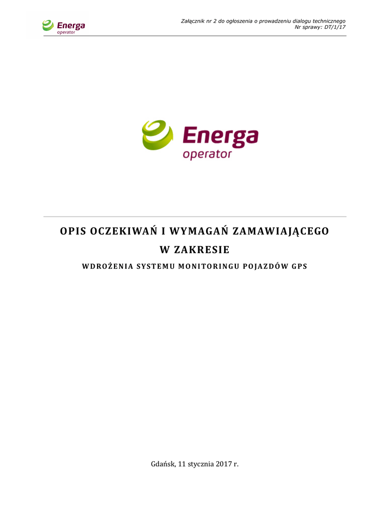 Załącznik nr 2 do ogłoszenia o prowadzeniu dialogu technicznego Nr sprawy: DT/1/17 OPIS OCZEKIWAŃ I WYMAGAŃ ZAMAWIAJĄCEGO W ZAKRESIE W D RO Ż E N I A S Y S T E M U M O N I TO R I N G U P O JA Z D Ó W G P S Gdańsk, 11 stycznia 2017 r. Załącznik nr 2. do ogłoszenia o prowadzeniu dialogu technicznego Nr sprawy: DT/1/14 SPIS TREŚCI Podstawowe informacje .............................................................................................................................................................. 3 Zakres planowanego wdrożenia .............................................................................................................................................. 3 Wymagania dla systemu monitoringu pojazdów ............................................................................................................. 4 1. 2. 3. System monitoringu GPS .............................................................................................................................................. 4 1.1. Informacje podstawowe ..................................................................................................................................... 4 1.2. Wymagania funkcjonalne ................................................................................................................................... 4 1.3. Wymagania niefunkcjonalne ............................................................................................................................. 9 1.4. Wymagania dotyczące bezpieczeństwa i ochrony danych osobowych ........................................ 10 Urządzenia GPS w pojazdach ....................................................................................................................................10 2.1. Informacje podstawowe .................................................................................................................................. 10 2.2. Wymagania dotyczące urządzeń GPS i ich montażu w pojazdach.................................................. 11 2.3. Wymagania funkcjonalne oprogramowania urządzeń ....................................................................... 12 Integracja z systemami Zamawiającego...............................................................................................................13 3.1. Integracja z systemem PasCom Flota II ..................................................................................................... 13 3.2. Integracja z systemem SKD (System Kontroli Dostępu)..................................................................... 15 Inne wymagania ...........................................................................................................................................................................15 1. Instruktaż w zakresie obsługi i administrowania systemem ......................................................................15 2. Dokumentacja .................................................................................................................................................................16 3. Gwarancja .........................................................................................................................................................................16 4. Wsparcie techniczne ....................................................................................................................................................16 Załącznik nr 2 do ogłoszenia o prowadzeniu dialogu technicznego Nr sprawy: DT/1/17 PODSTAWOWE INFORMACJE ENERGA-OPERATOR SA w najbliższym czasie planuje wszcząć postępowanie na podstawie przepisów ustawy z dnia 29 stycznia 2004 r. – Prawo zamówień publicznych, którego przedmiotem będzie dostawa, montaż, konfiguracja i uruchomienie systemu umożliwiającego prowadzenie w czasie rzeczywistym monitoringu pojazdów przy wykorzystaniu technologii GPS. Celem niniejszego dokumentu jest przedstawienie podstawowych założeń Zamawiającego, co do przedmiotu planowanego postępowania. Zamawiający nie wyklucza, że w trakcie prowadzonego dialogu technicznego, zostaną opracowane bardziej szczegółowe dokumenty, które będą przekazywane uczestnikom i analizowane z nimi. ZAKRES PLANOWANEGO WDROŻENIA • Dostarczony i wdrożony przez wykonawcę system monitorowania pojazdów GPS, powinien umożliwić Zamawiającemu w czasie rzeczywistym kontrolę lokalizacji i monitorowanie parametrów pojazdów. Wdrożony system powinien umożliwić Zamawiającemu monitorowanie do 2000 pojazdów. Pozyskane z pojazdów dane, powinny być prezentowane na mapach cyfrowych i powinny umożliwiać m.in. wizualizację na mapie przebytej trasy wraz z informacją o prędkości jazdy, postojach oraz szczegółowych danych związanych z konkretną lokalizacją. • Zamawiający będzie wymagał, aby system monitorowania pojazdów GPS był zainstalowany na infrastrukturze IT znajdującej się w ENERGA-OPERATOR SA. Zamawiający nie dopuszcza możliwości funkcjonowania tego systemu w oparciu o jakąkolwiek infrastrukturę informatyczną znajdującą się poza ENERGA-OPERATOR SA. • Zamawiający zakłada, że wdrożony system będzie integrowany z istniejącymi u niego systemami, w tym w szczególności z systemem kontroli dostępu SKD oraz z systemem PasCom Flota II; • Dane o pojazdach, w tym o ich lokalizacji GPS, parametrach pojazdu i kierowcy, będą pozyskiwane do systemu monitorowania pojazdów GPS przy użyciu zamontowanych w pojazdach urządzeń GPS, które będą odczytywać i przesyłać dane geolokalizacyjne oraz dane pozyskane z komputera pokładowego samochodu (przy wykorzystaniu szyny CAN pojazdu w przypadku jej występowania) oraz z dodatkowych czujników zamontowanych w pojazdach. Zebrane informacje będą na bieżąco wysyłane do serwerów systemu monitorowania pojazdów GPS za pomocą sieci GSM. Strona 3 z 20 Załącznik nr 2 do ogłoszenia o prowadzeniu dialo
