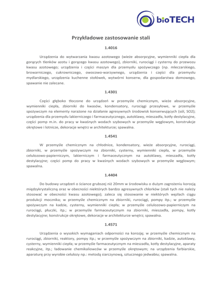 Przykładowe zastosowanie stali 1.4016 Urządzenia do wytwarzania kwasu azotowego (wieże absorpcyjne, wymienniki ciepła dla gorących tlenków azotu i gorącego kwasu azotowego), zbiorniki, rurociągi i cysterny do przewozu kwasu azotowego; urządzenia i części maszyn dla przemysłu spożywczego (np. mleczarskiego, browarniczego, cukrowniczego, owocowo-warzywnego, urządzenia i części dla przemysłu mydlarskiego, urządzenia kuchenne stołówek, wytwórni konserw, dla gospodarstwa domowego, spawanie nie zalecane. 1.4301 Części głęboko tłoczone do urządzeń w przemyśle chemicznym, wieże absorpcyjne, wymienniki ciepła, zbiorniki do kwasów, kondensatory, rurociągi przesyłowe, w przemyśle spożywczym na elementy narażone na działanie agresywnych środowisk konserwujących (sól, SO2); urządzenia dla przemysłu lakierniczego i farmaceutycznego, autoklawy, mieszadła, kotły destylacyjne, części pomp m.in. do pracy w kwaśnych wodach szybowych w przemyśle węglowym, konstrukcje okrętowe i lotnicze, dekoracje wnętrz w architekturze; spawalna. 1.4541 W przemyśle chemicznym na chłodnice, kondensatory, wieże absorpcyjne, rurociągi, zbiorniki, w przemyśle spożywczym na zbiorniki, cysterny, wymienniki ciepła, w przemyśle celulozowo-papierniczym, lakierniczym i farmaceutycznym na autoklawy, mieszadła, kotły destylacyjne; części pomp do pracy w kwaśnych wodach szybowych w przemyśle węglowym; spawalna. 1.4404 Do budowy urządzeń o ściance grubszej niż 20mm w środowisku o dużym zagrożeniu korozją międzykrystaliczną oraz w obecności niektórych bardzo agresywnych chlorków (stali tych nie należy stosować w obecności kwasu azotowego); zaleca się stosowanie w niektórych węzłach ciągu produkcji mocznika; w przemyśle chemicznym na zbiorniki, rurociągi, pompy itp.; w przemyśle spożywczym na kadzie, cysterny, wymienniki ciepła; w przemyśle celulozowo-papierniczym na rurociągi, płuczki, itp.; w przemyśle farmaceutycznym na zbiorniki, mieszadła, pompy, kotły destylacyjne; konstrukcje okrętowe, dekoracje w architekturze wnętrz; spawalna. 1.4571 Urządzenia o wysokich wymaganiach odporności na korozję; w przemyśle chemicznym na rurociągi, zbiorniki, reaktory, pompy itp.; w przemyśle spożywczym na zbiorniki, kadzie, autoklawy, cysterny, wymienniki ciepła; w przemyśle farmaceutycznym na mieszadła, kotły destylacyjne, aparaty reakcyjne, itp.; ładowanie chemikaliowców w przemyśle okrętowym; na urządzenia farbiarskie, aparaturę przy wyrobie celulozy np.: metodą siarczynową, sztucznego jedwabiu; spawalna.