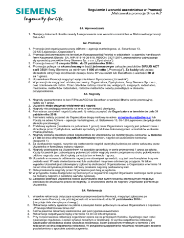 Regulamin i warunki uczestnictwa w Promocji „Mistrzowska promocja Sirius Act” &1. Wprowadzenie 1. Niniejszy dokument określa zasady funkcjonowania oraz warunki uczestnictwa w Mistrzowskiej promocji Sirius Act &2. Promocja 1. Promocja jest organizowana przez ADhere – agencja marketingowa, ul. Sielankowa 13, 05-120 Legionowo („Organizator”). 2. Promocja jest prowadzona na terytorium Rzeczpospolitej Polskiej w oddziałach i u agentów handlowych firmy Kaczmarek Electric SA, NIP: 915-16-26-618, REGON: 932712874, przedsiębiorcy zajmującego się sprzedażą produktów firmy Siemens Sp. z o.o. („Dystrybutor”). 3. Promocja trwa od 18 sierpnia 2016r. do 21 października 2016 r. 4. Promocja polega na skumulowanym bądź jednorazowym zakupie produktów SIRIUS ACT serii 3SU1 firmy Siemens za minimum 1 000 zł netto („Promocja”). Za każdy taki zakup Uczestnik otrzymuje możliwość zakupu bonu RTVeuroAGD lub Decathlon o wartości 50 zł za 1 grosz. 5. Uczestnikami Promocji mogą być wyłącznie klienci Dystrybutora („Uczestnik”). 6. W promocji nie mogą brać udziału pracownicy: Organizatora, Dystrybutora, firmy Siemens Sp. z o.o., oraz członkowie ich rodzin. Przez członków rodziny rozumie się: wstępnych, zstępnych, rodzeństwo, małżonków, małżonków rodzeństwa, rodziców małżonków i osoby pozostające w stosunku przysposobienia. &3. Nagrody 1. Nagrody gwarantowane to bon RTVeuroAGD lub Decathlon o wartości 50 zł w cenie promocyjnej, każdy po 1 grosz. 2. Uczestnik może otrzymać wielokrotność nagród. 3. Nagrody nie podlegają wymianie na inne, w tym wartość pieniężną. 4. Formularze zamówień nagród (załącznik 1) należy przysyłać do Organizatora w terminie do dnia 31 października 2016. 5. Formularz należy przesłać do Organizatora drogą mailową na adres [email protected] lub Pocztą na adres ADhere – agencja marketingowa, ul. Sielankowa 13, 05-120 Legionowo (decyduje data stempla pocztowego) 6. Podstawą wydania (przesłania za pobraniem 1 grosz) przez Organizatora nagrody jest potwierdzenie i akceptacja przez Dystrybutora, wartości sprzedaży produktów dokonanej przez uczestników w okresie trwania promocji. 7. Nagrody zostaną przesłane przez Organizatora do Uczestników po rozstrzygnięciu konkursu, w terminie 21 dni od dnia otrzymania wszystkich formularzy wyboru nagród od uczestników konkursu (załącznik 1). 8. Za przekazanie nagród, rozumie się dostarczenie nagród przesyłką kurierską na adres wskazany przez Uczestnika w formularzu wyboru nagrody. 9. Nagrody przekazane są Uczestnikowi na zasadzie sprzedaży w cenie promocyjnej 1 grosz za sztukę. Każdy Uczestnik jest zobowiązany potwierdzić odbiór nagrody swoim podpisem na druku pokwitowania odbioru nagrody oraz uiścić opłatę za każdy bon w kwocie 1 grosz. 10. Uczestnik w momencie odbierania nagrody ma obowiązek sprawdzić, czy jest ona kompletna i czy nie posiada wad. W razie stwierdzenia wad lub uszkodzeń ma prawo odmówić jej przyjęcia. W takim wypadku Uczestnik jest zobowiązany zgłosić tę okoliczność Organizatorowi, a Organizator w terminie 14 dni od dnia otrzymania protokołu odmowy przekaże nagrodę pozbawioną wad. 11. Data przekazania nagrody przez Organizatora jest datą jej wydania. 12. W przypadku braku dostępności wymienionych w regulaminie nagród Organizator zastrzega sobie prawo do zamiany nagrody o podobnej wartości rynkowej. 13. Zaległości płatnicze Uczestnika wobec Dystrybutora oraz zwroty towarów promocyjnych mogą być podstawą do anulowania prawa do nagrody. O anulowaniu prawa do nagrody Organizator poinformuje Uczestnika. &4. Reklamacje 1. 2. 3. 4. 5. Wszelkie reklamacje dotyczące sposobu przeprowadzenia Promocji, mogą być zgłaszane po zakończeniu Promocji, nie później jednak niż w terminie do dnia 31 października 2016 r. (decyduje data stempla pocztowego). Reklamacje należy zgłaszać na piśmie i przesyłać listem poleconym na adres Organizatora z dopiskiem „Promocja Mistrzowska Sirius Act” Forma pisemna reklamacji zastrzeżona jest pod rygorem nieważności. Reklamacje rozpatrywane będą w terminie 14 dni od ich otrzymania. Przy rozpoznawaniu reklamacji organizator opiera się na przepisach Kodeksu Cywilnego oraz treści niniejszego regulaminu i opisie sytuacji zawartym w reklamacji. O wyniku rozpatrzenia reklamacji Organizator zawiadamia osobę wnoszącą reklamację, listem poleconym wysłanym w terminie 7 dni roboczych od dnia rozpatrzenia reklamacji. W przypadku uwzględnienia reklamacji reklamujący zostanie powiadomiony o sposobie zadośćuczynienia. &5. Odpowiedzialność Organizatora 1. Odpowiedzialność finansowa Organizatora wobec Uczestnika ograniczona jest do wartości i liczb Nagród określonych w Regulaminie. 2. Organizator nie ponosi odpowiedzialności za wady fizyczne Nagród. 3. Reklamacje złożone po terminie określonym w regulaminie nie będą rozpatrywane. &6. Postanowienia końcowe 1. 2. 3. 4. 5. Wszelkie spory wynikłe z tytułu wykonania zobowiązań związanych z niniejszą Promocją będą rozstrzygane przez sąd miejscowo właściwy dla siedziby Organizatora. Skierowanie przez Uczestnika sprawy na drogę postępowania sądowego jest dopuszczalne po wyczerpaniu procedury reklamacyjnej. W kwestiach nieuregulowanych niniejszymi Warunkami Uczestnictwa stosuje się przepisy Kodeksu Cywilnego. Tekst niniejszego Regulaminu dostępny jest w siedzibie Organizatora. Postanowienia niniejszych Warunków Uczestnictwa stanowią wyłączną podstawę do prowadzenia Promocji, a ich wykładnia i interpretacja zależy wyłącznie od Organizatora. Wszelkie materiały promocyjno-reklamowe mają wyłącznie charakter informacyjny. Ewentualnie prezentowany wizerunek Nagród przedstawiony w materiałach reklamowych może odbiegać od ich rzeczywistego wyglądu. Jakiekolwiek uprawnienia Uczestnika wynikające z niniejszego Regulaminu nie podlegają przeniesieniu na osoby trzecie. ORGANIZATOR