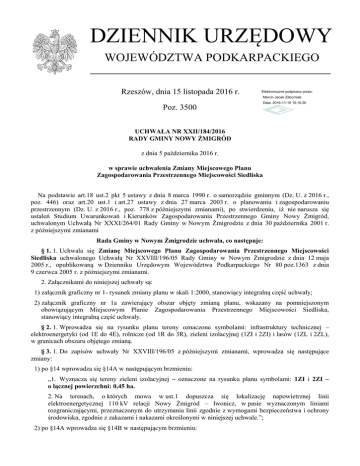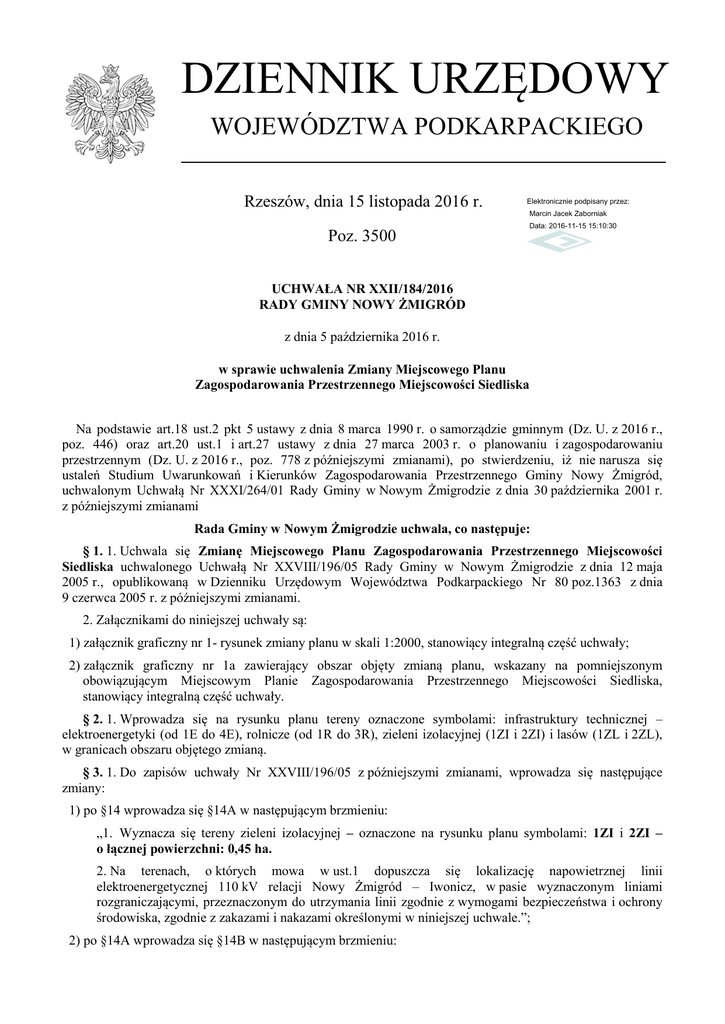 DZIENNIK URZĘDOWY WOJEWÓDZTWA PODKARPACKIEGO Rzeszów, dnia 15 listopada 2016 r. Elektronicznie podpisany przez: Marcin Jacek Zaborniak Poz. 3500 Data: 2016-11-15 15:10:30 UCHWAŁA NR XXII/184/2016 RADY GMINY NOWY ŻMIGRÓD z dnia 5 października 2016 r. w sprawie uchwalenia Zmiany Miejscowego Planu Zagospodarowania Przestrzennego Miejscowości Siedliska Na podstawie art.18 ust.2 pkt 5 ustawy z dnia 8 marca 1990 r. o samorządzie gminnym (Dz. U. z 2016 r., poz. 446) oraz art.20 ust.1 i art.27 ustawy z dnia 27 marca 2003 r. o planowaniu i zagospodarowaniu przestrzennym (Dz. U. z 2016 r., poz. 778 z późniejszymi zmianami), po stwierdzeniu, iż nie narusza się ustaleń Studium Uwarunkowań i Kierunków Zagospodarowania Przestrzennego Gminy Nowy Żmigród, uchwalonym Uchwałą Nr XXXI/264/01 Rady Gminy w Nowym Żmigrodzie z dnia 30 października 2001 r. z późniejszymi zmianami Rada Gminy w Nowym Żmigrodzie uchwala, co następuje: § 1. 1. Uchwala się Zmianę Miejscowego Planu Zagospodarowania Przestrzennego Miejscowości Siedliska uchwalonego Uchwałą Nr XXVIII/196/05 Rady Gminy w Nowym Żmigrodzie z dnia 12 maja 2005 r., opublikowaną w Dzienniku Urzędowym Województwa Podkarpackiego Nr 80 poz.1363 z dnia 9 czerwca 2005 r. z późniejszymi zmianami. 2. Załącznikami do niniejszej uchwały są: 1) załącznik graficzny nr 1- rysunek zmiany planu w skali 1:2000, stanowiący integralną część uchwały; 2) załącznik graficzny nr 1a zawierający obszar objęty zmianą planu, wskazany na pomniejszonym obowiązującym Miejscowym Planie Zagospodarowania Przestrzennego Miejscowości Siedliska, stanowiący integralną część uchwały. § 2. 1. Wprowadza się na rysunku planu tereny oznaczone symbolami: infrastruktury technicznej – elektroenergetyki (od 1E do 4E), rolnicze (od 1R do 3R), zieleni izolacyjnej (1ZI i 2ZI) i lasów (1ZL i 2ZL), w granicach obszaru objętego zmianą. § 3. 1. Do zapisów uchwały Nr XXVIII/196/05 z późniejszymi zmianami, wprowadza się następujące zmiany: 1) po §14 wprowadza się §14A w następującym brzmieniu: „1. Wyznacza się tereny zieleni izolacyjnej – oznaczone na rysunku planu symbolami: 1ZI i 2ZI – o łącznej powierzchni: 0,45 ha. 2. Na terenach, o których mowa w ust.1 dopuszcza się lokalizację napowietrznej linii elektroenergetycznej 110 kV relacji Nowy Żmigród – Iwonicz, w pasie wyznaczonym liniami rozgraniczającymi, przeznaczonym do utrzymania linii zgodnie z wymogami bezpieczeństwa i ochrony środowiska, zgodnie z zakazami i nakazami określonymi w niniejszej uchwale.”; 2) po §14A wprowadza się §14B w następującym brzmieniu: Dziennik Urzędowy Województwa Podkarpackiego –2– Poz. 3500 „1. Wyznacza się tereny lasów – oznaczone na rysunku planu symbolami: 1ZL i 2ZL – o łącznej powierzchni: 0,40 ha.”; 3) po §16 wprowadza się §16A w następującym brzmieniu: „1. Wyznacza się tereny rolnicze – oznaczone na rysunku planu symbolami: 1R, 2R i 3R – o łącznej powierzchni: 4,41 ha. 2. Na terenach, o których mowa w ust.1 dopuszcza się lokalizację napowietrznej linii elektroenergetycznej 110 kV relacji Nowy Żmigród – Iwonicz, w pasie wyznaczonym liniami rozgraniczającymi, przeznaczonym do utrzymania linii zgodnie z wymogami bezpieczeństwa i ochrony środowiska, zgodnie z zakazami i nakazami określonymi w niniejszej uchwale.”; 4) po §16A wprowadza się §16B w następującym brzmieniu: „1. Wyznacza się tereny infrastruktury technicznej - elektroenergetyki – oznaczone na rysunku planu symbolami: 1E, 2E, 3E i 4E – o łącznej powierzchni: 0,12 ha, przeznaczone pod słupy, obiekty i urządzenia związane z przebiegiem napowietrznej linii elektroenergetycznej 110 kV. 2. Na terenach, o których mowa w ust.1 dopuszcza się możliwość skablowania odcinków linii elektroenergetycznych. 3. Udział powierzchni biologicznie czynnej nie mniejszy niż 10% powierzchni każdego terenu, o którym mowa w ust.1.”; 5) §19 otrzymuje brzmienie: „1. Ustala się jednorazową opłatę od wzrostu wartości nieruchomości w wysokości 0%, z zastrzeżeniem ust.2. 2. Ustala się jednorazową opłatę od wzrostu wartości nieruchomości dla terenów oznaczonych symbolami: 1ZI, 2ZI, 1ZL, 2ZL, 1R, 2R, 3R, 1E, 2E, 3E i 4E, w wysokości 30%.”. § 4. 1. Wykonanie uchwały powierza się Wójtowi Gminy Nowy Żmigród. § 5. 1. Uchwała podlega ogłoszeniu w Dzienniku Urzędowym Województwa Podkarpackiego i wchodzi w życie po upływie 14 dni od dnia jej ogłoszenia. Przewodniczący Rady Gminy Piotr Suski Dziennik Urzędowy Województwa Podkarpackiego –3– Poz. 3500 Dziennik Urzędowy Województwa Podkarpackiego –4– Poz. 3500
