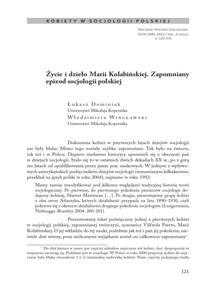 k o b i e t y w s o c j o l o g ii p o l s k i e j Roczniki Historii Socjologii ISSN 2084-2031 • Vol. II (2012) s. 121-131 Życie i dzieło Marii Kolabińskiej. Zapomniany epizod socjologii polskiej Łukasz Dominiak Uniwersytet Mikołaja Kopernika W ł o d z i m i e r z Wi n c ł aw s k i Uniwersytet Mikołaja Kopernika Dokonania kobiet w pierwszych latach dziejów socjologii nie były błahe. Mimo tego zostały szybko zapomniane. Tak było na świecie, tak też i w Polsce. Dopiero niedawno historycy upomnieli się o obecność pań w dziejach socjologii. Stało się to w ostatnich dwóch dekadach XX w., po z górą stu latach od opublikowania przez panie prac naukowych. W jednym z wpływowych amerykańskich podręczników dziejów socjologii (wznawianym kilkakrotnie; przekład na język polski w roku 2004), napisano w roku 1992: Mamy zamiar zmodyfikować pod kilkoma względami tradycyjną historię teorii socjologicznej. Po pierwsze, do pierwszego pokolenia pionierów socjologii dodajemy kobietę, Harriet Martineau […]. Po drugie, prezentujemy grupę kobiet z obu stron Atlantyku, których działalność przypada na lata 1890–1930, czyli pokrywa się z okresem działalności drugiego pokolenia socjologów. (Lengermann, Niebrugge-Brantley 2004: 200-201) Prezentowany tekst poświęcamy jednej z pierwszych kobiet w socjologii polskiej, zapomnianej twórczyni, uczennicy Vilfreda Pareto, Marii Kolabińskiej. O jej wkładzie do tej nauki, podobnie jak też i pań jej pokolenia, niewiele dziś wiemy, poza nielicznymi wyjątkami został on całkowicie zapomniany1. 1 Do dziś kariera w nauce jest częściej udziałem mężczyzn niż kobiet, choć dysproporcje te stopniowo zacierają się. Podobnie jest w socjologii. W Polsce w roku 2000 proporcja kobiet do mężczyzn była bliska stosunkowi 1:1 (z minimalną nadwyżką kobiet). Panie częściej podejmują studia 121 Łukasz Dominiak, Włodzimierz Wincławski Pierwsze kobiety w socjologii polskiej Za pierwszego socjologa polskiego uważa się Józefa Supińskiego (1804–1893), który powracając w roku 1844 z długoletniego pobytu na emigracji, przywiózł z Paryża do kraju ideę tej nowej nauki. W 16 lat później wydał książkę Myśl ogólna fizjologii powszechnej, która powstała dzięki zapoznaniu się z dziełem „głębokiego Comte`a” (Supiński 1860: 54). Wydana w tym samym roku monografia pióra Ludwika Górskiego (1818–1908) Uwagi nad obecnym stanem robotników wiejskich w Królestwie Polskim, inspirowana z kolei przez drugiego Francuza, Frédèrica Le Play’a, zapoczątkowała, wespół z dziełem Supińskiego, socjologię w Polsce. Wśród osób urodzonych w pierwszych trzech dekadach XIX stulecia 32 osoby podjęły problematykę socjologiczną. Byli to sami mężczyźni. Pisali książki, artykuły, doniesienia z badań terenowych, recenzje, dokonywali przekładów z obcego piśmiennictwa. Większość z nich tworzyła już w pierwszym okresie dziejów socjologii polskiej, od roku 1860 do 1887 (od prac Supińskiego i Górskiego do Systemu socjologii Gumplowicza)2. W kolejnych dwóch dekadach, w latach 1840–1859, było już 99 twórców na polu socjologii. Pojawiły się po raz pierwszy kobiety, których udział w tej zbiorowości był bardzo skromny, były to zaledwie 4 panie3. Twórczość dwóch przypadła na pierwsze ćwierćwiecze socjologii polskiej. Eliza Orzeszkowa (1841–1910) recenzowała w roku 1866 polskie wydanie Historii cywilizacji angielskiej Henri T. Buckle’a, zaś Aleksandra Bąkowska (1851–1926) przełożyła w roku 1887 na język polski Ancient Society Lewisa H. Morgana. Trzecia z tego pokolenia, Felicja Nossig-Próchnikowa (1855–1939), ogłaszała prace socjologiczne dopiero w ostatniej dekadzie XIX stulecia (miała ponad 40 lat), a twórczość socjologiczna czwartej, Cecylii Walewskiej (1859–1940), przypada dopiero na pierwsze lata Drugiej Rzeczypospolitej (w roku 1919 ukończyła 60 lat). Pierwszą kobietą w socjologii polskiej była Orzeszkowa. Po ukończeniu pensji dla panien, rodzice wydali ją za mąż (miała 16 lat). Zdobywała wyższe oraz mają przewagę liczebną nad mężczyznami w chwili kończenia studiów. W roku 2000 na jedną studentkę przypadało 0,75 studenta, natomiast wśród absolwentów stosunek ten wynosił prawie 1:2. Udział kobiet w nauce maleje wraz z uzyskiwaniem przez nie kolejnych stopni naukowych. Na jedną kobietę ze stopieniem doktora przypadało 1,5 mężczyzny. W tym samym roku na kobietę uzyskującą habilitację przypadło 2,5 mężczyzny, a na panią otrzymującą tytuł profesora 3,2 mężczyzny (Obliczenia własne na podstawie: Szkoły wyższe 2001). 2 Oprócz Supińskiego i Górskiego, m.in.: Aleksander Goltz (ur. 1817), Józef Kasznica (ur. 1834), Bolesław Limanowski (ur. 1835), ks. Franciszek Krupiński (ur. 1836), Ludwik Gumplowicz (ur. 1838), Roman Buczyński (ur. 1839). 3 Informacje dotyczące populacji socjologów i obliczenia statystyczne dokonane zostały na podstawie danych zawartych w: Wincławski 2001–2011. Słownik. T. 1-4. 122 Życie i dzieło Marii Kolabiskiej. Zapomniany epizod socjologii polskiej wiedzę jako samouk. Jej książki naukowe ukazały się w kilka lat po pracach Supińskiego. Podejmowała społeczną tematykę kobiecą (m.in. Kilka słów o kobietach, 1873 i wznowienia)4, narodową (Patriotyzm i kosmopolityzm. Studium społeczne, 1880) i żydowską (O Żydach i kwestii żydowskiej, 1882). Naród jako specyficzna forma „skupiska ludzkiego” ma być – jej zdaniem – „przedmiotem badań nauk społecznych: etnologii, dalej antropologii i socyologii – tej nowo narodzonej nauki o powstawaniu i rozwijaniu się społeczeństw” (Patriotyzm, 1880: 10). Bąkowska także nie podjęła studiów wyższych. Dużo czytała, sięgała po ambitne piśmiennictwo. Była zafascynowana pracami autorów propagujących pozytywizm i nauki społeczne. Zajęła się pracą translatorską. Wzbogaciła polskie piśmiennictwo p