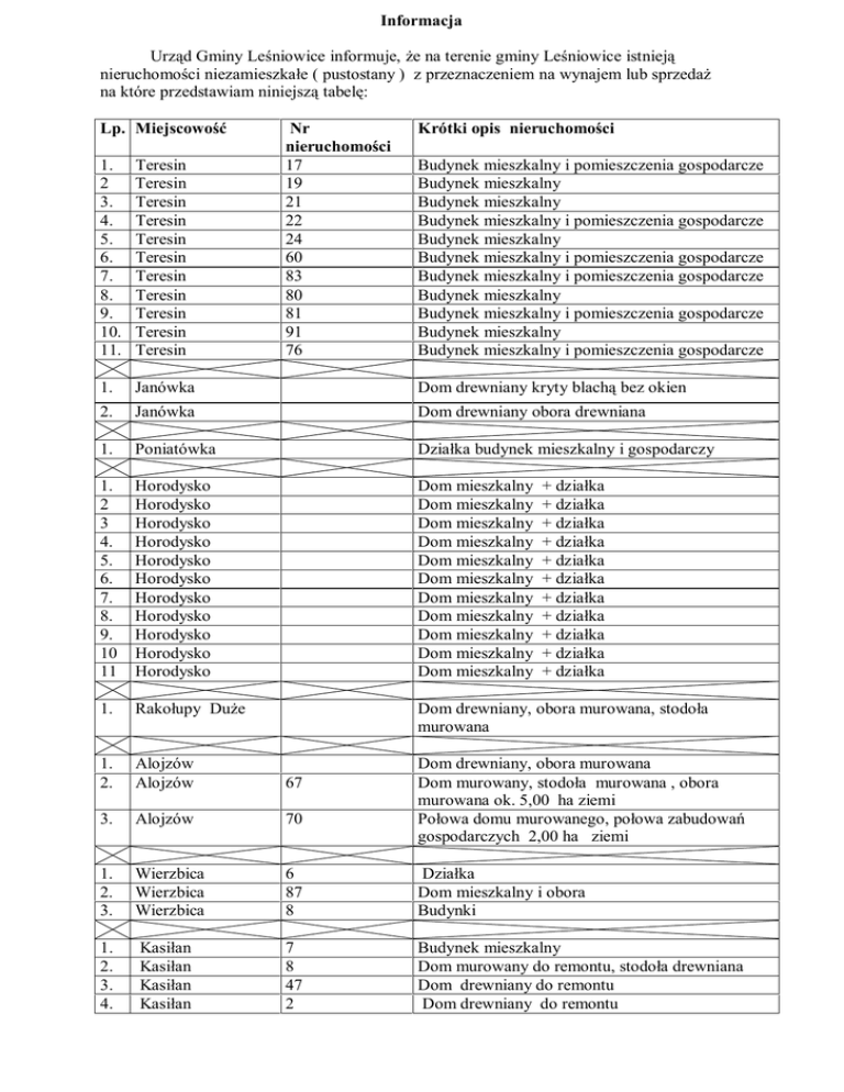 Informacja Urząd Gminy Leśniowice informuje, że na terenie gminy Leśniowice istnieją nieruchomości niezamieszkałe ( pustostany ) z przeznaczeniem na wynajem lub sprzedaż na które przedstawiam niniejszą tabelę: Lp. Miejscowość Nr nieruchomości 17 19 21 22 24 60 83 80 81 91 76 Krótki opis nieruchomości 1. 2 3. 4. 5. 6. 7. 8. 9. 10. 11. Teresin Teresin Teresin Teresin Teresin Teresin Teresin Teresin Teresin Teresin Teresin Budynek mieszkalny i pomieszczenia gospodarcze Budynek mieszkalny Budynek mieszkalny Budynek mieszkalny i pomieszczenia gospodarcze Budynek mieszkalny Budynek mieszkalny i pomieszczenia gospodarcze Budynek mieszkalny i pomieszczenia gospodarcze Budynek mieszkalny Budynek mieszkalny i pomieszczenia gospodarcze Budynek mieszkalny Budynek mieszkalny i pomieszczenia gospodarcze 1. Janówka Dom drewniany kryty blachą bez okien 2. Janówka Dom drewniany obora drewniana 1. Poniatówka Działka budynek mieszkalny i gospodarczy 1. 2 3 4. 5. 6. 7. 8. 9. 10 11 Horodysko Horodysko Horodysko Horodysko Horodysko Horodysko Horodysko Horodysko Horodysko Horodysko Horodysko Dom mieszkalny Dom mieszkalny Dom mieszkalny Dom mieszkalny Dom mieszkalny Dom mieszkalny Dom mieszkalny Dom mieszkalny Dom mieszkalny Dom mieszkalny Dom mieszkalny 1. Rakołupy Duże Dom drewniany, obora murowana, stodoła murowana 1. 2. Alojzów Alojzów 67 3. Alojzów 70 1. 2. 3. Wierzbica Wierzbica Wierzbica 6 87 8 Działka Dom mieszkalny i obora Budynki 1. 2. 3. 4. Kasiłan Kasiłan Kasiłan Kasiłan 7 8 47 2 Budynek mieszkalny Dom murowany do remontu, stodoła drewniana Dom drewniany do remontu Dom drewniany do remontu + działka + działka + działka + działka + działka + działka + działka + działka + działka + działka + działka Dom drewniany, obora murowana Dom murowany, stodoła murowana , obora murowana ok. 5,00 ha ziemi Połowa domu murowanego, połowa zabudowań gospodarczych 2,00 ha ziemi Wszelkich informacji można uzyskać w Urzędzie Gminy Leśniowice w Referacie Gospodarki Komunalnej Rolnictwa i Ochrony Środowiska pod nr tel. 082 567-54-91 oraz u Sołtysów wsi niżej wymienionych miejscowościach: 1.Teresin 2. Janówka 3. Poniatówka 4. Horodysko 5. Rakołupy Duże 6. Alojzów 7. Wierzbica 8. Kasiłan P. Edward Jabłoński P. Zbigniew Biłan P. Halina Sitarz P. Teresa Prokop P. Krzysztof Stańkowski P. Stefan Głaz P. Beata Sulej P. Krzysztof Panasiuk - tel. 082 tel. 082 tel. 082 tel. 082 tel. 082 tel. 082 tel. 082 tel. 082 567-55-14 567 -56-35 560 -29-21 567 -54-39 567 - 55-62 567 -57-39 560 - 78-97 567 -62-58