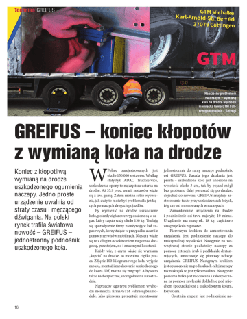 Technika GREIFUS Naprzeciw problemom związanym z wymianą koła na drodze wychodzi niemiecka firma GTM Fahrzeugbaumodule z Getyngi GREIFUS – koniec kłopotów z wymianą koła na drodze Koniec z kłopotliwą wymianą na drodze uszkodzonego ogumienia naczepy. Jedno proste urządzenie uwalnia od straty czasu i męczącego dźwigania. Na polski rynek trafiła światowa nowość – GREIFUS – jednostronny podnośnik uszkodzonego koła. 16 W Polsce zarejestrowanych jest około 150 000 zestawów. Według statystyk ADAC Truckservice, uszkodzenia opony to najczęstsza usterka na drodze. Aż 35,9 proc. awarii zestawów wiąże się z tzw. gumą. Zatem można sobie wyobrazić, jak duży to może być problem dla jeżdżących po naszych drogach pojazdów. By wymienić na drodze uszkodzone koło, pojazdy ciężarowe wyposażone są w zapas, który często waży około 130 kg. Trafiają się sporadycznie firmy nieużywające kół zapasowych, korzystające w przypadku awarii z pomocy serwisów mobilnych. Niestety wiąże się to z długim oczekiwaniem na pomoc drogową, przestojem, no i znacznymi kosztami. Każdy wie, z czym wiąże się wymiana „kapcia” na drodze, to mozolna, ciężka praca. Zdjęcie 100-kilogramowego koła, wyjęcie zapasu, montaż i zapakowanie uszkodzonego do kosza. Uff, można się zmęczyć. A bywa to także niebezpieczne, szczególnie na autostradzie. Naprzeciw tego typu problemom wychodzi niemiecka firma GTM Fahrzeugbaumodule. Jako pierwsza prezentuje montowany jednostronnie do ramy naczepy podnośnik osi GREIFUS. Zasada jego działania jest prosta – uszkodzone koło jest unoszone na wysokość około 3 cm, tak by pojazd mógł bez problemu dalej poruszać się po drodze, dojechać do serwisu. GREIFUS znajduje zastosowanie także przy uszkodzeniach łożysk, felg czy osi montowanych w naczepach. Zamontowanie urządzenia na drodze i podniesienie osi trwa najwyżej 10 minut. Urządzenie ma masę ok. 18 kg, częściowo zastępuje koło zapasowe. Pierwszym krokiem do zamontowania urządzenia jest podniesienie naczepy do maksymalnej wysokości. Następnie na wewnętrznej stronie podłużnicy naczepy za pomocą czterech śrub i podkładek dystansujących, umocowuje się pionowy uchwyt urządzenia GREIFUS. Następnym krokiem jest opuszczenie na poduszkach całej naczepy tak nisko jak to jest tylko możliwe. Następnie pozioma belka jest mocowana i zabezpieczana za pomocą zawleczki dokładnie pod miechem (poduszką) osi z uszkodzonym kołem, łożyskiem. Ostatnim etapem jest podniesienie na- Uszkodzone koło jest unoszone na wysokość około 3 cm, tak by pojazd mógł bez problemu dalej poruszać się po drodze Pozioma belka jest mocowana i zabezpieczana za pomocą zawleczki dokładnie pod miechem (poduszką) osi z uszkodzonym kołem, łożyskiem Fot. Greifus czepy na układzie pneumatycznym, do wysokości transportowej, czyli ok. 3 cm nad powierzchnię jezdni. Jak zapewnia producent, urządzenie jest bardzo łatwe w montażu i nie wymaga specjalistycznego przygotowania. Urządzenie to ogranicza niebezpieczeństwo związane z wymianą koła na drodze, szczególnie na autostradach. GREIFUS pozwala zaoszczędzić ok. 150 kg na masie własnej naczepy (masa koła zapasowego oraz skrzynki, w której się ono znajduje) oraz ograniczyć koszty inwestycji związanej z ich zakupem. Ograniczona masa własna naczepy to albo zwiększenie jej ładowności, albo zmniejszenie zużycia paliwa. GREIFUS może znaleźć zastosowanie w warsztatach naprawczych, znajdujących się w firmach transportowych. Jego zastosowanie umożliwia lepszy dostęp do osi zwłaszcza przy przeglądach, naprawach hamulców, łożysk czy samych osi. Urządzenie idealnie nadaje się także w serwisach w celu przygotowania i manewrowania naczepą, niezależnie od stopnia zaawansowania naprawy hamulców, łożysk lub osi. Eliminuje konieczność założenia kół, aby przestawić pojazd na placu lub w hali. Podstawowe zalety GREIFUS • możliwość szybkiego i prostego dojechania do najbliższego parkingu lub pobliskiego serwisu ogumienia • czas montowania maksymalnie 10 minut • nie jest wymagana fachowa wiedza • skrócenie czasów postoju • nie jest potrzebna utwardzona nawierzchnia do montażu • zmniejszenie ryzyka związanego z niebezpiecznymi sytuacjami awaryjnymi na miejscu zdarzenia, zwłaszcza na autostradach • zaoszczędzenie na wadze powyżej 150 kg dzięki rezygnacji z koła zapasowego i z jego mocowania • niższe koszty w wyniku pozbycia się koła zapasowego • mniejsze zużycie paliwa i zwiększenie pojemności ładunkowej Jak działa GREIFUS zobacz na filmie dostępnym bezpłatnie na stronie www.greifus.eu Opr. Redakcja 17