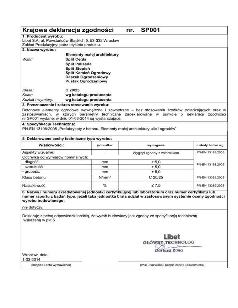 Krajowa deklaracja zgodności nr. SP001 1. Producent wyrobu: Libet S.A. ul. Powstańców Śląskich 5, 53-332 Wrocław Zakład Produkcyjny: patrz etykieta produktu. 2. Nazwa wyrobu: Elementy małej architektury Wzór: Split Cegła Split Palisada Split Stopień Split Kamień Ogrodowy Daszek Ogrodzeniowy Pustak Ogrodzeniowy Klasa: C 20/25 Kolor: wg katalogu producenta Kształt i wymiary: wg katalogu producenta 3. Przeznaczenie i zakres stosowania wyrobu: Betonowe elementy ogrodowe wewnętrzne i zewnętrzne – bez stosowania środków odladzających oraz w zastosowaniach, w których parametry techniczne zadeklarowane w punkcie 5 deklaracji zgodności nr SP001 wydanej w dniu 01-03-2014 są wystarczające. 4. Specyfikacja Techniczna: PN-EN 13198:2005 „Prefabrykaty z betonu. Elementy małej architektury ulic i ogrodów” 5. Deklarowane cechy techniczne typu wyrobu: Właściwości: jednostka: wymagania metody badań wg. - Wygląd zgodny z wzornikiem PN-EN 13198:2005 mm mm mm ± 5,0 ± 5,0 ± 5,0 Klasa betonu N/mm2 C 20/25 PN-EN 13369:2005 Nasiąkliwość % ≤ 7,5 PN-EN 13369:2005 Aspekty wizualne: Odchyłka od wymiarów nominalnych: - długość: - szerokość: - grubość: PN-EN 13198:2005 6. Nazwy i numeru akredytowanej jednostki certyfikującej lub laboratorium oraz numer certyfikatu lub numer raportu z badań typu, jeżeli taka jednostka brała udział w zastosowanym systemie oceny zgodności wyrobu budowlanego: nie dotyczy. Deklaruję z pełną odpowiedzialnością, że wyrób budowlany jest zgodny ze specyfikacją techniczną wskazaną w pkt.5 Wrocław, dnia: 1-03-2014 (miejsce i data wystawienia) (imię i nazwisko i podpis osoby upoważnionej)