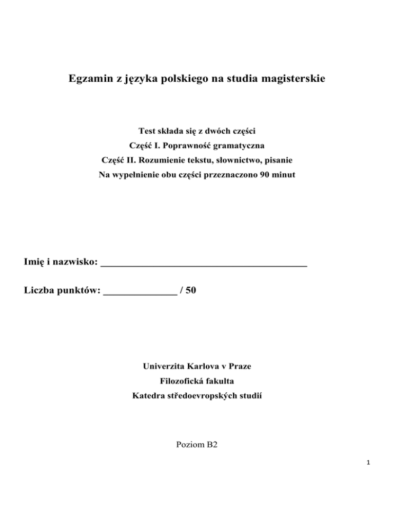 Egzamin z języka polskiego na studia magisterskie Test składa się z dwóch części Część I. Poprawność gramatyczna Część II. Rozumienie tekstu, słownictwo, pisanie Na wypełnienie obu części przeznaczono 90 minut Imię i nazwisko: _______________________________________ Liczba punktów: ______________ / 50 Univerzita Karlova v Praze Filozofická fakulta Katedra středoevropských studií Poziom B2 1 CZĘŚĆ I POPRAWNOŚĆ GRAMATYCZNA 7 zadań, 45 minut I. Liczba punktów: ________ / 30 Proszę uzupełnić tekst poprawną formą wyrazów podanych w nawiasach. Pierwsze rozwiązanie jest przykładem (odmiana rzeczowników i przymiotników). ____ / 6 (12x0,5) Pierwszą podróŜ carpoolingową odbyłam osiem lat temu – z Warszawy do Gdańska (Warszawa, Gdańsk). Od ………………….. ………………. (tamta pora) zjeździłam w ten sposób całą ………………… (Polska), a najdalej udało mi się dojechać na Lazurowe WybrzeŜe – opowiada Iwona Pawełek, studentka ………………….. (geografia) i transportu. Dodaje, Ŝe względy ekonomiczne nie zawsze są priorytetem. – Dla mnie waŜna jest takŜe moŜliwość poznania ludzi. PodróŜ sprzyja ……………….. i ………………… ……………….. (długa i ciekawa rozmowa, l. mn.) – stwierdza studentka, która nie tylko szuka ………………….. ………………….. (wolne miejsce) na przejazd, ale takŜe sama zabiera pasaŜerów. Statystyki pokazują, Ŝe większość osób korzystających z carpoolingu to młodzi ludzie, głównie ………………….. (student, l. mn.). – Wszystko zaczęło się od niezapomnianego wyjazdu do ………………….. (Francja), teraz na majówkę planuję pojechać do Amsterdamu, a na wakacje Bałkany. Nie byłam teŜ jeszcze we ………………… (Włochy). Za taką formą podróŜowania przemawiają przede wszystkim niskie koszty – przekonuje studentka Aleksandra Cieszyńska. II. Proszę uzupełnić tekst poprawną formą wyrazów podanych w nawiasach. Pierwsze rozwiązanie jest przykładem (odmiana zaimków). ____ / 4 (8x0,5) Pierwszy raz o carpoolingu usłyszałam w tym (ten) miesiącu i od razu spodobał ………….. (ja) się ten sposób przemieszczania. Jest to forma podróŜowania, ………… (który) polega na udostępnianiu miejsca w …………. (swój) samochodzie lub korzystania z wolnego miejsca w samochodzie innego uŜytkownika. Dzięki ………… (on) moŜna nie tylko podzielić koszty podróŜy, ale takŜe nawiązać ciekawe kontakty. Oczywiście, podzieliłam się ………….. (ta) wiedzą ze …………….. (swój) znajomymi, ……………. (który) są tym pomysłem równie zachwyceni. Polecam …………. (ta) formę podróŜowania z czystym sumieniem. III. Proszę uzupełnić tekst właściwymi przyimkami. Pierwsze rozwiązanie jest przykładem. ____ / 2,5 (10x0,25) 2 W ubiegłym roku postanowiliśmy pojechać razem ….. znajomymi ….. miesiąc ….. Alpy. Szwajcaria marzyła nam się od dawna. Nasza podróŜ zaczęła się bardzo wcześnie. Jeszcze ….. świtem ruszyliśmy ….. dworzec. ……. nami na ulicach Krakowa nie było Ŝywej duszy. …… peronie takŜe było pusto – nic dziwnego, była piąta rano, w dodatku niedziela. Wprawdzie stał jakiś pociąg, ale wyglądał ….. kompletnie pusty. Postanowiliśmy poszukać kogoś …… obsługi. Gdy tylko weszliśmy ….. budynku stacji, pojawił się ubrany w nieskazitelnie białą koszulę kolejarz. IV. Proszę przekształcić tekst, uŜywając wyrazów z ramki. Pierwsze rozwiązanie jest przykładem (kaŜdy wyraz moŜe być uŜyty tylko raz). ____ / 5 (5x1) poza / z powodu / w czasie / mimo / dzięki / ze względu 0. Nie pojadę w góry, gdyŜ moja przyjaciółka się rozchorowała. Ze względu na chorobę swojej przyjaciółki nie pojadę w góry. 1. Piotr nie mógł jechać na wycieczkę, poniewaŜ złamał sobie rękę. Piotr nie mógł jechać na wycieczkę ………………………………………………………………. . 2. Poznaliśmy ciekawych ludzi, kiedy podróŜowaliśmy autostopem. ……………………………………….................................................. poznaliśmy ciekawych ludzi. 3. Marek kupił bilety, poniewaŜ brat mu pomógł. Marek kupił bilety ………………………………………………………………………………… . 4. Nawet jeśli będzie brzydka pogoda, pojedziemy w góry na weekend. ……………………………………………………… pojedziemy w góry na weekend. 5. Wszyscy doskonale się bawili z wyjątkiem Kasi. ……………………………………………………………………… wszyscy doskonale się bawili. V. Proszę wybrać poprawna formę. Pierwsze rozwiązanie jest przykładem. ____ / 2,5 (10x0,25) 0. Pogoda jest brzydka. Na szczęście wszystkie dzieci są _______________ a. zdrowo b. zdrowe c. zdrowi d. zdrowy 1. To miasto jest ___________________ niŜ moja wieś. a. mniejsze b. najmniejsze c. mniejsza d. najmniejszy 3 2. To jest _______________ oferta w tym biurze. a. tania b. tańsza c. najtańsza d. najtańsze 3. ______________ samochód, nigdy nie rozmawiał przez telefon. a. prowadząc b. prowadzący c. prowadzi d. prowadzony 4. __________________ wiadomości, wyłączył radio. a. słuchając b. słuchał c. wysłuchawszy d. słuchający 5. To nie jest dobre biuro podróŜy. Nie _______________ z nimi rozmawiać. a. warto b. moŜna c. trzeba d. wolno 6. To był jej błąd. Nie _______________ zostawiać w hotelu paszportu. a. powinna b. powinna była c. powinien d. powinien był 7. Zwykle ________________ wakacje w ostatniej chwili. a. planuję b. będę planować c. zaplanuję d. zaplanowałam 8. Straszne korki!! Dzisiaj 20 minut _______________ z Markiem do pracy. a. pojechaliśmy b. dojechaliśmy c. jechaliśmy c. przyjechaliśmy 9. Niestety, dziewczyn nie ma. _______________ na spotkanie. a. poszły b. poszli c. szły