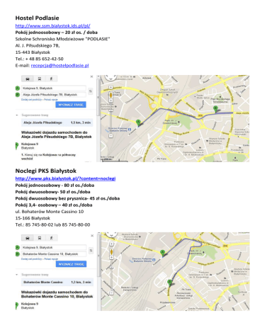 Hostel Podlasie http://www.ssm.bialystok.ids.pl/pl/ Pokój jednoosobowy – 20 zł os. / doba Szkolne Schronisko Młodzieżowe "PODLASIE" Al. J. Piłsudskiego 7B, 15-443 Białystok Tel.: + 48 85 652-42-50 E-mail: [email protected] Noclegi PKS Białystok http://www.pks.bialystok.pl/?content=noclegi Pokój jednoosobowy - 80 zł os./doba Pokój dwuosobowy- 50 zł os./doba Pokój dwuosobowy bez prysznica- 45 zł os./doba Pokój 3,4- osobowy – 40 zł os./doba ul. Bohaterów Monte Cassino 10 15-166 Białystok Tel.: 85 745-80-02 lub 85 745-80-00 Gościnna Kamienica http://www.goscinnakamienica.pl/ Pokój jednoosobowy ze śniadaniem – 169 zł os./doba Pokój dwuosobowy ze śniadaniem – 219 zł os./doba ul. Sienkiewicza 24 15-090 Białystok Tel.: +48 (85) 831 15 55 Tel. kom.: 535 971 911 Gadu-Gadu 35637320 e-mail: [email protected] Hotel Ilona http://www.hotelilona.bialystok.pl/ilona * Ceny za dobę zaczynają się od 40zł za osobę *Zniżki dla studentów: - 30 zł za nocleg w pokoju wieloosobowym - 25% rabatu na nocleg w naszych apartamentach i pokojach z łazienką * Ceny pobytu w pensjonacie można negocjować Kolejowa 26a 15-701 Białystok Tel.: (85) 651 27 95 e-mail: [email protected] Hotel BOSir http://www.mosir.bialystok.pl/obiekty/6/hotel-mosir Pokój jednoosobowy bez łazienki – 70 zł os./doba Pokój jednoosobowy z łazienką – 115 zł os./doba Pokój dwuosobowy z łazienką – 140 zł os./doba ul. Wołodyjowskiego 5 15-272 Białystok tel. 085 749 62 00, 085 749 62 10 fax 085 749 62 33 e-mail: [email protected] W razie problemów prosimy o kontakt: e-mail: [email protected] tel.: 795 888 382 Dojazd z Dworca PKP oraz PKS na Uczelnie Wydział Ekonomii i Zarządzania (ul. Warszawska 63): DĄBROWSKIEGO, P.Kontrol (998)Przystanek w stronę Uczelni Linie: 2, 4, 7, 12, 21 Linia 2 przystanek: DĄBROWSKIEGO, P.Kontrol (998) kierunek: DOJLIDY GÓRNE, Pętla Wysiadamy na przystanku:BRANICKIEGO, Świętojańska (62) Linia 4 przystanek: DĄBROWSKIEGO, P.Kontrol (998) kierunek: WIEWIÓRCZA, Myśliwska Pętla Wysiadamy na przystanku:BRANICKIEGO, Świętojańska (62) Linia 7 przystanek: DĄBROWSKIEGO, P.Kontrol (998) kierunek: OLMONTY, Pętla Wysiadamy na przystanku:BRANICKIEGO, Świętojańska (62) Linia 12 przystanek: DĄBROWSKIEGO, P.Kontrol (998) kierunek: ŚCIEGIENNEGO, Pętla Wysiadamy na przystanku:BRANICKIEGO, Świętojańska (62) Linia 21przystanek: DĄBROWSKIEGO, P.Kontrol (998) kierunek: BRANICKIEGO, Piastowska Wysiadamy na przystanku:BRANICKIEGO, Świętojańska (62) Dojście z Przystanku Branickiego/Świętojańska na Wydział Ekonomii i Zarządzania: WYDZIAŁ EKONOMII I ZARZĄDZANIA W BIAŁYMSTOKU: