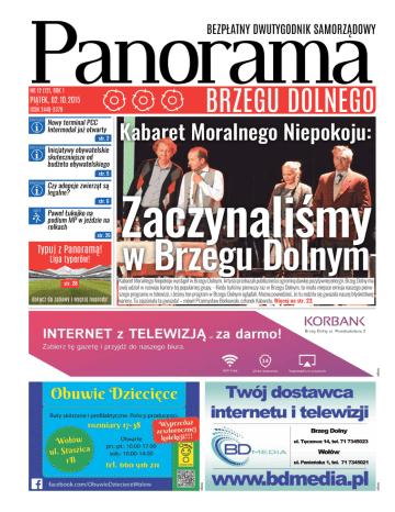 NR 12 (12), ROK 1 PIĄTEK, 02.10.2015 ISSN 2449-5379 informacje Nowy terminal PCC Intermodal już otwarty str. 2 informacje Inicjatywy obywatelskie skuteczniejsze od budżetu obywatelskiego Kabaret Moralnego Niepokoju: str. 5 sport Paweł Łukojko na podium MP w jeździe na rolkach str. 26 Typuj z Panoramą! Liga typerów! str. 28 dołącz do zabawy i wygraj nagrody! Zaczynaliśmy w Brzegu Dolnym Kabaret Moralnego Niepokoju wystąpił w Brzegu Dolnym. Artyści przekazali publiczności ogromną dawkę pozytywnej energii. Brzeg Dolny ma swój udział w rozwoju kariery tej popularnej grupy. - Kiedy byliśmy pierwszy raz w Brzegu Dolnym, to miała miejsce emisja naszego pierwszego programu w telewizji, i żeśmy ten program w Brzegu Dolnym oglądali. Można powiedzieć, że tu rodziła się gwiazda naszej błyskotliwej kariery. Tu zajaśniała ta gwiazda! – mówił Przemysław Borkowski, członek Kabaretu. Więcej na str. 23. reklama str. 6 reklama Czy adopcje zwierząt są legalne? reklama informacje PIĄTEK, 02.10.2015 Waldemar Preussner, właściciel grupy PCC (na zdjęciu w środku), otwarcie terminala uznaje za duży sukces Od lewej: Wiesław Klimkowski, prezes PCC Rokita, Michał Jaros, poseł na Sejm RP oraz burmistrz Stanisław Jastrzębski fot. PCC Intermodal Na otwarcie terminala licznie przybyli kontrahenci, współpracownicy, samorządowcy Burmistrz Stanisław Jastrzębski rozmawia z Arturem Nowotnym, prezesem PCC Autochem Nowoczesny terminal przeładunkowy robi ogromne wrażenie Budowa terminala wiązała się z powstaniem nowych dróg dojazdowych Podziękowanie Kursanci języka angielskiego, niemieckiego i zajęć komputerowych Klubu 50 + pod patronatem DOK, nauczycielki - Maria-Teresa Wabińska, Edyta Ziarnik-Wróbel, Karolina Szulc oraz Związek Emerytów i Rencistów serdecznie dziękują Panu Dyrektorowi PZS Piotrowi Smelkowskiemu za użyczenie nam sal, sprzętu i pomocy naukowych. Również serdeczne podziękowania dla Pani Eweliny Mochol-Wolskiej za użyczenie swojego gabinetu wraz z pomocami. Dwutygodnik Samorządowy „Panorama Brzegu Dolnego”. Wydawca: Dolnobrzeski Ośrodek Kultury, Danuta Chłód – dyrektor. Nakład: 7 000 egzemplarzy. Adres wydawcy: ul. Kolejowa 29, 56-120 Brzeg Dolny, tel. 71 319 52 52. Kontakt z redakcją: tel. 71 319 51 17 (wew. 271), 882 447 666; e-mail: [email protected], [email protected]. Redaktor naczelna: Małgorzata Bołdyn, skład, grafika: Katarzyna Mrozek, dziennikarz, korekta i reklama: Marta Wabiszczewicz-Krawczuk, sport: Jarosław Iskra. Zespół redakcyjny: Małgorzata Bołdyn, Marta Wabiszczewicz-Krawczuk, Katarzyna Mrozek, Jarosław Iskra, Beata Kowal, Radosław Kozioł, Piotr Perliński, Dominik Kaczmarek, Kamilla Żółkiewicz, Marta Szajdzińska. Redakcja nie ponosi odpowiedzialności za treść i charakter reklam i ogłoszeń. Zastrzegamy sobie prawo do zmiany tytułów i adiustacji nadesłanych tekstów bez naruszenia głównej myśli autora. reklama fot. Panorama kres działalności firmy obejmuje organizowanie transportu towarów w kontenerach, na bazie regularnych połączeń kolejowych skoordynowanych z transportem drogowym. Koleją czy też drogami towar trafia do klientów. I da się na tym zarobić. Spółka jest notowana na Giełdzie Papierów Wartościowych w Warszawie. ogromny. Jego powierzchnia to 28 000 m². Może on pomieścić 2700 kontenerów o możliwościach przeładunkowych 110 000 kontenerów. – To nie jest łatwy biznes – stwierdził Alfred Pelzer, przewodniczący Rady Nadzorczej PCC Intermodal. – Panowie wybrali większe klocki, żeby je ułożyć. Jako Rada Nadzorcza życzymy prężnemu teamowi wszystkiego najlepszego. Podczas uroczystego otwarcia goście mieli okazję zobaczyć terminal i obejrzeć pokaz załadunku kontenerów. Z okazji jubileuszu firmy oraz otwarcia terminala był też imponujący tort w kształcie pociągu z przewożonymi kontenerami. Małgorzata Bołdyn, Radosław Kozioł fot. Panorama tym roku PCC IntermoW dal obchodzi jubileusz 10-lecia istnienia. Główny za- – Chciałbym wszystkim pracownikom pogratulować. To niesamowity wyczyn, bo było wiele problemów – powiedział właściciel grupy PCC Waldemar Preussner. – Kiedy ja mam pomysł biznesowy i mówię to, to innym wydaje się, że ja mam halucynacje. A tutaj, wydaje mi się, że oni przemienili halucynacje w realność. Serdecznie gratuluję. Na uroczystość otwarcia terminalu zaproszono przedstawicieli firm współpracujących, a także prezesów PCC Rokita oraz koncernu PCC. Obecni byli też przedstawiciele władz samorządowych. Brzeg Dolny reprezentował burmistrz Stanisław Jastrzębski. Inwestycja taka jak w Brzegu Dolnym czy Kutnie jest ważnym elementem biznesu. Terminal jest fot. Panorama W Brzegu Dolnym uroczyście otwarto nowy terminal przeładunkowy firmy PCC Intermodal, znajdujący się na terenie PCC Rokita. To drugi po Kutnie otwarty w tym roku terminal. W listopadzie ma zostać otwarty trzeci – w Gliwicach. fot. Panorama Nowy terminal PCC Intermodal już otwarty informacje fot. PCC Intermodal 2 PIĄTEK, 02.10.2015 Więcej patroli policyjnych w mieście 3 informacje reklama Radni Brzegu Dolnego spotkali się z nowym Komendantem Powiatowym Policji oraz Komendantem Komisariatu Policji w Brzegu Dolnym. Tematem były zmiany organizacyjne, które zostaną wprowadzone, by poprawić funkcjonowanie komisariatu w Brzegu Dolnym. działania Komendy Powiatowej jest ograniczanie przestępczości. Jest to realizowane skutecznie, a powiat wołowski należy do jednego z najbezpieczniejszych rejonów w całym województwie. Komendant ma plany dotyczące dalszego funkcjonowania Komisariatu w Brzegu Dolnym. Ma tutaj funkcjonować większa ilość stanowisk liniowych. Efektem tego ma być zwiększenie etatów w patrolach drogowych. Obecnie 10 jest etatów, ma być 14. Komendant ma zamiar odbudować zespół ds. kryminalnych, zarówno w Wołowie jak i Brzegu Dolnym, żeby zwiększyć rozpoznanie i móc szybciej re