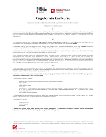 Regulamin konkursu REGULAMIN KONKURSU DLA ODWIEDZAJĄCYCH TARGI AQUATHERM WARSAW i WARSAW BUILD 2016 WARSZAWA 16-18 LISTOPADA 2016 §1 1.Organizatorem konkursu jest organizator targów Warsaw Build i Aquatherm Warsaw, firma Lentewenc Sp. z o.o. z siedzibą przy ul. Skwer Wyszyńskiego 5/37, 01-015 Warszawa, wpisaną do rejestru przedsiębiorców prowadzonego przez Sąd Rejonowy dla m.st. Warszawy XII Wydział Gospodarczy Krajowego Rejestru Sądowego pod numerem KRS 0000415363, NIP 5272675051, REGON 146063993, reprezentowaną przez: Akmaral Amirkhanova – Prezez Zarządu, zwana dalej Organizatorem. §2 1. Konkurs skierowany jest do osób zwiedzających Targi Aquatherm Warsaw i Warsaw Build 2016, organizowane przez Organizatora i odbywające się w Hali Centrum EXPO XXI w Warszawie przy ul. Ignacego Prądzyńskiego 12/14 w dniach 16-18 listopada 2016r., zwane dalej Targami. 2.Uczestnikiem konkursu może być pełnoletnia osoba fizyczna, która odwiedzi Targi i wypełni Kupon Konkursowy zwany dalej Kuponem oraz dołączy do niego firmową wizytówkę. Uczestnik, który nie spełni warunków określonych w regulaminie traci prawo do ewentualnej nagrody. 3.W Konkursie nie mogą uczestniczyć pracownicy Organizatora, pracownicy Targów Aquatherm Warsaw i Warsaw Build 2016, członkowie Komisji, pracownicy Centrum EXPO XXI oraz małżonkowie i dzieci wyżej wymienionych osób. 4.Dane osobowe Uczestników Konkursu są przetwarzane w celach urządzenia Konkursu i przekazania nagród Laureatom. Dane osobowe Uczestników przetwarzane są przy zachowaniu zasad określonych w ustawie o ochronie danych osobowych (Dz. U. z 2002 r. Nr 101, poz. 926 z późn. zm.). Administratorem danych osobowych udostępnionych przez Uczestników Konkursu jest firma Lentewenc Sp. z o.o. z siedzibą przy ul. Skwer Wyszyńskiego 5/37, 01-015 Warszawa, wpisaną do rejestru przedsiębiorców prowadzonego przez Sąd Rejonowy dla m.st. Warszawy XII Wydział Gospodarczy Krajowego Rejestru Sądowego pod numerem KRS 0000415363, NIP 5272675051, REGON 146063993. Podanie danych ma charakter dobrowolny. Osobom udostępniającym dane przysługuje prawo do wglądu do swoich danych oraz możliwość ich poprawiania. §3 1. Aby wziąć udział w konkursie należy w terminie od 16 do 18 listopada 2016 roku odwiedzić Targi Aquatherm Warsaw 2016 lub Warsaw Build 2016, prawidłowo wypełnić Kupon i wrzucić do jednej z dwóch urn konkursowych znajdujących się przy recepcji Targów i w Biurze Organizatora Targów od 16 listopada od godziny 10:00 do 18 listopada 2016 roku do godziny 15.00. 2. Zadaniem uczestników konkursu jest zaproponowanie hasła promującego Targi Aquatherm Warsaw 2016 lub Warsaw Build 2016. Tylko zgłoszenia z wypełnionym kompletem danych będą brane pod uwagę. 3. Kupon zawiera miejsce na wpisanie: propozycji hasła promującego Targi Aquatherm Warsaw 2016 lub Warsaw Build 2016 imię i nazwisko nazwa firmy numer telefonu i adres adres email oświadczenia o wyrażeniu zgodny na przetwarzanie danych osobowych zgodnie z ustawą o ochronie danych osobowych (Dz. U. z 2002 r. Nr 101, poz. 926 z późn. zm.). do celów związanych z Konkursem przez Organizatora firmę Lentewenc Sp. z o.o. z siedzibą przy ul. Skwer Wyszyńskiego 5/37, 01-015 daty i podpisu Uczestnika Konkursu. 4. Komisja Konkursowa, powołana przez Organizatora 18 listopada 2016 roku w ciągu 14 dni od zakończenia targów, tj. do 30 listopada 2016 wybierze najlepsze hasło promujące Targi Aquatherm Warsaw 2016 i Targi Warsaw Build 2016 5. W skład Komisji wchodzą: Jan Hertmanowski Karolina Tesarska Anna Rabiej 6. Komisja przy ocenie hasła będzie oceniać jego wartość marketingową ( wywoływanie pozytywnych skojarzeń, łatwość rozpoznawania i zapamiętywania, identyfikacja z tematyką Targów) oraz oryginalność i jakość językową. 7. Przystąpienie do konkursu jest równoznaczne z udzieleniem Organizatorowi do zgłoszonej pracy licencji korzystania z pracy w zakresie niezbędnym do przeprowadzenia postępowania konkursowego, a w szczególności do jego publikacji na wszystkich znanych polach eksploatacji. Warunkiem przyznania ul. Skwer Ks. Kard. St. Wyszyńskiego 5/37, 01-015 Warszawa, Sąd Rejonowy dla miasta stołecznego Warszawy , XII Wydział Gospodarczy, KRS 0000415363, Kapitał zakładowy: 1'566'500,00 PLN, NIP: 5272675051, REGON: 146063993 nagrody jest podpisanie przez Laureata pisemnego oświadczenia w przedmiocie przeniesienia całości autorskich praw majątkowych i praw zależnych do nagrodzonej pracy na rzecz Organizatora. 8. Laureat nagrody nie jest uprawniony do otrzymania wynagrodzenia z tytułu przeniesienia praw, o których mowa w ustępie poprzedzającym. §4 1.Uczestnicy konkursu mają szansę zdobyć jedną z nagród rzeczowych oferowanych przez Fundatorów Nagród: a. Nagroda główna: Fotel masujący, model „Oxford” od firmy Pro-Wellness Jurczyk, Abu El Ella, Cyran, Szpak Sp. J. o wartości 2999zł brutto. Nagroda główna przyznawana jest laureatowi, którego praca spełni najwyższe kryteria, tj. zostanie uznana za spełniającą kryteria wskazane w § 3 ust. 6 w przedziale 91 – 100% oczekiwań. 2.Nagrody sponsorowane są przez Fundatorów Nagród w Konkursach. Zostaną przekazane Organizatorowi na podstawie osobnych umów pomiędzy Fundatorami Nagród a Organizatorem. 3. Organizator nie odpowiada za jakość oferowanych nagród. W celu zgłaszania jakichkolwiek reklamacji należy kontaktować się z odpowiednim sponsorem nagrody. 4. Nagrody zostaną dostarczone przez Organizatora konkursu na adres wskazany przez zwycięzcę w umówionym terminie przez obie strony. 5.Nagrody nie podlegają wymianie na ekwiwalent pieniężny ani na inne nagrody rzeczowe o tej samej wartości. 6.Uczestnicy zostaną powiadomieni przez Organizatora o wyniku telefonicznie. 7. W przypadku braku danych kontaktowych umożliwiających przekazanie nagrody, nagroda przepada na rzecz innego uczestnika konkursu, który zostanie wybrany po