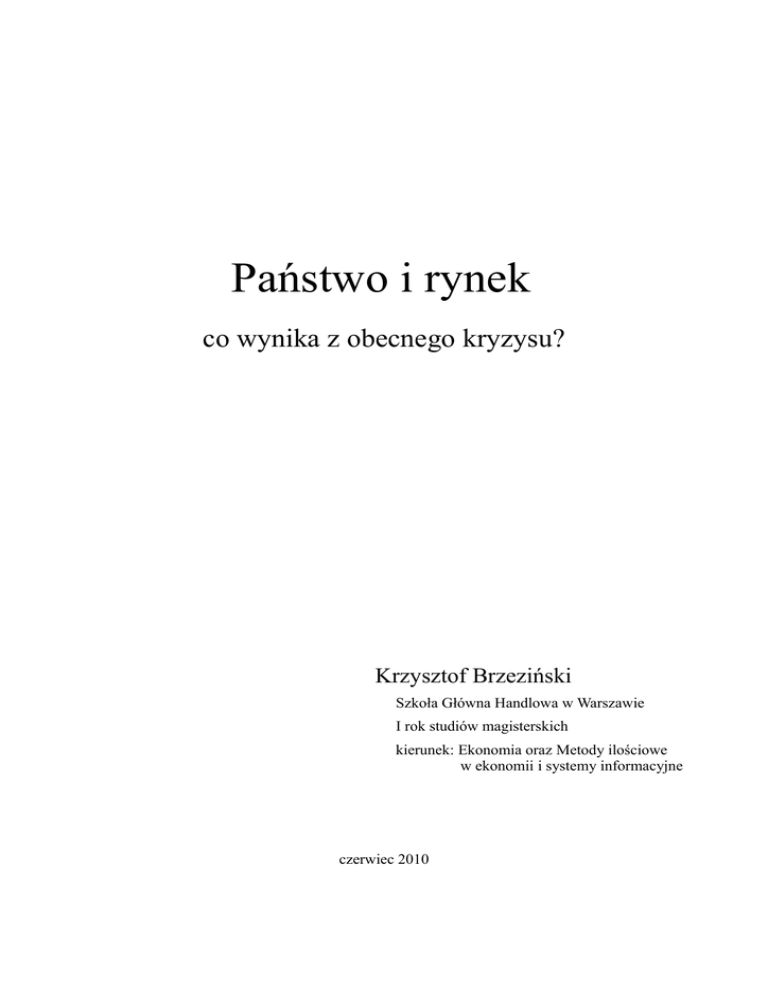 Państwo i rynek co wynika z obecnego kryzysu? Krzysztof Brzeziński Szkoła Główna Handlowa w Warszawie I rok studiów magisterskich kierunek: Ekonomia oraz Metody ilościowe w ekonomii i systemy informacyjne czerwiec 2010 I Pytania o przyszłość Dotkliwe kryzysy gospodarcze są tradycyjnie czasem wolty myślowej w ekonomii. Wiel- kiemu Kryzysowi oraz stagflacji lat 70. ubiegłego stulecia towarzyszyły próby zrozumienia czynników wywołujących nagłe zmniejszenie produkcji oraz pogorszenie innych zmiennych ekonomicznych. Trafna diagnoza przyczyn miała służyć opracowaniu efektywnych metod prewencji i na tym skupiała się większość badań ekonomistów. Do niedawna wydawało się, że starania te zostały zwieńczone sukcesem – okres od początku lat 80. dwudziestego wieku, nazwany Wielkim Uspokojeniem (The Great Moderation1), był świadectwem powodzenia polityki stabilizacyjnej 2. Znaczna część badaczy i uczestników rynku uwierzyła, że udało się „wygładzić” cykl koniunkturalny przy pomocy instrumentów polityki (przede wszystkim) monetarnej oraz fiskalnej. Olivier Blanchard, główny ekonomista MFW, w artykule z 2008 r. Rys. 1.: Dofinansowanie 2008 i inne duże projekty amerykańskiego rządu. pisał: „The state of macro is good”3. Wtedy nadszedł kolejny globalny kryzys – tym razem finansowy, a jego śladem kryzys fiskalny. Wraz z nimi zwątpienie w neutralność procesów finansowych dla gospodarki w skali makro i konieczność ponownej oceny jakości prowadzonej polityki USD w cenach stałych z XI 2008 makroekonomicznej. Plan Marshalla $115 000 000 000 Mimo, że w 1987 r. Robert Lucas argumen- zakup Luizjany $217 000 000 000 tował, że koszt społeczny fluktuacji aktywności wystrzelenie człowieka na Księżyc $237 000 000 000 kryzys kas oszczędnościowo-pożyczkowych $256 000 000 000 gospodarczej jest bardzo niski4, skala interwencji Stanów Zjednoczonych w porównaniu do innych wydatków (rys 1.) wskazuje, że ocena wojna koreańska $454 000 000 000 New Deal $500 000 000 000 wojna w Iraku $597 000 000 000 Wietnam $698 000 000 000 rządzących jest w tej kwestii odmienna. Tak NASA (całkowity historyczny budżet) $851 000 000 000 duże wydatki budżetowe skłaniają ekonomistów RAZEM $3 925 000 000 000 do stawiania pytań o zasadność i ewentualną dofinansowanie 2008 (XI 2008) $4 616 000 000 000 efektywność ingerencji. Czy rynek potrzebuje Źródło: www.rybinski.eu 1 Por. Stock J., Has the Business Cycle Changed and Why?, NBER Working Paper Series, sierpień 2002; w tłumaczeniu Ł. Goczka: Wielkie Umiarkowanie. 2 W tej kwestii panuje wśród ekonomistów pewna rozbieżność poglądów odnośnie do ram czasowych tego zjawiska (niektórzy twierdzą, że zaczęło się ono wcześniej, ale zostało przerwane przez nadzwyczaj silne i niespotykane dotąd szoki naftowe lat 70.) oraz przyczyn (jaka część spadku wahań jest rezultatem szczęścia, mniejszych szoków, zmian strukturalnych, a jaka ulepszonej polityki; prawdopodobnie swoją rolę odegrały również usprawnienia w zarządzaniu zapasami, duży wzrost produktywności oraz integracja handlowa Chin i Indii). Podobna wielkość wzrostu cen ropy naftowej w latach 70. i w ostatniej dekadzie potwierdza jednakże hipotezę poprawy jakości prowadzonej polityki makroekonomicznej. Por. Blanchard O., Dell’Ariccia G., and Mauro P., Rethinking Macroeconomic Policy, IMF Staff Position Note, 12 lutego 2010. 3 „Stan makroekonomii jest dobry” [tłum. K.B.]. Blanchard O., The state of macro, NBER Working Paper Series, 14259, sierpień 2008. 1 wsparcia ze strony rządu, a jeśli tak, to kiedy i w jakiej formie można jej dostarczyć, aby osiągnąć jak najlepsze efekty jak najniższym kosztem? Na światło dzienne wyszła krytyka metodologii ekonomii, której zarzucono „fundamentalizm rynkowy”5 oraz nierozpoznanie symptomów nadchodzącego spowolnienia gospodarczego. Paul Krugman pisał o swoich kolegach po fachu: „the economics profession went astray because economists, as a group, mistook beauty, clad in impressive-looking mathematics, for truth”6. Czołowi europejscy politycy wydają się iść w swojej krytyce jeszcze dalej. Prezydent Sarkozy gościł byłego premiera Blaira w Paryżu na sympozjum „Nowy świat, nowy kapitalizm”, na którym rozważano alternatywną wersję kapitalizmu. Angela Merkel przedstawiła niemiecką koncepcję rynku "socjalnego", ograniczonego pakietem konsensusów.7 Czy potrzebujemy więc „nowego kapitalizmu”? Niniejszy esej jest próbą odpowiedzi na postawione wyżej pytania o związek państwa z rynkiem. Próba ta jest o tyle trudna, o ile odnosi się do wciąż trwających i dynamicznie zmieniających się procesów, czym należy usprawiedliwić ogólność niektórych z zaleceń. Ze względu na ograniczoną objętość nie jest to także analiza wyczerpująca temat, ale jedynie sygnalizująca pewne problemy i proponowane rozwiązania. II Przyczyny kryzysu Dobra recepta wymaga trafnej diagno- Rys. 2: Stopa procentowa funduszy federalnych – przebieg rzeczywisty (linia ciągła) i scenariusz alternatywny Rysunek 1: Reguła zy. Klasyczne wyjaśnienia powodów kryzy(linia przerywana) wyrażone w procentach. sów finansowych wskazują na nadmiar – najczęściej natury czysto pieniężnej – prowadzący do ożywienia i nieuchronnego załamania (tzw. boom and bust). Rys. 2. przedstawia decyzje Banku Rezerwy Federalnej USA w latach 2000-06. Wynika z niego, że decyzje dotyczące poziomu stóp procentowych doprowadziły ich poziom znacznie niżej niż zalecałaby reguła Taylora, która sprawdziła Źródło: Taylor J. B., Housing and Monetary Policy, referat wygłoszony w Jackson Hole w sierpniu 2007. 4 Lucas R. E. Jr., Models of Business Cycles, Blackwell, Oxford, 1987. 5 Termin używany m.in. przez Georga Sorosa i Josepha Stiglitza. 6 „Ekonomia zboczyła z drogi, ponieważ ekonomiści jako grupa pomylili piękno odziane w imponującą matema