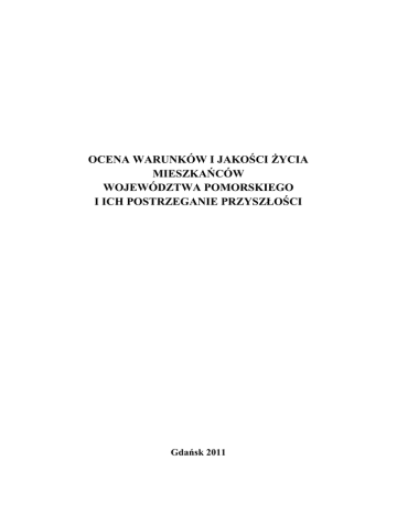 OCENA WARUNKÓW I JAKOŚCI ŻYCIA MIESZKAŃCÓW WOJEWÓDZTWA POMORSKIEGO I ICH POSTRZEGANIE PRZYSZŁOŚCI Gdańsk 2011 OCENA WARUNKÓW I JAKOĝCI ĩYCIA MIESZKAēCÓW WOJEWÓDZTWA POMORSKIEGO I ICH POSTRZEGANIE PRZYSZŁOĝCI Opracowanie zrealizowane dla UrzĊdu Marszałkowskiego Województwa Pomorskiego Badanie w ramach projektu systemowego „Moduł Informacyjno-Decyzyjny Regionalny Barometr Społeczny” (MID RBS) realizowanego w ramach Programu Operacyjnego Kapitał Ludzki na lata 2007-2013. Projekt współfinansowany ze środków Unii Europejskiej w ramach Europejskiego Funduszu Społecznego. Wydawca URZĄD MARSZAŁKOWSKI WOJEWÓDZTWA POMORSKIEGO Departament Rozwoju Regionalnego i Przestrzennego ul. Okopowa 21-27, 80-810 Gdańsk tel. 58 32 61 684, fax. 58 32 68 688 e-mail: [email protected] Badanie zrealizowane przez konsorcjum: Quality Watch Sp. z o.o., ul. Goplańska 6, 02-954 Warszawa PSDB Sp. z o.o., ul. Sienna 64, 00-825 Warszawa Redakcja techniczna: Anna Ćwikałowska Projekt okładki: „ARTIKOM” Sp. z o.o oraz Bartosz Pępek Druk: K&K reklama poligrafia, ul. Ostatnia 22, 31-444 Kraków Copyright by Urząd Marszałkowski Województwa Pomorskiego Gdańsk 2011 ISBN 978-83-88262-19-7 Spis treści 1. STRESZCZENIE WYKONAWCZE ....................................................................7 2. WPROWADZENIE ..............................................................................................17 3. WSTĘP TEORETYCZNY DO BADANIA WARUNKÓW, JAKOŚCI I POCZUCIA ZADOWOLENIA Z śYCIA ...................................................19 4. WOJEWÓDZTWO POMORSKIE W ŚWIETLE DIAGNOZY SPOŁECZNEJ (ANALIZA PORÓWNAWCZA) .......................................29 4.1. Warunki Ŝycia w świetle czynników obiektywnych i subiektywnych ............29 4.2. Zadowolenie z Ŝycia............................................................................................33 4.3. Podsumowanie i wnioski cząstkowe z rozdziału ..............................................38 5. WARUNKI śYCIA...............................................................................................40 5.1. Dochody i zaspokojenie potrzeb gospodarstw domowych ..............................40 5.1.1. Dochody gospodarstw domowych – ocena obiektywna ...............................41 5.1.2. Dochody gospodarstw domowych – ocena subiektywna .............................48 5.1.3. Gospodarowanie finansami – kredyty i oszczędności ..................................56 5.1.4. Zaspokojenie potrzeb gospodarstw domowych ............................................59 5.2. Zasobność materialna i warunki mieszkaniowe ..............................................67 5.2.1. Zasobność materialna ...................................................................................67 5.2.2. Warunki mieszkaniowe ................................................................................70 5.3. Podsumowanie i wnioski cząstkowe z rozdziału .............................................76 6. CHARAKTERYSTYKA POZIOMU I JAKOŚCI śYCIA ...............................78 6.1. Otoczenie gospodarstw domowych ...................................................................78 6.1.1. Dostęp do infrastruktury...............................................................................78 6.1.2. Edukacja .......................................................................................................79 6.1.3. Opieka zdrowotna.........................................................................................84 6.1.4. Bezpieczeństwo ............................................................................................86 6.1.5. Przyroda i środowisko ..................................................................................89 6.1.6. Transport i komunikacja...............................................................................90 6.1.7. Kontakty z instytucjami i urzędami ..............................................................94 6.2. Styl Ŝycia, postawy i relacje społeczne ..............................................................95 6.2.1.Styl Ŝycia .......................................................................................................96 6.2.2.Uczestnictwo w Ŝyciu społecznym ..............................................................103 6.2.3.Technologie informacyjno-komunikacyjne.................................................104 6.3. Podsumowanie i wnioski cząstkowe z rozdziału ............................................106 7. ZADOWOLENIE Z śYCIA I POSTRZEGANIE PRZYSZŁOŚCI .............109 7.1. Wprowadzenie ..................................................................................................109 7.2. Ogólny poziom zadowolenia z Ŝycia................................................................110 7.3. Analiza wymiarów składających się na poziom zadowolenia z Ŝycia...........116 7.4. Postrzeganie przyszłości...................................................................................125 7.5. Podsumowanie i wnioski cząstkowe z rozdziału ............................................127 8. WNIOSKI I REKOMENDACJE.......................................................................129 LITERATURA ........................................................................................................138 SPIS WYKRESÓW ................................................................................................140 SPIS TABEL............................................................................................................143 SPIS DIAGRAMÓW ..............................................................................................143 SPIS MAP ................................................................................................................143 ZAŁĄCZNIK 1. OPIS ZASTOSOWANEJ METODOLOGII, NARZĘDZIA BADAWCZE, OPIS REALIZACJI BADANIA ........................................145 Wprowadzenie do części m