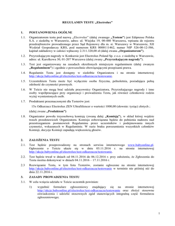REGULAMIN TESTU „Electrolux” 1. POSTANOWIENIA OGÓLNE 1.1. Organizatorem testu pod nazwą „Electrolux” (dalej zwanego „Testem”) jest Edipresse Polska S.A. z siedzibą w Warszawie, adres: ul. Wiejska 19, 00-480 Warszawa, wpisana do rejestru przedsiębiorców prowadzonego przez Sąd Rejonowy dla m. st. Warszawy w Warszawie, XII Wydział Gospodarczy KRS, pod numerem KRS 0000111462, numer NIP 526-00-12-586, kapitał zakładowy w całości wpłacony 2.311.320,00 zł (dalej zwana „Organizatorem”). 1.2. Przyrzekającym nagrody w Konkursie jest Electrolux Poland Sp. z o.o. z siedzibą w Warszawie, adres: ul. Karolkowa 30, 01-207 Warszawa (dalej zwany „Przyrzekającym nagrody”). 1.3. Test jest organizowany na zasadach określonych niniejszym regulaminem (dalej zwanym „Regulaminem”) i zgodnie z powszechnie obowiązującymi przepisami prawa. 1.4. Regulamin Testu jest dostępny w siedzibie Organizatora i na stronie internetowej http://akcje.babyonline.pl/electrolux/test-odkurzacza/testowanie. 1.5. Uczestnikiem Testu może być wyłącznie osoba fizyczna, pełnoletnia, posiadająca pełną zdolność do czynności prawnych. 1.6. W Teście nie mogą brać udziału pracownicy Organizatora, Przyrzekającego nagrody i inne osoby współpracujące przy organizacji i prowadzeniu Testu, jak również członkowie rodzin wyżej wymienionych osób. 1.7. Produktami przeznaczonymi dla Testerów jest: 15x Odkurzacz Electrolux ZEN UltraSilencer o wartości 1000,00 (słownie: tysiąc) złotych ; (dalej zwane „Produktem”) 1.8. Organizator powoła trzyosobową komisję (zwaną dalej „Komisją”), w skład której wejdzie trzech przedstawicieli Organizatora. Komisja zobowiązana będzie do pełnienia nadzoru nad przestrzeganiem postanowień Regulaminu przez uczestników i podejmowania innych czynności, wskazanych w Regulaminie. W razie braku porozumienia wszystkich członków Komisji, decyzje Komisji zapadają większością głosów. 2. ZAŁOŻENIA TESTU 2.1. Test będzie przeprowadzony na stronach serwisu internetowego www.babyonline.pl. Ogłoszenie o Teście ukaże się w dniu 03.11.2016 r. na stronie internetowej http://akcje.babyonline.pl/electrolux/test-odkurzacza/testowanie. 2.2. Test będzie trwał w dniach od 04.11.2016 do 06.12.2016 r. przy założeniu, że Zgłoszenia do Testu można dokonywać w dniach 04.11.2016 – 17.11.2016 r. 2.3 Rozwiązanie Testu, w tym lista Testerów, zostanie ogłoszone na stronie internetowej http://akcje.babyonline.pl/electrolux/test-odkurzacza/testowanie w terminie nie później niż do dnia 22.11.2016 r. 3. ZASADY PROWADZENIA TESTU 3.1. W celu wzięcia udziału w Teście uczestnik powinien: 1) wypełnić formularz zgłoszeniowy znajdujący się na stronie internetowej http://akcje.babyonline.pl/electrolux/test-odkurzacza/testowanie oraz złożyć stosowne oświadczenia i udzielić stosownych zgód stanowiących integralną część formularza zgłoszeniowego; 1 2) udzielić odpowiedzi na znajdujące się w formularzu zgłoszeniowym pytania zamknięte oraz pytanie otwarte „Dlaczego właśnie Ty powinnaś otrzymać do przetestowania odkurzacz Electrolux ZEN?” (dalej zwanej „Odpowiedzią”); 3) przesłać formularz zgłoszeniowy do Organizatora za pomocą znajdującego się na dole formularza przycisku „Wyślij zgłoszenie”. 3.2. Jeden uczestnik może wziąć udział w Teście tylko jeden raz. 3.3. Spośród wszystkich poprawnie przesłanych Odpowiedzi na pytanie otwarte, Komisja wybierze 15 najlepszych Odpowiedzi. Przy wyborze najlepszych Odpowiedzi Komisja będzie się kierować własnym uznaniem, biorąc pod uwagę walory artystyczne Odpowiedzi, w szczególności oryginalność i pomysłowość uczestnika – autora Odpowiedzi. Nie ma znaczenia kolejność zgłoszeń. 3.4. Testerami w liczbie 15 zostaną uczestnicy, których Odpowiedzi na pytania otwarte zostaną uznane przez Komisję za najlepsze zgodnie z pkt 3.3 powyżej, zwani dalej „Testerami”. Produkty zostaną przyznane po spełnieniu warunków określonych w Regulaminie. 3.5. Uczestnik oświadcza, że Odpowiedź na pytanie otwarte jest unikalną treścią, stworzoną przez niego specjalnie w celu wzięcia udziału w Teście, jak również, że nie jest publikowana w innych serwisach internetowych. 3.6. Uczestnik niniejszym oświadcza, że: (i) jest jedynym autorem Odpowiedzi zgłoszonej przez niego do Testu; (ii) Odpowiedź nie narusza praw osób trzecich; (iii) w przypadku, jeżeli Odpowiedź stanowi utwór, w rozumieniu ustawy z dnia 4 lutego 1994 r. o prawie autorskim i prawach pokrewnych, przysługują mu autorskie prawa majątkowe do Odpowiedzi, w zakresie niezbędnym do udzielenia licencji (iv) Odpowiedź nie stanowi opracowania w rozumieniu ustawy z dnia 4 lutego 1994 r. o prawie autorskim i prawach pokrewnych. 3.7. Odpowiedzi na pytania otwarte nie spełniające wymogów Regulaminu będą wykluczane z Testu przez Organizatora. 3.8. Do dnia 22.11.2016 r. Testerzy otrzymają prywatną wiadomość na skrzynkę pocztową podaną w formularzu zgłoszeniowym wraz z informacją o przyznaniu produktówi instrukcją dotyczącą dalszych etapów testowania. 3.9. Do dnia 30.11.2016 r. Testerzy otrzymają prywatną wiadomość na skrzynkę pocztową podaną w formularzu zgłoszeniowym z linkami do produktów w Katalogu Produktów Babyonline.pl, gdzie zobowiązani są napisać opinię w dniach 30.11.2016 – 06.12.2016 r. 3.10. W przypadku, jeżeli opinia określona w pkt. 3.9 stanowi utwór, w rozumieniu ustawy z dnia 4 lutego 1994 r. o prawie autorskim i prawach pokrewnych, Testerzy niniejszym udzielają Organizatorowi oraz Przyrzekającemu nagrody niewyłącznej, nieodpłatnej licencji do przesłanej opinii, zwanej dalej „Utworem”, bez ograniczeń czasowych lub terytorialnych, wraz z prawem do sublicenji na rzecz osób trzecich, na następujących polach eksploatacji: 1) zwielokrotnianie określoną techniką egzemplarzy Utworu, w tym techniką drukarską, reprograficzn