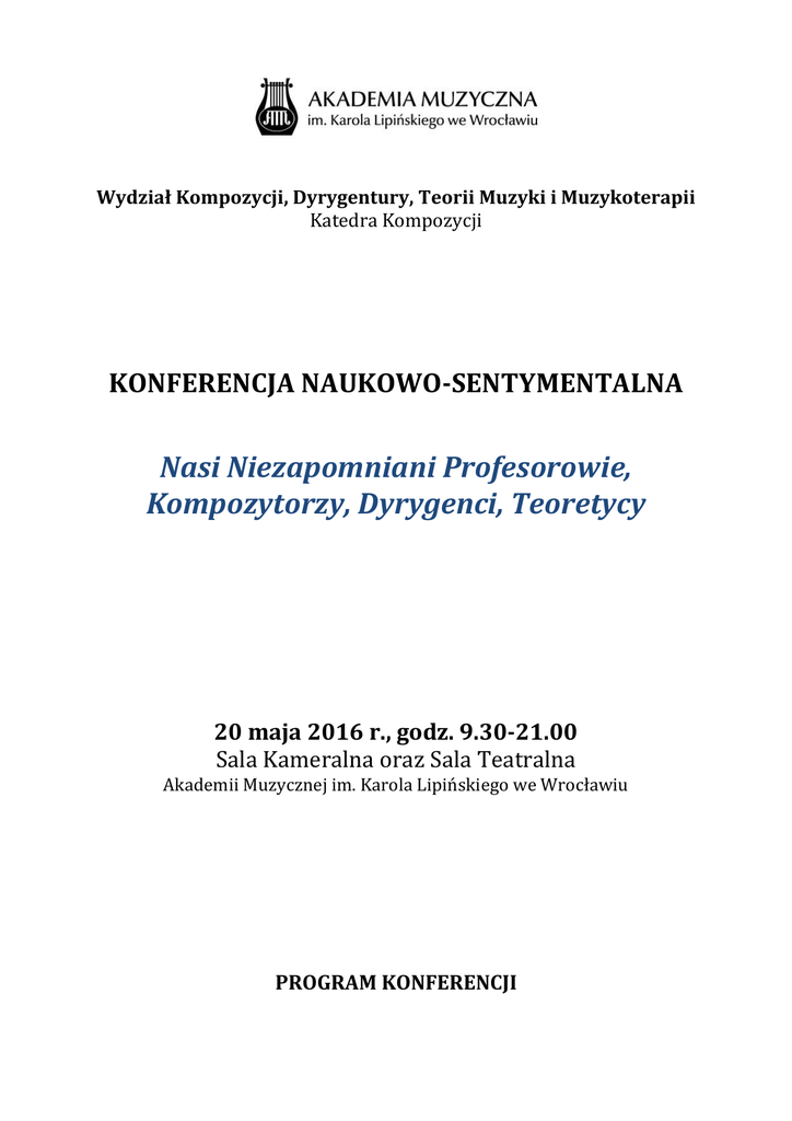 Wydział Kompozycji, Dyrygentury, Teorii Muzyki i Muzykoterapii Katedra Kompozycji KONFERENCJA NAUKOWO-SENTYMENTALNA Nasi Niezapomniani Profesorowie, Kompozytorzy, Dyrygenci, Teoretycy 20 maja 2016 r., godz. 9.30-21.00 Sala Kameralna oraz Sala Teatralna Akademii Muzycznej im. Karola Lipińskiego we Wrocławiu PROGRAM KONFERENCJI PROGRAM SALA KAMERALNA godz. 9.30 Powitanie gości i otwarcie konferencji Prorektor ds. studenckich i dydaktyki AMKL we Wrocławiuprof. dr hab. Helena Tomaszek-Plewa 9.45-11.15 PANEL I Prowadzenie: Anna Granat-Janki 9.45-10.05 Agnieszka Drożdżewska Ksiądz Profesor Hieronim Feicht jako muzykolog i pedagog akademicki w powojennym Wrocławiu 10.05-10.25 Leszek Wisłocki Profesorowie Kazimierz Wiłkomirski, Piotr Perkowski, Stefan B. Poradowski – pierwsi wykładowcy wrocławskiej kompozycji 10.25-10.45 Joanna Subel Muzyka ponad wszystko – Wiktor Spodenkiewicz 10.45-11.05 Magdalena Wiącek Włodzimierz Ormicki – pierwsza klasa dyrygentury w PWSM 11.05-11.15 dyskusja 11.15-11.30 przerwa kawowa 11.30-12.30 PANEL II Prowadzenie: Grażyna Pstrokońska-Nawratil 11.30-11.50 Dorota Kanafa Prof. Maria Zduniak. Cztery wcielenia odpowiedzialności 11.50-12.10 Joanna Kassie-Kościukiewicz; Kazimierz Kościukiewicz Adam Zbigniew Liebhart –muzykolog, kompozytor, pedagog, publicysta 12.10-12.30 Halina Bobrowicz Profesor Adam Kopyciński – mistrz i przyjaciel 12.30-12.45 przerwa kawowa 12.45-13.45 PANEL III Prowadzenie: Joanna Subel 12.45-13.05 Barbara Literska Profesor Zygmunt Herembeszta – między Wrocławiem a Zieloną Górą 13.05-13.25 Grażyna Pstrokońska-Nawratil Symbol drogi w życiu i twórczości Profesora Tadeusza Natansona 13.25-13.45 Andrzej Tuchowski Maestro Ryszard Bukowski - kompozytor, teoretyk, pedagog 13.45-15.30 przerwa obiadowa 15.30-17.30 PANEL WSPOMNIENIOWY Z UDZIAŁEM ZAPROSZONYCH GOŚCI Prowadzenie: Anna Granat-Janki 17.30-18.00 przerwa kawowa SALA TEATRALNA 18.00 KONCERT Hommage á Maria Zduniak (powtórzenie koncertu utworów dedykowanych prof. dr Marii Zduniak z roku 2011 w piątą rocznicę śmierci uczonej) Prowadzenie Koncertu: Katarzyna Dziewiątkowska-Mleczko Przygotowanie Koncertu: Katarzyna Dziewiatkowska-Mleczko, Adam Porębski 19.30 Spotkanie okolicznościowe ************* Konferencji towarzyszy wystawa okolicznościowa Nasi Profesorowie – kompozytorzy, dyrygenci, teoretycy przygotowana przez dyrektora Biblioteki Głównej AMKL we Wrocławiu mgr Magdalenę Wiącek Wygłoszone teksty, a także autoryzowane wypowiedzi podczas panelu wspomnieniowego zostaną opublikowane w ramach wydawnictwa AMKL we Wrocławiu UCZESTNICY KONFERENCJI doc. Halina Bobrowicz , prof. nadzw.- Akademia Muzyczna im. Karola Lipińskiego we Wrocławiu dr Agnieszka Drożdżewska – Uniwersytet Wrocławski prof. dr hab. Anna Granat-Janki - Akademia Muzyczna im. Karola Lipińskiego we Wrocławiu st. wykł. Dorota Kanafa - Akademia Muzyczna im. Karola Lipińskiego we Wrocławiu mgr Joanna Kassie-Kościukiewicz - Wrocław dr hab. Barbara Literska, prof. nadzw. – Uniwersytet Zielonogórski prof. Grażyna Pstrokońska-Nawratil - Akademia Muzyczna im. Karola Lipińskiego we Wrocławiu dr hab. Joanna Subel, prof. nadzw. - Uniwersytet Wrocławski, Akademia Muzyczna im. Karola Lipińskiego we Wrocławiu dr hab. Andrzej Tuchowski, prof. nadzw. – Uniwersytet Zielonogórski, Akademia Muzyczna im. Karola Lipińskiego we Wrocławiu mgr Magdalena Wiącek - Akademia Muzyczna im. Karola Lipińskiego we Wrocławiu prof. Leszek Wisłocki - Akademia Muzyczna im. Karola Lipińskiego we Wrocławiu