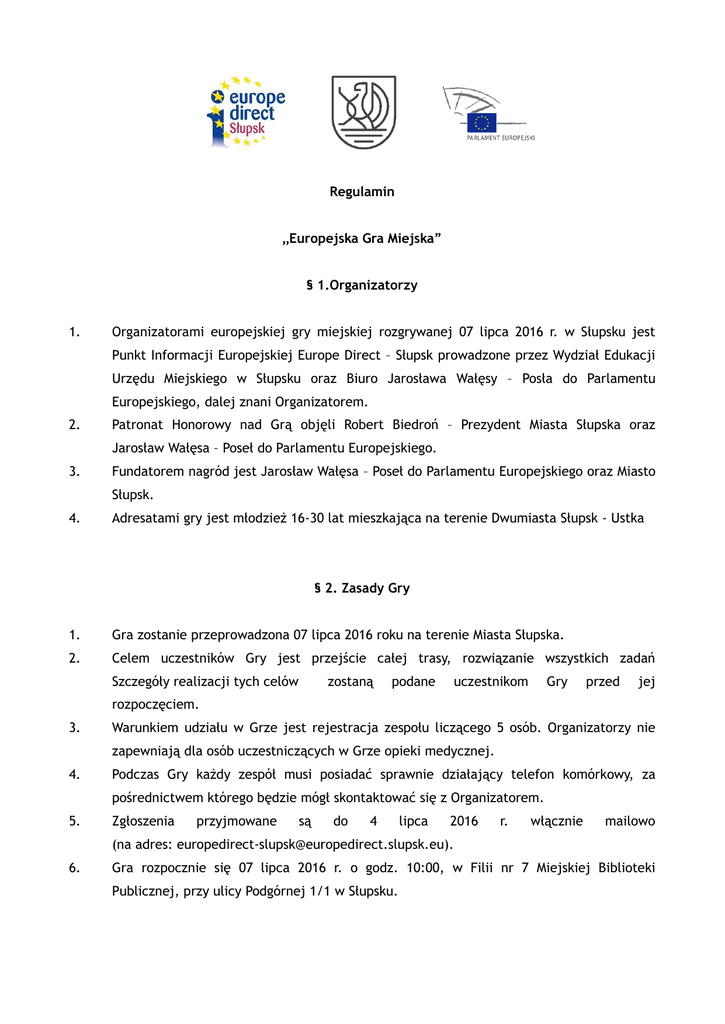 Regulamin „Europejska Gra Miejska” § 1.Organizatorzy 1. Organizatorami europejskiej gry miejskiej rozgrywanej 07 lipca 2016 r. w Słupsku jest Punkt Informacji Europejskiej Europe Direct – Słupsk prowadzone przez Wydział Edukacji Urzędu Miejskiego w Słupsku oraz Biuro Jarosława Wałęsy – Posła do Parlamentu Europejskiego, dalej znani Organizatorem. 2. Patronat Honorowy nad Grą objęli Robert Biedroń – Prezydent Miasta Słupska oraz Jarosław Wałęsa – Poseł do Parlamentu Europejskiego. 3. Fundatorem nagród jest Jarosław Wałęsa – Poseł do Parlamentu Europejskiego oraz Miasto Słupsk. 4. Adresatami gry jest młodzież 16-30 lat mieszkająca na terenie Dwumiasta Słupsk - Ustka § 2. Zasady Gry 1. Gra zostanie przeprowadzona 07 lipca 2016 roku na terenie Miasta Słupska. 2. Celem uczestników Gry jest przejście całej trasy, rozwiązanie wszystkich zadań Szczegóły realizacji tych celów zostaną podane uczestnikom Gry przed jej rozpoczęciem. 3. Warunkiem udziału w Grze jest rejestracja zespołu liczącego 5 osób. Organizatorzy nie zapewniają dla osób uczestniczących w Grze opieki medycznej. 4. Podczas Gry każdy zespół musi posiadać sprawnie działający telefon komórkowy, za pośrednictwem którego będzie mógł skontaktować się z Organizatorem. 5. Zgłoszenia przyjmowane są do 4 lipca 2016 r. włącznie mailowo (na adres: [email protected]). 6. Gra rozpocznie się 07 lipca 2016 r. o godz. 10:00, w Filii nr 7 Miejskiej Biblioteki Publicznej, przy ulicy Podgórnej 1/1 w Słupsku. 7. Planowane zakończenie Gry 07 lipca 2016 r. o godz. 14:00. Po tym terminie Zespoły zobowiązane są niezwłocznie udać się na metę Gry, która znajdować się będzie w Urzędzie Miejskim w Słupsku. 8. Podczas Gry Zespoły będą wykonywać zadania, za które będą przyznawane punkty. 9. Uczestnicy gry, w trakcie jej trwania mogą się poruszać pieszo oraz komunikacją miejską (organizatorzy nie zapewniają biletów autobusowych). liczba uczestników w zespole W każdym punkcie kontaktowym będzie weryfikowana z liczbą graczy oznaczoną na Karcie. W razie niezgodności zespół może zostać zdyskwalifikowany. 10. W przypadku naruszenia regulaminu Gry przez uczestnika lub zespół, złamania zasad fair play, utrudniania gry innym graczom bądź niszczenia wskazówek, w dowolnym momencie Organizatorzy mają prawo odebrania Zespołowi Karty i wykluczenia go z Gry. Decyzja Organizatorów w tej kwestii jest ostateczna. 11. Poprzez nadesłanie zgłoszenia do udziału w Grze uczestnik wyraża zgodę na: wzięcie udziału w Grze na warunkach określonych w niniejszym regulaminie. § 3. Wyłanianie zwycięzców 1. Wygrywa Zespół, który jako pierwszy dotrze na metę z kompletem rozwiązanych zadań. 2. O kolejnych miejscach w klasyfikacji będą decydowały zdobyte przez Zespoły punkty. W sprawach niejasnych decyzja o przyznaniu miejsca należy do Organizatora. § 4. Nagrody 1. Dla dwóch pierwszych zespołów przewidziano nagrodę główną, wizytę studyjną w Parlamencie Europejskim w Brukseli, ufundowaną przez Jarosława Wałęsę – Posła do Parlamentu Europejskiego. 2. Dla pozostałych Zespołów przewidziano nagrody rzeczowe ufundowane przez Punkt Informacji Europejskiej Europe Direct - Słupsk. § 5. Postanowienia końcowe 1. W kwestiach dotyczących przebiegu Gry, nieprzewidzianych niniejszym regulaminem, głos rozstrzygający należy do Organizatora. 2. Organizatorzy zastrzegają sobie prawo wprowadzenia zmian w regulaminie.