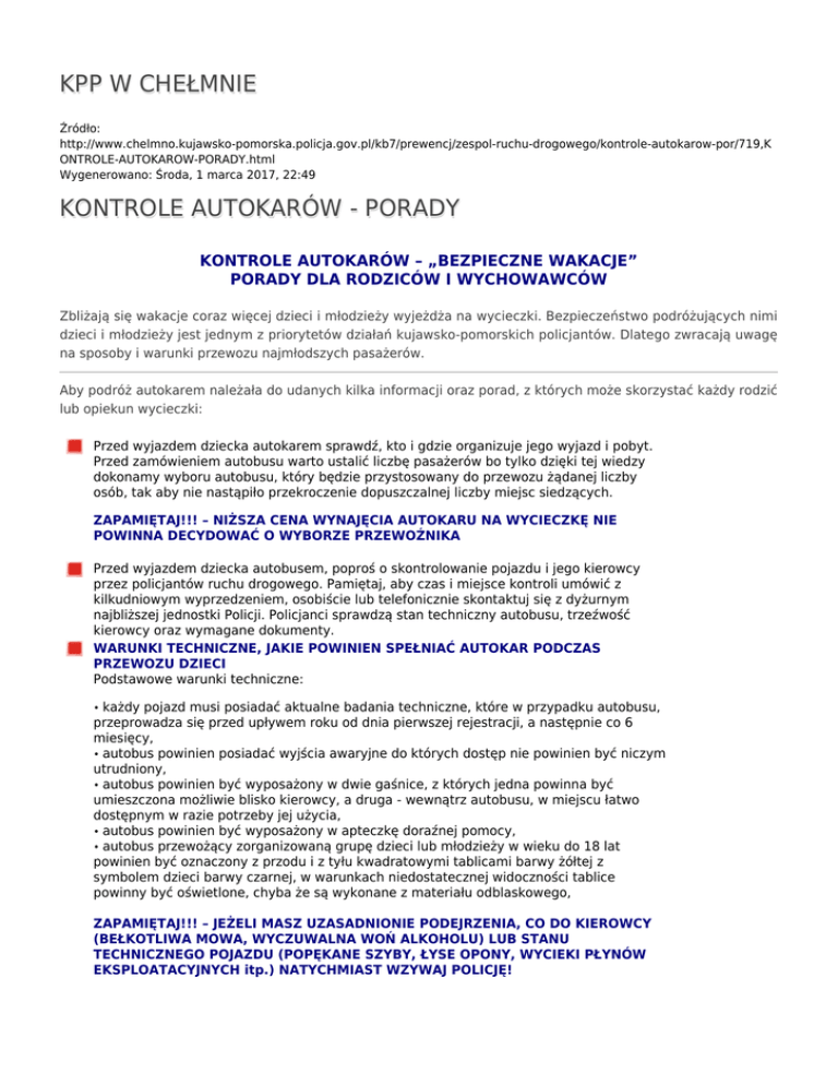 KPP W CHEŁMNIE Źródło: http://www.chelmno.kujawsko-pomorska.policja.gov.pl/kb7/prewencj/zespol-ruchu-drogowego/kontrole-autokarow-por/719,K ONTROLE-AUTOKAROW-PORADY.html Wygenerowano: Środa, 1 marca 2017, 22:49 KONTROLE AUTOKARÓW - PORADY KONTROLE AUTOKARÓW – „BEZPIECZNE WAKACJE” PORADY DLA RODZICÓW I WYCHOWAWCÓW Zbliżają się wakacje coraz więcej dzieci i młodzieży wyjeżdża na wycieczki. Bezpieczeństwo podróżujących nimi dzieci i młodzieży jest jednym z priorytetów działań kujawsko-pomorskich policjantów. Dlatego zwracają uwagę na sposoby i warunki przewozu najmłodszych pasażerów. Aby podróż autokarem należała do udanych kilka informacji oraz porad, z których może skorzystać każdy rodzić lub opiekun wycieczki: Przed wyjazdem dziecka autokarem sprawdź, kto i gdzie organizuje jego wyjazd i pobyt. Przed zamówieniem autobusu warto ustalić liczbę pasażerów bo tylko dzięki tej wiedzy dokonamy wyboru autobusu, który będzie przystosowany do przewozu żądanej liczby osób, tak aby nie nastąpiło przekroczenie dopuszczalnej liczby miejsc siedzących. ZAPAMIĘTAJ!!! – NIŻSZA CENA WYNAJĘCIA AUTOKARU NA WYCIECZKĘ NIE POWINNA DECYDOWAĆ O WYBORZE PRZEWOŹNIKA Przed wyjazdem dziecka autobusem, poproś o skontrolowanie pojazdu i jego kierowcy przez policjantów ruchu drogowego. Pamiętaj, aby czas i miejsce kontroli umówić z kilkudniowym wyprzedzeniem, osobiście lub telefonicznie skontaktuj się z dyżurnym najbliższej jednostki Policji. Policjanci sprawdzą stan techniczny autobusu, trzeźwość kierowcy oraz wymagane dokumenty. WARUNKI TECHNICZNE, JAKIE POWINIEN SPEŁNIAĆ AUTOKAR PODCZAS PRZEWOZU DZIECI Podstawowe warunki techniczne: • każdy pojazd musi posiadać aktualne badania techniczne, które w przypadku autobusu, przeprowadza się przed upływem roku od dnia pierwszej rejestracji, a następnie co 6 miesięcy, • autobus powinien posiadać wyjścia awaryjne do których dostęp nie powinien być niczym utrudniony, • autobus powinien być wyposażony w dwie gaśnice, z których jedna powinna być umieszczona możliwie blisko kierowcy, a druga - wewnątrz autobusu, w miejscu łatwo dostępnym w razie potrzeby jej użycia, • autobus powinien być wyposażony w apteczkę doraźnej pomocy, • autobus przewożący zorganizowaną grupę dzieci lub młodzieży w wieku do 18 lat powinien być oznaczony z przodu i z tyłu kwadratowymi tablicami barwy żółtej z symbolem dzieci barwy czarnej, w warunkach niedostatecznej widoczności tablice powinny być oświetlone, chyba że są wykonane z materiału odblaskowego, ZAPAMIĘTAJ!!! – JEŻELI MASZ UZASADNIONIE PODEJRZENIA, CO DO KIEROWCY (BEŁKOTLIWA MOWA, WYCZUWALNA WOŃ ALKOHOLU) LUB STANU TECHNICZNEGO POJAZDU (POPĘKANE SZYBY, ŁYSE OPONY, WYCIEKI PŁYNÓW EKSPLOATACYJNYCH itp.) NATYCHMIAST WZYWAJ POLICJĘ! Jeżeli kierowca, przewoźnik nie chce zgodzić się na kontrolę Policji (szantażuje, straszy, że nie będzie tak długo czekał na Policję, że zrezygnuje z wycieczki) to znak, że coś jest nie w porządku. ZAPAMIĘTAJ!!! - WARTO CZASAMI POCZEKAĆ GODZINĘ DŁUŻEJ NA PRZYJAZD POLICJI I SPAĆ SPOKOJNIE. WYCIECZKĘ MOŻNA POWTÓRZYĆ, LECZ SKUTKÓW WYPADKU DROGOWEGO JUŻ SIĘ NIE ODWRÓCI. Nad właściwym przebiegiem podróży powinni czuwać opiekunowie wycieczki. W przypadku wycieczek autokarowych z reguły jeden opiekun przypada na 15 osób. Miejsce przy drzwiach autobusu muszą zająć osoby dorosłe. Kierownik wycieczki zajmuje miejsce obok kierowcy. Przejścia w autokarze powinny być wolne, co umożliwia szybkie opuszczenie pojazdu w razie ewakuacji (wszystkie bagaże należy ulokować na półkach lub bagażniku autokaru). ZAPAMIĘTAJ!!! – W PRZEJŚCIACH AUTOBUSU NIE MOGĄ ZNAJDOWAC SIĘ DODATKOWE MIEJSCA SIEDZĄCE, A W CZASIE JAZDY DZIECI NIE MOGĄ SPACEROWAĆ PO AUTOBUSIE, STAWAĆ NA SIEDZENIACH, MIĘDZY SIEDZENIAMI I WYCHYLAĆ SIĘ PRZEZ OKNA. JEŻELI AUTOBUS JEST WYPOSAŻONY W PASY BEZPIECZEŃSTWA PRZEWOŻONE W NIM DZIECI MUSZĄ MIEĆ JE ZAPIĘTE. Ogromne znaczenie dla bezpieczeństwa podróżnych ma przestrzeganie przepisów o czasie pracy kierowcy. W trakcie jazdy należy organizować kilkunastominutowe przerwy na odpoczynek. Postoje te powinny być wyłącznie w miejscach do tego przeznaczonych. tj. na oznakowanych parkingach. W przypadku wycieczek wielogodzinnych przerwy należy organizować częściej, a przynajmniej raz zarządzić dłuższą przerwę - około jednej godziny na posiłek. ZAPAMIĘTAJ!!! – PO KAŻDEJ PRZERWIE W PODRÓŻY SPRAWDZIĆ STAN LICZEBNY DZIECI. Opiekunowie wycieczki są współodpowiedzialni za bezpieczeństwo przewożonych dzieci. W SYTUACJI, GDY KIERUJĄCY AUTOKAREM ŁAMIE ELEMENTARNE ZASADY BEZPIECZEŃSTWA (PRZEKRACZA DOZWOLONĄ PRĘDKOŚĆ, WYPRZEDZA NA TRZECIEGO, ROZMAWIA PRZEZ TELEFON KOMÓRKOWY itp.) NIE BĄDŹ BIERNYM OBSERWATOREM JEGO POCZYNAŃ - ZDECYDOWANIE ZWRÓĆ MU UWAGĘ. JEŻELI PO PODRÓŻY MASZ ZASTRZEŻENIA DO ZACHOWANIA KIEROWCY KONIECZNIE PRZEKAŻ JE PRZEWOŹNIKOWI. Dojeżdżając do miejsca przeznaczenia należy odpowiednio wcześniej poinformować dzieci o przygotowaniu się do wyjścia. Opiekunowie powinni zadbać, aby dzieci nie wybiegały spoza autokaru i po zakończeniu podróży w bezpieczny sposób poruszały się jako piesi. Przypominamy znak "dopuszczalne prędkości - D-39", informujący o dozwolonych prędkościach w Polsce: Źródło: KGP Autor: Publikacja: Ocena: 0/5 (0) Tweetnij