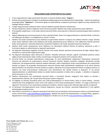 REGULAMIN ZAJĘĆ SPORTOWYCH DLA DZIECI 1. 2. 3. 4. 5. 6. 7. 8. 9. 10. 11. 12. 13. 14. 15. JF jest organizatorem zajęć sportowych dla dzieci na terenie Klubów (dalej: "Zajęcia"). Dziecko jest przyjmowane na Zajęcia na podstawie podpisanego przez przedstawiciela ustawowego – rodzica lub opiekuna prawnego (dalej: "Opiekuna") - Formularza zgody na udział dziecka w zajęciach sportowych. Zgoda musi być udzielona dla każdego dziecka osobno. Z Zajęć mogą korzystać wyłącznie dzieci, których Opiekun posiada aktywne członkostwo. Dziecku biorącemu udział w Zajęciach może towarzyszyć jeden Opiekun lub osoba upoważniona przez Opiekuna. W przypadku wątpliwości, co do wieku dziecka personel Klubu może poprosić o dokument potwierdzający datę urodzenia dziecka. Zajęcia odbywają się w przeznaczonych ku temu częściach Klubu. Dzieci nie mogą przebywać w częściach Klubu, w których nie odbywają się Zajęcia, w szczególności w saunie i w łaźni. Opiekun lub osoba upoważniona przez Opiekuna przyprowadza dziecko na Zajęcia oraz odbiera dziecko z Zajęć. Dziecko może zostać odebrane tylko przez Opiekuna lub osobę upoważnioną przez Opiekuna. Przy odbieraniu dziecka personel Klubu może poprosić o okazanie dokumentu tożsamości Opiekuna lub osoby upoważnionej przez Opiekuna. Opiekun bądź osoba upoważniona przez Opiekuna ma obowiązek odebrać dziecko do godziny wskazanej w pkt. 3 Formularza zgody na udział dziecka w zajęciach sportowych. Na Zajęciach obowiązuje wygodny strój do ćwiczeń oraz czyste obuwie sportowe przeznaczone do tego rodzaju Zajęć i zmienione w szatni przed rozpoczęciem Zajęć. Na Zajęciach obowiązuje zakaz ćwiczenia w biżuterii. Wszelkie łańcuszki, kolczyki, zegarki, bransoletki powinny zostać zdjęte przed rozpoczęciem Zajęć. Osoby uczestniczące w Zajęciach powinny mieć związane włosy. Personel Klubu nie posiada wykształcenia medycznego. W razie jakichkolwiek wątpliwości dotyczących sprawności fizycznej lub zdolności do wykonywania ćwiczeń fizycznych dziecka, Opiekun powinien zasięgnąć niezależnej porady medycznej i dla bezpieczeństwa wykonać badania lekarskie, celem stwierdzenia braku przeciwwskazań do uczęszczania dziecka na Zajęcia. W przypadku stwierdzonych schorzeń dziecka bądź jakichkolwiek wątpliwości co do stanu zdrowia dziecka Opiekun nie powinien kierować dziecka na Zajęcia. Zapisanie oraz przyprowadzenie dziecka na Zajęcia oznacza, że Opiekun nie widzi przeciwskazań medycznych oraz zdrowotnych dla udziału dziecka w Zajęciach. JF nie ponosi odpowiedzialności za jakiekolwiek szkody na osobie dziecka powstałe w trakcie lub w związku z udziałem w Zajęciach, jeżeli nie ponosi za nie winy. Opiekun zobowiązany jest powiadomić personel Klubu o chorobach dziecka, mogących mieć wpływ na zdrowie i bezpieczeństwo dziecka, jak i innych dzieci biorących udział w Zajęciach. Ze względu na zdrowie wszystkich dzieci oraz osób przebywających na terenie Klubu, dzieci w stanie infekcji, choroby zakaźnej lub innej dolegliwości, która może mieć wpływ na inne osoby przebywające w Klubie, nie mogą uczestniczyć w Zajęciach. Pracownicy JF po stwierdzeniu podejrzenia infekcji u dziecka mają prawo odmówić jego udziału w Zajęciach. W sprawach nieuregulowanych przez niniejszy Regulamin, stosuje się Umowę i pozostałe Regulaminy JF oraz ogólnie obowiązujące przepisy prawa. Warunkiem uczestnictwa w zajęciach sportowych dla dzieci jest wcześniejsze zarezerwowanie miejsca za pośrednictwem strony internetowej www.jatomifitness.pl/MyJatomi, aplikacji My Jatomi lub bezpośrednio w recepcji Klubu, zgodnie z Regulaminem rezerwacji zajęć grupowych dostępnym w Klubie oraz na stronie www.jatomifitness.pl/MyJatomi. Pure Health and Fitness Sp. z o.o. Prosta 69 Business Centre ul. Prosta 69 (III piętro) 00-838 Warszawa tel.: 22 379 77 79 fax: 22 242 89 89 ww.jatomifitness.pl