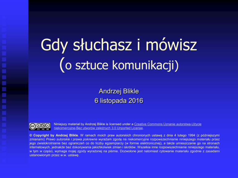 Gdy słuchasz i mówisz (o sztuce komunikacji) Andrzej Blikle 6 listopada 2016 Niniejszy materiał by Andrzej Blikle is licensed under a Creative Commons Uznanie autorstwa-Użycie niekomercyjne-Bez utworów zależnych 3.0 Unported License. © Copyright by Andrzej Blikle. W ramach moich praw autorskich chronionych ustawą z dnia 4 lutego 1994 (z późniejszymi zmianami) Prawo autorskie i prawa pokrewne wyrażam zgodę na niekomercyjne rozpowszechnianie niniejszego materiału przez jego zwielokrotnianie bez ograniczeń co do liczby egzemplarzy (w formie elektronicznej), a także umieszczanie go na stronach internetowych, jednakże bez dokonywania jakichkolwiek zmian i skrótów. Wszelkie inne rozpowszechnianie niniejszego materiału, w tym w części, wymaga mojej zgody wyrażonej na piśmie. Dozwolone jest natomiast cytowanie materiału zgodnie z zasadami ustanowionym przez w.w. ustawę. Uważność 6 lis 2016 © Andrzej Blikle, Gdy słuchasz i mówisz 2 Cztery sprawności społeczne 1. 2. 3. 4. 6 lis 2016 wiedzieć kiedy i jak ludzi słuchać, wiedzieć kiedy i jak z ludźmi rozmawiać, tak rozwiązywać konflikty, aby nikt nie poczuł się dotknięty z powodu porażki, zbudować i utrzymywać otwarty dialog z tymi, na których nam zależy. © Andrzej Blikle, Gdy słuchasz i mówisz 3 Aktywne słuchanie mowa ciała + szacunek + zrozumienie Ustawienie frontalne Szanuj strefę osobistą Kontakt wzrokowy Słuchaj Nie przerywaj Acha…, mm…, oo… 6 lis 2016 Najważniejsze emocje Pytania wyjaśniające Parafraza Klaryfikacja końcowa © Andrzej Blikle, Gdy słuchasz i mówisz 4 Zalety aktywnego słuchania 1. Informuje mówiącego, że słuchający zrozumiał jego stanowisko, choć może się z nim nie zgadzać. 2. Pomaga osłabić emocjonalną reakcję mówiącego. 3. Przynosi zmianę w nastawieniu słuchającego do mówiącego. Dlatego dwie uszy, jeden język dano, iżby mniej mówiono, a więcej słuchano. Przysłowie staropolskie 6 lis 2016 © Andrzej Blikle, Gdy słuchasz i mówisz 5 Asertywność Asertywny kontakt 1. stanowczość bez przemocy 2. łagodność bez uległości 3. techniki bez manipulacji słuchanie mówienie Asertywna postawa JA: szacunek, moje prawa, ochrona mojej godności TY: szacunek, twoje prawa, ochrona twojej godności Cztery asertywne sprawności sposób komunikowania sposób słuchania sposób argumentowania sposób bycia 6 lis 2016 - nadanie komunikatu, np. komunikat JA - tzw. aktywne słuchanie - dialog, dyskusja, konsensus - by w naszym towarzystwie ludzie czuli się dobrze; dawniej „ogłada towarzyska” © Andrzej Blikle, Gdy słuchasz i mówisz 6 Sytuacje komunikacyjne Trzy typy sytuacji komunikacyjnych pozytywne ― np. twoja praca została świetnie oceniona, neutralne ― np. złożono nam zamówienie na nową partię towaru, korygujące ― np. mam zastrzeżenia do twojego raportu. Trzy stopnie trudności komunikatów korygujących 1. chcemy zmienić czyjś sposób wykonywania zadań, 2. chcemy zmienić czyjś sposób zachowania, 3. chcemy zmienić czyjąś postawę. 6 lis 2016 © Andrzej Blikle, Gdy słuchasz i mówisz 7 Zasady asertywnego komunikowania Postępuj tak, aby twój rozmówca nie musiał się bronić. Zanim rozpoczniesz trudną rozmowę, postaraj się zobaczyć w twoim rozmówcy człowieka. Zamiast mówić komuś, jaki jest, skup się na skutkach jego działania. Zamiast mówić o tym, że coś jest źle, porozmawiajmy o tym, co może być lepiej. Zamiast wyrażać negatywne emocje, opowiedz o nich. Komunikat „JA” 6 lis 2016 © Andrzej Blikle, Gdy słuchasz i mówisz 8 Dwa rodzaje komunikatów korygujących KOMUNIKAT „TY” wyraża twoją pinię o kimś, stanowi ocenę np. jesteś źle wychowany KOMUNIKAT „JA” wyraża twoje uczucia, nie stanowi oceny np. twoje zachowanie okropnie mnie irytuje Komunikat „JA” jest apelem o pomoc i to tłumaczy jego niezwykłą skuteczność W sytuacjach bezkonfliktowych komunikat „TY” może być całkowicie na miejscu 6 lis 2016 © Andrzej Blikle, Gdy słuchasz i mówisz 9 Komunikat „JA” zamieniaj obelgi w zwierzenia Zamiast mówić o tym jaki kto jest, mówimy o naszych uczuciach i emocjach. Nie atakujemy, a więc nie prowokujemy obrony. Nie można się z nami spierać. Prosimy o pomoc, co jest wyrazem zaufania. Jedynie w trudnych sytuacjach korygujących! Kiedy ludzie nie chcą się zmienić, na ogół nie ma sensu bombardować ich dalszymi komunikatami „JA”; trzeba raczej szybko przejść do aktywnego słuchania. 6 lis 2016 © Andrzej Blikle, Gdy słuchasz i mówisz 10 Składowe komunikatu emocjonalnego 1. treść, 2. intonacja i brzmienie głosu, stosowanie pauz 3. mowa ciała: mimika, gesty, postawa, wygląd zewnętrzny. Gdy słuchamy, nawet w milczeniu (!), zawsze komunikujemy nasze emocje mową ciała 6 lis 2016 © Andrzej Blikle, Gdy słuchasz i mówisz 11 Krytyka 6 lis 2016 © Andrzej Blikle, Gdy słuchasz i mówisz 12 Dwa modele krytyki PROKURATOR Udowodnić winę Oczekiwany bieg wypadków: zachowanie niewłaściwe → oskarżenie → poczucie winy → zachowanie właściwe Rzeczywisty bieg wypadków: zach. niewłaściwe → oskarżenie → poczucie zagrożenia → zach. obronne COACH Zmienić zachowanie Metoda coacha: zach. niewłaściwe → analiza przyczyn → usunięcie przyczyn → zach. właściwe 6 lis 2016 © Andrzej Blikle, Gdy słuchasz i mówisz 13 Porzuć rolę prokuratora Prokurator Coach Wyraża opinie, ocenia Opisuje fakty i ich konsekwencje Posługuje się aluzją Mówi wprost Mówi o winie Mówi o skutkach Zmusza do utraty twarzy Pomaga w jej zachowaniu Mówi o winie i karze Mówi o zmianie Twój raportwydaję jest nieakceptowalny. Niektórym się, że można Z twojej winy firma straciła Brak ci odpowiedzialności. Zachowałeś się całkowicie lekceważyć obowiązki. Musisz się liczyć z utratą premii. kontrahenta! nieodpowiedzialnie. Zabrakło rynku, raportowi preferencji Chyba niebadań poświęciłeś Nie podpisaliśmy kontraktu, a to może kons