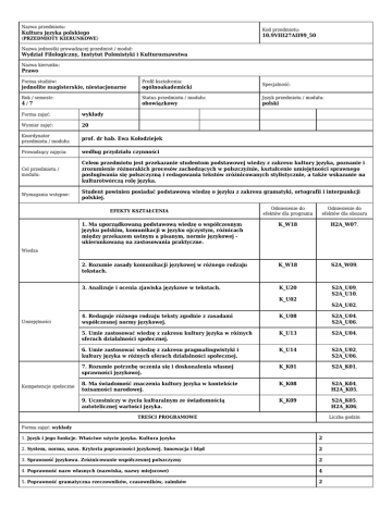 Nazwa przedmiotu: Kod przedmiotu: Kultura języka polskiego 10.9VIII27AII99_50 (PRZEDMIOTY KIERUNKOWE) Nazwa jednostki prowadzącej przedmiot / moduł: Wydział Filologiczny, Instytut Polonistyki i Kulturoznawstwa Nazwa kierunku: Prawo Forma studiów: Profil kształcenia: jednolite magisterskie, niestacjonarne ogólnoakademicki Rok / semestr: 4/7 Status przedmiotu / modułu: Język przedmiotu / modułu: obowiązkowy polski Specjalność: Forma zajęć: wykłady Wymiar zajęć: 20 Koordynator przedmiotu / modułu: prof. dr hab. Ewa Kołodziejek Prowadzący zajęcia: według przydziału czynności Cel przedmiotu / modułu: Celem przedmiotu jest przekazanie studentom podstawowej wiedzy z zakresu kultury języka, poznanie i zrozumienie różnorakich procesów zachodzących w polszczyźnie, kształcenie umiejętności sprawnego posługiwania się polszczyzną i redagowania tekstów zróżnicowanych stylistycznie, a także wskazanie na kulturotwórczą rolę języka. Wymagania wstępne: Student powinien posiadać podstawową wiedzę o języku z zakresu gramatyki, ortografii i interpunkcji polskiej. Odniesienie do efektów dla programu Odniesienie do efektów dla obszaru 1. Ma uporządkowaną podstawową wiedzę o współczesnym języku polskim, komunikacji w języku ojczystym, różnicach między przekazem ustnym a pisanym, normie językowej ukierunkowaną na zastosowania praktyczne. K_W18 H2A_W07, 2. Rozumie zasady komunikacji językowej w różnego rodzaju tekstach. K_W18 S2A_W09, 3. Analizuje i ocenia zjawiska językowe w tekstach. K_U20 S2A_U09, S2A_U10, EFEKTY KSZTAŁCENIA Wiedza K_U02 S2A_U02, Umiejętności Kompetencje społeczne 4. Redaguje różnego rodzaju teksty zgodnie z zasadami współczesnej normy językowej. K_U08 S2A_U04, S2A_U06, 5. Umie zastosować wiedzę z zakresu kultury języka w różnych sferach działalności społecznej. K_U13 S2A_U04, 6. Umie zastosować wiedzę z zakresu pragmalingwistyki i kultury języka w różnych sferach działalności społecznej. K_U14 S2A_U02, S2A_U06, 7. Rozumie potrzebę uczenia się i doskonalenia własnej sprawności językowej. K_K01 S2A_K01, 8. Ma świadomość znaczenia kultury języka w kontekście tożsamości narodowej. K_K08 S2A_K04, H2A_K05, 9. Uczestniczy w życiu kulturalnym ze świadomością autotelicznej wartości języka. K_K09 S2A_K05, H2A_K06, TREŚCI PROGRAMOWE Liczba godzin Forma zajęć: wykłady 1. Język i jego funkcje. Właściwe użycie języka. Kultura języka 2 2. System, norma, uzus. Kryteria poprawności językowej. Innowacja i błąd 2 3. Sprawność językowa. Zróżnicowanie współczesnej polszczyzny 2 4. Poprawność nazw własnych (nazwiska, nazwy miejscowe) 4 5. Poprawność gramatyczna rzeczowników, czasowników, zaimków 2 6. Poprawność składniowa, składnia liczebników 4 7. Poprawnośc leksykalna: zapożyczenia i wyrazy modne 2 8. Problemy polskiej ortografii 2 Metody kształcenia Wykład informacyjny połączony z metodą aktywizującą w formie dyskusji dydaktycznej. Nr efektu kształcenia z sylabusa Metody weryfikacji efektów kształcenia Forma i warunki zaliczenia * sprawdzian 1,2,3,4,5,6, * zajęcia praktyczne (weryfikacja poprzez obserwację) 7,8,9, Sprawdzian w formie testu z poprawności językowej, pytania otwarte z treści programowych. O ocenie decyduje liczba błędów językowych w teście i liczba uzyskanych punktów za pytania otwarte w skali: 3 błędy i 6 pkt - ocena bdb, 13 błędów i 0 pkt - ocena ndst Ocenę z przedmiotu stanowi ocena uzyskana ze sprawdzianu. Literatura podstawowa Markowski A. (red) (2008): Wielki słownik poprawnej polszczyzny. PWN, Warszawa Markowski A. (2005): Kultura języka polskiego. Teoria. Zagadnienia leksykalne. PWN, Warszawa Jadacka H. (2005): Kultura języka polskiego. Fleksja, słowotwórstwo, składnia. PWN, Warszawa Kołodziejek E. (2010): Walczymy z bykami. PWN, Warszawa Polański E. (red.) (2008): Wielki słownik ortograficzny. PWN, Warszawa Literatura uzupełniająca Miodek J. (2002): Słownik ojczyzny polszczyzny. Europa, Wrocław Miodek J. (2007): Słowo jest w człowieku. Wyd. Dolnośląskie, Wrocław Geller E., Dąbrówka A. (2007): Słownik stylistyczny jezyka polskiego. Świat Książki, Warszawa NAKŁAD PRACY STUDENTA: Liczba godzin Zajęcia dydaktyczne 20 Udział w konsultacjach 10 Zdawanie egzaminu lub/i zaliczenia 2 Przygotowanie się do zajęć 20 Studiowanie literatury 40 Przygotowanie się do egzaminu lub/i zaliczenia 8 ŁĄCZNY nakład pracy studenta w godz. 100 Liczba punktów ECTS 4
