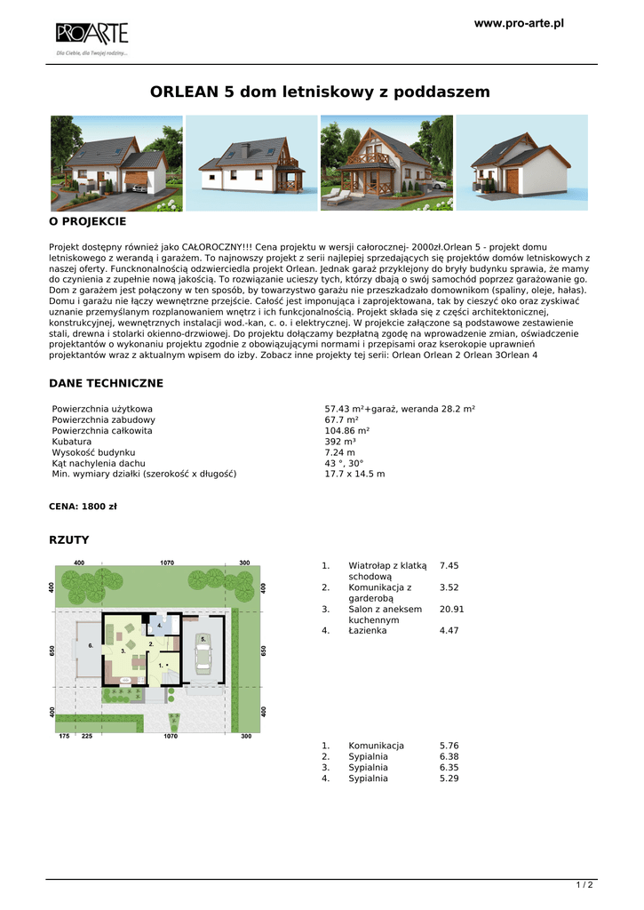 www.pro-arte.pl ORLEAN 5 dom letniskowy z poddaszem O PROJEKCIE Projekt dostępny również jako CAŁOROCZNY!!! Cena projektu w wersji całorocznej- 2000zł.Orlean 5 - projekt domu letniskowego z werandą i garażem. To najnowszy projekt z serii najlepiej sprzedających się projektów domów letniskowych z naszej oferty. Funcknonalnością odzwierciedla projekt Orlean. Jednak garaż przyklejony do bryły budynku sprawia, że mamy do czynienia z zupełnie nową jakością. To rozwiązanie ucieszy tych, którzy dbają o swój samochód poprzez garażowanie go. Dom z garażem jest połączony w ten sposób, by towarzystwo garażu nie przeszkadzało domownikom (spaliny, oleje, hałas). Domu i garażu nie łączy wewnętrzne przejście. Całość jest imponująca i zaprojektowana, tak by cieszyć oko oraz zyskiwać uznanie przemyślanym rozplanowaniem wnętrz i ich funkcjonalnością. Projekt składa się z części architektonicznej, konstrukcyjnej, wewnętrznych instalacji wod.-kan, c. o. i elektrycznej. W projekcie załączone są podstawowe zestawienie stali, drewna i stolarki okienno-drzwiowej. Do projektu dołączamy bezpłatną zgodę na wprowadzenie zmian, oświadczenie projektantów o wykonaniu projektu zgodnie z obowiązującymi normami i przepisami oraz kserokopie uprawnień projektantów wraz z aktualnym wpisem do izby. Zobacz inne projekty tej serii: Orlean Orlean 2 Orlean 3Orlean 4 DANE TECHNICZNE Powierzchnia użytkowa Powierzchnia zabudowy Powierzchnia całkowita Kubatura Wysokość budynku Kąt nachylenia dachu Min. wymiary działki (szerokość x długość) 57.43 m²+garaż, weranda 28.2 m² 67.7 m² 104.86 m² 392 m³ 7.24 m 43 °, 30° 17.7 x 14.5 m CENA: 1800 zł RZUTY 1. 7.45 4. Wiatrołap z klatką schodową Komunikacja z garderobą Salon z aneksem kuchennym Łazienka 1. 2. 3. 4. Komunikacja Sypialnia Sypialnia Sypialnia 5.76 6.38 6.35 5.29 2. 3. 3.52 20.91 4.47 1/2 www.pro-arte.pl tel. (32) 43-50-829, 502 575 920, [email protected], www.pro-arte.pl 2/2 Powered by TCPDF (www.tcpdf.org)