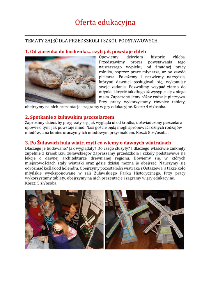 Oferta edukacyjna TEMATY ZAJĘĆ DLA PRZEDSZKOLI I SZKÓŁ PODSTAWOWYCH 1. Od ziarenka do bochenka... czyli jak powstaje chleb Opowiemy dzieciom historię chleba. Przedstawimy proces powstawania tego najstarszego wypieku, od żmudnej pracy rolnika, poprzez pracę młynarza, aż po zawód piekarza. Pokażemy i nazwiemy narzędzia, którymi dawniej posługiwali się, wykonując swoje zadania. Pozwolimy wsypać ziarno do młynka i kręcić tak długo aż wysypie się z niego mąka. Zaprezentujemy różne rodzaje pieczywa. Przy pracy wykorzystamy również tablety, obejrzymy na nich prezentacje i zagramy w gry edukacyjne. Koszt: 4 zł/osoba. 2. Spotkanie z żuławskim pszczelarzem Zaprosimy dzieci, by przyjrzały się, jak wygląda ul od środka, doświadczony pszczelarz opowie o tym, jak powstaje miód. Nasi goście będą mogli spróbować różnych rodzajów miodów, a na koniec uraczymy ich miodowym przysmakiem. Koszt: 8 zł/osoba. 3. Po Żuławach hula wiatr, czyli co wiemy o dawnych wiatrakach Dlaczego je budowano? Jak wyglądały? Do czego służyły? I dlaczego właściwie zniknęły zupełnie z krajobrazu żuławskiego? Zapraszamy przedszkola i szkoły podstawowe na lekcję o dawnej architekturze drewnianej regionu. Dowiemy się, w których miejscowościach stały wiatraki oraz gdzie dzisiaj można je obejrzeć. Nauczymy się odróżniać koźlak od holendra. Obejrzymy pozostałości wiatraka z Ostaszewa, a także koło młyńskie wyeksponowane w sali Żuławskiego Parku Historycznego. Przy pracy wykorzystamy tablety, obejrzymy na nich prezentacje i zagramy w gry edukacyjne. Koszt: 5 zł/osoba. 4. Drewniane domy żuławskie Jak wglądały domy dawnych Żuławiaków? Kto je budował? Dlaczego były tak duże? Co to jest podcień, kolumny, laubzekin – tego wszystkiego można się dowiedzieć podczas lekcji muzealnej w Żuławskim Parku Historycznym. W trakcie zajęć obejrzymy prezentację na tabletach, zagramy w gry edukacyjne, wykonamy e-plakaty w oparciu o zdjęcia eksponatów Żuławskiego Parku Historycznego. Na koniec każdy wykona własny witraż, wzorowany na motywach zdobniczych tradycyjnego domu żuławskiego. Koszt: 5 zł/osoba. Legendy Żuław i Mierzei Wiślanej Mamy dla Państwa dwie propozycje: 5. Legenda o księżniczce Tudze Dzieci wysłuchują legendy, uczą się porządkować zasłyszane fakty, poznają elementy historii regionu. Porozmawiamy z nimi o tym, co to jest legenda i dlaczego właściwie powstała, obejrzymy razem przedwojenną makietę Nowego Dworu Gdańskiego i sprawdzimy, ile w legendzie jest prawdy. Zaproponujemy dzieciom zabawę w tworzenie kolorowej rzeki z użyciem ciastoliny. A do domu, przedszkola lub szkoły zabiorą kolorowanki przedstawiające poznaną legendę, wykonane przez znanego historyka sztuki i artystę plastyka Jerzego Domino. Koszt: 5 zł/osoba. 6. Legenda o strażniku wałowym Poprzez poznanie legendy o Strażniku wałowym z Koźlin dzieci dowiadują się o problemie ochrony przeciwpowodziowej na Żuławach. Następnie w formie prezentacji multimedialnej poznają elementy historii regionu. Dowiadują się, dlaczego budowano wały przeciwpowodziowe, terpy, poldery, śluzy. Zagrają w grę edukacyjną na tablecie, by utrwalić zdobytą wiedzę. Na koniec własnoręcznie ulepią wał z ciastoliny Play Doh. Koszt: 5 zł/osoba. TEMATY ZAJĘĆ DLA SZKÓŁ GIMNAZJALNYCH I PONADGIMNAZJALNYCH 1. Ździebko prawdy Uczestnicy zajęć będą mieli możliwość zetknąć się z dawnymi żuławskimi przekazami ludowymi w ich surowej, pierwotnej formie. Wygrzebane z dawnych kronik, odkurzone i przetłumaczone z języka niemieckiego na polski, mogą dziś posłużyć do tego, by dowiedzieć się więcej o dawnych Żuławach, a także by zrozumieć różnicę pomiędzy bajką, podaniem i legendą. Stare opowieści są też dobrym punktem wyjścia, by stworzyć komiks w wersji tradycyjnej lub elektronicznej. Koszt: 4 zł/os. 2. Nowy Dwór Gdański - stolica Żuław Uczestnicy zajęć, posługując się laminami, stworzą linię czasu, przedstawiającą dzieje Nowego Dworu Gdańskiego. Następnie poszukają informacji na ekspozycji muzealnej, by potwierdzić właściwą kolejność, skorygować błędy. Używając tabletów przygotują e-plakat o symbolach stolicy Żuław. Koszt: 4 zł/os. 3. Gdzie pomieścimy tyle wody? Jak się zachować przed w trakcie i po powodzi? Co należy przygotować na każdym z tych etapów? Uczestnicy zajęć, podzieleni na grupy, dostaną do dyspozycji elektroniczną lub tradycyjną wersję tablic edukacyjnych, z których mogą czerpać informacje niezbędne do wykonania zadania. Efektem pracy ma być sformułowanie 5 zasad bezpiecznego zachowania przed, w trakcie i po powodzi. Uzupełnieniem lekcji (należy doliczyć ok. pół godziny) może być warsztat budowania tymczasowego wału przeciwpowodziowego (zajęcia przed muzeum). Koszt: bez warsztatu 4 zł/os., z warsztatem 6 zł/os. 4. Wielokulturowe Żuławy Uczestnicy zajęć, w oparciu o muzealne ekspozycje, poznają informacje o różnych grupach narodowościowych i wyznaniowych, które przez wieki tworzyły Żuławy i kształtowały ich krajobraz kulturowy. Wyposażeni w tablety, odszukają umieszczone w różnych miejscach ekspozycji kody QR. W oparciu o zdobyte informacje, stworzą mapy mentalne, dotyczące wielokulturowości Żuław. Koszt: 4 zł/os. WARSZTATY Tajemnice Żuław (dwa bloki tematyczne: ochrona przeciwpowodziowa, architektura żuławska). Zajęcia odbywają się w dwóch grupach, które na zmianę uczestniczą w blokach tematycznych: ochrona przeciwpowodziowa, architektura żuławska. Uczestnicy zajęć poznają legendę o strażniku wałowym i problem powodzi na Żuławach, w plastikowych pudełkach wykonają symulację powodzi. W drugiej części zajęć przyjrzą się uważnie m.in. domom podcieniowym, poszukają elementów zdobniczych domów drewnianych oraz wykonają papierowy witraż w oparciu o żuławskie laubzekiny. Czas: min. 1,5 godz., ko