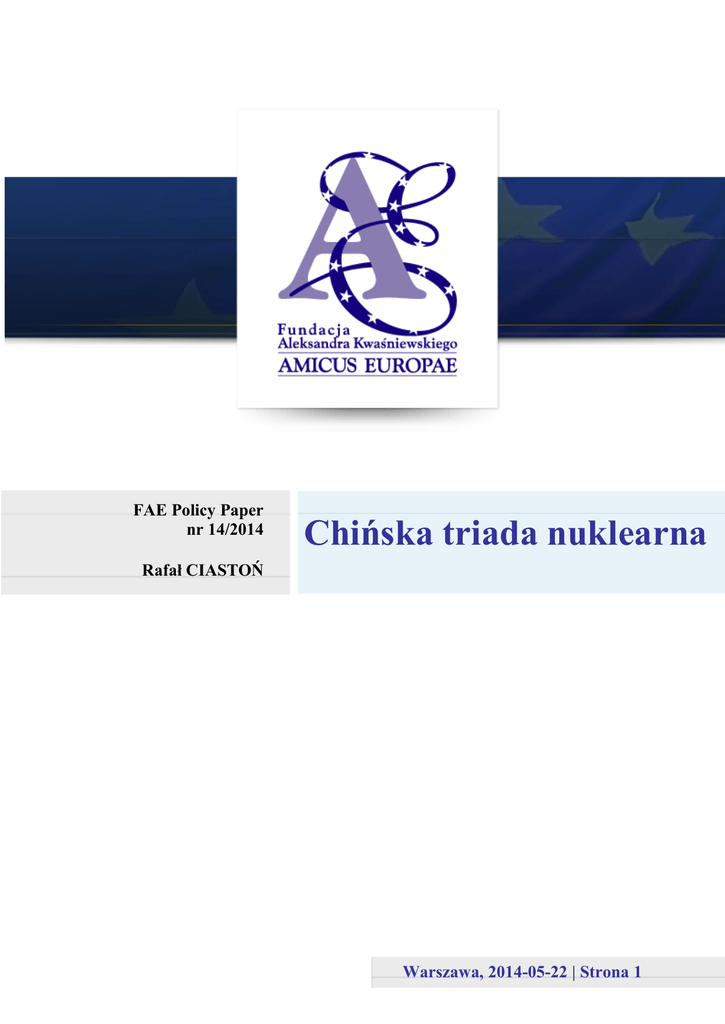 FAE Policy Paper nr 14/2014 Chińska triada nuklearna Rafał CIASTOŃ Warszawa, 2014-05-22 | Strona 1 Chińska triada nuklearna FAE Policy Paper nr 14/2014 Rafał Ciastoń Według Wywiadu US Navy (ONI, Office of Naval Intelligence) pierwszy chiński strategiczny nuklearny okręt podwodny (SSBN) klasy Jin (typ 095) wyjdzie na patrol bojowy jeszcze w 2014 r.. Tym samym Chińska Republika Ludowa ukończy proces budowania strategicznej triady jądrowej, trwający pół wieku (Chiny zdetonowały swój pierwszy ładunek jądrowy w 1964 r.). Wydarzenie to stanowi dobrą okazję do przyjrzenia się nie tylko potencjałowi nuklearnemu Pekinu, ale także głównym trendom jego rozwoju. Długi marsz Chiny to dziś jedyne z państw nuklearnej „Wielkiej Piątki” (USA, ZSRR/FR, Wielka Brytania, Francja, ChRL), które w kategoriach ilościowych rozbudowuje swój arsenał. Według zachodnich szacunków, składa się on z ok. 250 głowic, z czego ok. 190 pozostaje w gotowości operacyjnej, reszta zaś oczekuje na utylizację lub przeznaczone dla nich nośniki, m.in. znajdujące się ciągle w fazie testów rakiety balistyczne bazowania morskiego (SLBM) typu JL-2. Chińska triada opiera się w głównej mierze na pociskach balistycznych bazowania lądowego, wg autorów Bulletin of the Atomic Scientists, H.M. Kristensena i R.S. Norrisa, w ten sposób przenoszonych jest ok. 150 głowic, z czego ok. 60 stanowią głowice pocisków międzykontynentalnych (ICBM), ok. 88 głowice pocisków średniego zasięgu (MRBM). Prawdopodobnie głowice „A” są przenoszone także przez pociski bliskiego zasięgu (SRBM) typu DF-15,1 jednak ich liczba nie jest znana. Podobnie rzecz ma się z wprowadzanymi obecnie do linii pociskami manewrującymi dalekiego zasięgu (LACM, zasięg ok. 1500 km) DH-10,2 dla których obok głowicy konwencjonalnej przypuszczalnie opracowana została także głowica jądrowa. Około 40 głowic (bomb grawitacyjnych) przypisanych jest do bombowców dalekiego zasięgu H-6 (wersja radzieckiego Tu-16) oraz myśliwców niesprecyzowanego bliżej Ogółem ok. 100 wyrzutni. Wg Kristensena i Norrisa Chiny posiadają dziś ok. 250 lądowych wyrzutni DH-10, przy czym liczbę tą należy odnosić do ilości kontenerów startowych (po 3 na wyrzutni). The Military Balance 2014 podaje mniejszą wartość - 54 wyrzutnie, w dwóch brygadach rakietowych. 1 2 Warszawa, 2014-05-22 | Strona 2 Chińska triada nuklearna FAE Policy Paper nr 14/2014 Rafał Ciastoń typu. Wreszcie, 48 ładunków to głowice pocisków SLBM, przy czym jak zostało to nadmienione powyżej, nie są one dziś w stanie gotowości operacyjnej. 3 Do ogólnej liczby ok. 190 głowic (148 na pociskach balistycznych, kolejnych 40 przenoszonych przez samoloty) autorzy nie wliczają głowic przeznaczonych dla SRBM oraz LACM, ograniczając się jedynie do stwierdzenia, iż takie głowice najprawdopodobniej istnieją, należy zatem przyjąć, iż liczba 190 ładunków może być zaniżona i w praktyce Chiny mogą dysponować ponad 200 głowicami o statusie operacyjnym. Departament Stanu w swym dorocznym raporcie na temat chińskich zdolności obronnych4 szacuje, iż ChRL posiada od 50 do 75 ICBM czterech typów: DF-4, DF-5, DF-31 oraz DF-31A, nie precyzuje jednak, ile dokładnie pocisków każdego z ww. typów znajduje się w posiadaniu Drugiego Korpusu Artylerii. Ponieważ podawane dane różnią się nieco w zależności od źródła, poniższa tabela przedstawia zestawienie opracowane na podstawie czterech z nich, tj. cytowanego już Bulletin of the Atomic Scientists, The Military Balance 2014, opracowanego przez National Air and Space Intelligence Center raportu Ballistic & Cruise Missile Threat oraz World Defence Almanac 2013 (dane dot. zasięgu podawane są za pierwszym z wymienionych źródeł). Typ rakiety i jej zasięg The Military Balance 2014 Ballistic & Cruise Missile Threat World Defence Almanac 2013 DF-4 (5.500 km) Bulletin of the Atomic Scientists ok. 12 ok. 10 10-15 10 (traktowane jako IRBM) DF-5 (13.000 km) ok. 20 ok. 20 ok. 20 20 DF-31 (7.000 km) DF-31A (11.000 km) ok. 8 ok. 20 ok. 12 ok. 24 5-10 > 15 < 15 niewielka liczba Dwanaście z nich to głowice do pocisków JL-1, które najprawdopodobniej zostaną zutylizowane, pozostałe 36 będzie przenoszone przez rakiety JL-2, gdy tylko zostaną one ostatecznie wprowadzone do służby. 4 Annual Report to Congress. Military and Security Developments Involving the People’s Republic of China 2013. 3 Warszawa, 2014-05-22 | Strona 3 Chińska triada nuklearna FAE Policy Paper nr 14/2014 Rafał Ciastoń Podobne rozbieżności dotyczą także rakiet balistycznych średniego i krótkiego zasięgu: 5 Typ pocisku i jego zasięg Bulletin of the Atomic Scientists The Military Balance 2014 DF-3 (3.000 km) DF-21 (mod. 1 i 2: ok. 2.150 km) DF-15 (600 km) ok. 8 ok. 80 ok. 6 ok. 80 Ballistic & Cruise Missile Threat 5-10 <100 ok. 100 ok. 144 b.d. World Defence Almanac 2013 nie uwzględnione ok. 60 (tylko mod.2) 100-150 Cytowane powyżej źródła nie wymieniają dwóch opracowywanych aktualnie w Państwie Środka pocisków: ICBM DF-41 (zasięg 11.000-12.000 km) oraz IRBM DF-26 (3.500 km). Pierwsza z wymienionych konstrukcji przeszła jak dotąd najprawdopodobniej dwa testy (w 2012 i 2013 r.), druga znajduje się jeszcze w fazie konstrukcyjnej. Obydwie przystosowane są do odpalania z wyrzutni samochodowych (TEL). Pocisk DF-41 ma być zdolny do przenoszenia do 10 głowic jądrowych (układ MIRV), 6 DF-26 będzie zaś mógł przenosić zarówno ładunki jądrowe, jak i konwencjonalne, w tym prawdopodobnie również głowice manewrujące (MaRV). Chińskie bombowce dalekiego zasięgu H-67 są konstrukcyjnie przestarzałe i pomimo modernizacji nie pełnią funkcji strategicznej, w ich zasięgu jednak pozostaje znaczna część regionu Azji Wschodniej, Południowej i Południowo-Wschodniej. Ponadto, ich rola może ulec wzmocnieniu po opracowaniu pocisku manewrującego DH-20, dzięki któremu będą one mogły