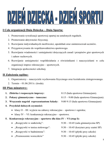 I Cele organizacji Dnia Dziecka – Dnia Sportu: 1. Promowanie rywalizacji sportowej opartej na ustalonych regułach. 2. Promowanie aktywności fizycznej. 3. Rozwijanie indywidualnych możliwości, upodobań oraz zainteresowań uczniów. 4. Przygotowywanie do współzawodnictwa sportowego. 5. Rozwijanie wiadomości i umiejętności dotyczących zasad i przepisów gier sportowych i zabaw ruchowych. 6. Rozwijanie umiejętności współdziałania z rówieśnikami i nauczycielami w celu organizacji imprez rekreacyjno – sportowych. 7. Integracja społeczności szkolnej. II Założenia ogólne: 1. Organizatorzy – nauczyciele wychowania fizycznego oraz kształcenia zintegrowanego. 2. Termin – 01.06.2011r. (środa). III Plan minutowy: 1. Zbiórka i rozpoczęcie imprezy: 8:15 (hala sportowa Gimnazjum). 2. Pokazy gimnastyczno – taneczne: 8:15 – 9:00 (hala sportowa Gimnazjum). 3. Wręczenie nagród reprezentantom Szkoły: 9:00 9:15 (hala sportowa Gimnazjum) 4. Przydział dalszych czynności: klasy O – III: wyjście na zabawy rekreacyjno – sportowe i ogniska; klasy IV – VI: konkurencje rekreacyjno – sportowe. 5. Konkurencje rekreacyjno – sportowe dla klas IV – VI (etap I): „Rozgrywki w siatkówkę”: 9:30 – 10:45 (sala gimnastyczna SP) „Rozgrywki w tenisa stołowego”: 9:30 – 10:45 (korytarz przy szatni SP) „Rozgrywki w badmintona”: 9:30 – 10:45 (płytki przy szkole) „Przenoszenie woreczków” 9:30 – 10:45 (płytki przy szkole) 1 „Rzuty obręczą” 9:30 – 10:45 (płytki przy szkole) „Konkurs żonglerki” 9:30 – 10:45 (płytki przy szkole) „Konkurs celności”: 9:30 – 10:45 (hala sportowa) „Rozgrywki w dwa ognie” 9:30 – 10:45 (hala sportowa) 6. Przerwa obiadowa: 10:45 – 11:00 7. Konkurencje rekreacyjno – sportowe dla klas IV – VI (etap II): „Przeciąganie liny”: 11:00 - 11:35 (hala sportowa) „Quiz sportowy”: 11:35 - 12:10 (hala sportowa) 8. Ogłoszenie wyników i wręczenie nagród: 9. Zakończenie imprezy: 12:15 - 12:30 (hala sportowa) 12:30 (hala sportowa) Konkurencje rekreacyjno – sportowe dla klas IV – VI wyłonią najlepszą pod kątem sportowym klasę w szkole. Zwycięży ta, która zdobędzie w łącznym zestawieniu największą ilość punktów! IV Zasady poszczególnych konkurencji: „Rozgrywki w siatkówkę” – konkurencja zespołowa, w której każdą klasę reprezentuje 6 zawodników: 3 dziewczęta i 3 chłopców; w poszczególnych reprezentacjach mogą następować zmiany zawodników przed rozpoczęciem każdego spotkania; gra toczy się systemem „każdy z każdym” do jednego wygranego seta do 15 punktów; za zwycięstwo w meczu drużyna otrzymuje 2 pkt, za udział 1 pkt a w przypadku nie stawienia się na mecz 0 pkt.; zgłoszenia do konkurencji – w trakcie trwania; „Rozgrywki w tenisa stołowego” – konkurencja traktowana jako drużynowa dla chłopców, w której reprezentanci poszczególnych klas rywalizują ze sobą systemem „każdy z każdym”; gra toczy się do 1 wygranego seta do 21 punktów; w każdym meczu musi grać inna osoba z klasy; za zwycięstwo w meczu reprezentant otrzymuje 2 pkt, za udział 1 pkt a w przypadku nie stawienia się na mecz 0 pkt.; zgłoszenia do konkurencji u nauczycieli wychowania fizycznego – do wtorku 31.05.; 2 „Rozgrywki w badmintona” - konkurencja zespołowa dla dziewcząt, w której 2 reprezentantki każdej klasy będą rywalizować z pozostałymi systemem „każdy z każdym”; w poszczególnych reprezentacjach mogą następować zmiany zawodników przed rozpoczęciem każdego spotkania; mecze toczą się do jednego wygranego seta do 15 punktów; za zwycięstwo w meczu reprezentantki otrzymują 2 pkt, za udział 1 pkt a w przypadku nie stawienia się na mecz 0 pkt.; wymiary boiska 10x5m; zgłoszenia do konkurencji – w trakcie trwania; „Przenoszenie woreczków” – konkurencja indywidualna, która polega na jak najszybszym przeniesieniu 10 woreczków za linię mety, oddaloną od startu o 6m; konkurencja rozgrywana w dwóch kategoriach: dziewcząt i chłopców; zgłoszenia – w trakcie trwania. „Rzuty obręczą” - konkurencja indywidualna, która polega na trafianiu w czasie 1,5 minuty plastikowymi obręczami na ustawiony na płytkach pachołek; konkurencja rozgrywana w dwóch kategoriach: dziewcząt i chłopców; zgłoszenia – w trakcie trwania; w zależności od klasy zróżnicowana odległość, z której wykonuje się rzuty: klasa IV – 1,2m, klasa V – 1,5m, klasa VI – 1,8m; „Konkurs żonglerki” – konkurencja indywidualna, która polega na uzyskaniu jak najwyższej liczby podbić piłki nożnej przy użyciu nóg i głowy; próba zostaje przerwana w momencie upadku piłki na podłoże lub przekroczeniu wyznaczonego pola ćwiczenia (9x9m); konkurencja rozgrywana w dwóch kategoriach: dziewcząt i chłopców; zgłoszenia – w trakcie trwania. „Konkurs celności” - konkurencja indywidualna, która polega na uzyskaniu jak największej ilości trafień piłką do zawieszonego kosza w ciągu 1,5 minuty; po wykonanym rzucie należy jak najszybciej złapać piłkę, wrócić na początkowe miejsce i ponownie próbować trafić do kosza; konkurencja rozgrywana w dwóch kategoriach: dziewcząt i chłopców; zgłoszenia – w trakcie trwania; w zależności od klasy zróżnicowana odległość, z której wykonuje się rzuty: klasa IV – 2m, klasa V – 2,5m, 3 klasa VI – 3m; „Rozgrywki w dwa ognie” – konkurencja zespołowa, w której reprezentacje poszczególnych klas rywalizują ze sobą systemem „każdy z każdym”; w poszczególnych reprezentacjach mogą następować zmiany zawodników przed rozpoczęciem każdego spotkania; każde spotkanie toczy się do uzyskania przez jedną z drużyn dwóch punktów; zgłoszenia – przed rozpoczęciem konkurencji; w skład poszczególnych reprezentacji wchodzi: klasa IV - 7 uczniów, w tym 4chł. i 3 dz. klasa V – 6 uczniów, w tym 3 chł. i 3 dz. klasa VI – 5 uczniów,
