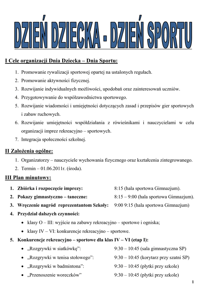 I Cele organizacji Dnia Dziecka – Dnia Sportu: II Założenia ogólne