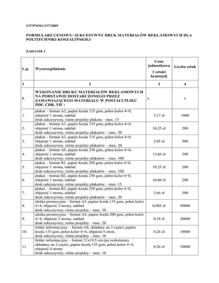 137/PNOG/137/2009 FORMULARZ CENOWY- SUKCESYWNY DRUK MATERIAŁÓW REKLAMOWYCH DLA POLITECHNIKI KOSZALIŃSKIEJ ZADANIE I L.p. 1 I. 1. 2. 3. 4. 5. 6. 7. 8. 9. 10. 11. Cena jednostkowa Wyszczególnienie Liczba sztuk 1 sztuki brutto[zł] 2 3 WYKONANIE DRUKU MATERIAŁÓW REKLAMOWYCH NA PODSTAWIE DOSTARCZONEGO PRZEZ x ZAMAWIAJĄCEGO MATERIAŁU W POSTACI PLIKU PDF, CDR, TIF : plakat – format A2, papier kreda 135 gsm, pełen kolor 4+0, objętość 1 strona, nakład druk sukcesywny, róŜne projekty plakatu – max. 15 plakat – format A1, papier kreda 135 gsm, pełen kolor 4+0, objętość 1 strona, nakład druk sukcesywny, róŜne projekty plakatów – max. 50 plakat – format A3, papier kreda 135 gsm, pełen kolor 4+0, objętość 1 strona, nakład druk sukcesywny, róŜne projekty plakatów – max. 20 plakat – format A0, papier kreda 250 gsm, pełen kolor 4+0, objętość 1 strona, nakład druk sukcesywny, róŜne projekty plakatów – max. 100 plakat – format B1, papier kreda 250 gsm, pełen kolor 4+0, objętość 1 strona, nakład druk sukcesywny, róŜne projekty plakatów – max. 100 plakat – format B2, papier kreda 250 gsm, pełen kolor 4+0, objętość 1 strona, nakład druk sukcesywny, róŜne projekty plakatów – max. 15 plakat – format B3, papier kreda 250 gsm, pełen kolor 4+0, objętość 1 strona, nakład druk sukcesywny, róŜne projekty plakatów – max. 20 ulotka promocyjna – format A5, papier kreda 135 gsm, pełen kolor 4+4, objętość 2 strony, nakład druk sukcesywny, róŜne projekty – max. 30 ulotka promocyjna – format A4, papier kreda 200 gsm, pełen kolor 4+4, objętość 2 strony, nakład druk sukcesywny, róŜne projekty – max. 20 folder informacyjny – format A4, składany na 3 części, papier kreda 135 gsm, pełen kolor 4+4, objętość 6 stron, druk sukcesywny, róŜne projekty – max. 10 folder informacyjny – format 21x19,5 cm (po rozłoŜeniu), składany na 2 części, papier kreda 135 gsm, pełen kolor 4+4, objętość 4 strony druk sukcesywny, róŜne projekty – max. 10 4 x 3,17 zł 1000 10,25 zł 200 3,05 zł 500 13,66 zł 200 10,25 zł 200 16,60 zł 200 3,66 zł 500 0,085 zł 50000 0,18 zł 20000 0,26 zł 10000 0,26 zł 10000 12. 13. 14. 15. 16. 17. 18. 19. 20. 21. 22. 23. 24. 25. folder informacyjny – format 21x39 (po rozłoŜeniu), składany na 4 części, papier kreda 135 gsm, pełen kolor 4+4, objętość 8 stron, druk sukcesywny, róŜne projekty – max. 10 naklejki promocyjne – format 58x79 mm, papier kreda 120 gsm, klejony z jednej strony, pełen kolor 4+0, objętość 1 strona, druk sukcesywny, róŜne projekty – max. 3 zakładka promocyjna – format 209x49mm, papier karton 300 gsm, foliowany, pełen kolor 4+4, objętość 2 strony, druk sukcesywny, róŜne projekty – max. 5 notatnik promocyjny – format A4, papier offset 80 gsm, nadruk 1 kolor 4+0, objętość 10 stron, podkładka (ostatnia strona 11) karton 240 gsm, grzbiet górny klejony, druk sukcesywny, róŜne projekty – max. 5 teczki promocyjne kartonowe wg wykrojnika, z kieszenią na dokumenty, grzbiet teczki 0,5 cm, format po złoŜeniu A4, papier karton 250 gsm, foliowany, pełen kolor 4+0, objętość 2 strony, druk sukcesywny, róŜne projekty – max. 5 teczki promocyjne kartonowe format A3, składane do formatu A4, papier karton w masie barwiony granatowy 300 gsm, pełen kolor ze złoceniem(nadruk na teczce w kolorze złotym) , objętość 1 strona 4+0, druk sukcesywny, róŜne projekty – max. 4 informator o studiach – zasady przyjęć, format A4, składane do formatu A5, składka wewnętrzna – papier offset 80 gsm, 1 kolor, objętość 14 stron, 16 stron, 18 stron, 20 stron. Okładka papier offset 135 gsm, kolor 4+0, objętość 1 strona, zszywane na zgięciu – zszywki 2 sztuki, druk sukcesywny, róŜne projekty – max. 3 informator o studiach podyplomowych – format A4, składane do formatu A5, składka wewnętrzna – papier offset 80 gsm, 1 kolor, objętość 14 stron, 16 stron, 18 stron, 20 stron. Okładka papier offset 135 gsm, kolor 4+0, objętość 1 strona, zszywane na zgięciu – zszywki 2 sztuki, róŜne projekty – max. 1 czasopismo uczelniane – format A3 składane do formatu A4, papier offset 80 g/m – okładka kreda 150 gsm, kolor pełen 4+4, objętość 4 strony, składka wewnętrzna 4 stronicowa (format A3 składana do formatu A4) 1 kolor, zszywane na zgięciu – zszywki 2 sztuki, druk sukcesywny, róŜne projekty – max. 2 kalendarzyk „listek” – format 85/55 mm, naroŜniki zaokrąglone, papier offset 350gsm, foliowany, pełen kolor 4+4, objętość 2 strony, druk sukcesywny, róŜne projekty – max. 8 torba papierowa z uchwytem sznurkowym – wysokość 350mm, szerokość 255 mm, fałda boczna 80mm, materiał kreda 150gsm, nadruk – 2 kolory, wykończenie – laminowanie, wzmocnione uchwyty i denka, sznureczki – 100% bawełna w kolorze torby, ilość 5000 sztuk, druk i wykonanie sukcesywne, róŜne projekty – max. 2 teczka kartonowa – obwoluta kreda 135gsm, kolor druku 4+0, oprawa kartonowa sztywna ze skrzydełkiem, wewnątrz z zamkiem podtrzymującym kartki w górnej części, w grzbiecie zamek na 4 otwory, zamówienia sukcesywne, róŜne projekty – max. 3 notatnik promocyjny – format A5, papier offset 80 gsm, nadruk 1 kolor 4+0, objętość 20 stron, podkładka (ostatnia strona 21) karton 240 gsm, grzbiet górny klejony, druk sukcesywny róŜne projekty – max. 5 notatnik promocyjny – format A6, papier offset 80 gsm, nadruk 1 0,43 zł 10000 0,24 zł 5000 0,18 zł 25000 1,12 zł 25000 0,40 zł 10000 0,81 zł 5000 0,61 zł 20000 1,62 zł 2000 0,77 zł 5000 0,44 zł 6000 6,83 zł 2000 5,98 zł 1500 0,34 zł 20000 0,27 zł 15000 26. 27. kolor 4+0, objętość 20 stron, podkładka (ostatnia strona 31) karton 240 gsm, grzbiet górny klejony druk sukcesywny, róŜne projekty – max. 5 Notes samoprzylepny max 75x75 cm z nadrukiem, 100 kartek, nadruk offsetowy 4+0, druk sukcesywny, róŜne proj