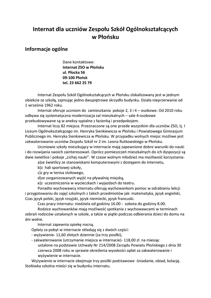 Internat dla uczniów Zespołu Szkół Ogólnokształcących w Płońsku Informacje ogólne Dane kontaktowe: Internat ZSO w Płońsku ul. Płocka 56 09-100 Płońsk tel. 23 662 25 79 Internat Zespołu Szkół Ogólnokształcących w Płońsku zlokalizowany jest w jednym obiekcie ze szkołą, zajmując jedno dwupiętrowe skrzydło budynku. Działa nieprzerwanie od 1 września 1962 roku. Internat oferuje uczniom do zamieszkania pokoje 2, 3 i 4 – osobowe. Od 2010 roku odbywa się systematyczna modernizacja sal mieszkalnych – sale 4-osobowe przebudowywane są w aneksy sypialne z łazienką i przedpokojem. Internat liczy 82 miejsca. Przeznaczone są one przede wszystkim dla uczniów ZSO, tj. I Liceum Ogólnokształcącego im. Henryka Sienkiewicza w Płońsku i Powiatowego Gimnazjum Publicznego im. Henryka Sienkiewicza w Płońsku. W przypadku wolnych miejsc możliwe jest zakwaterowanie uczniów Zespołu Szkół nr 2 im. Leona Rutkowskiego w Płońsku. Uczniowie szkoły mieszkujący w internacie mają zapewnione dobre warunki do nauki i do rozwijania swoich zainteresowań. Oprócz pomieszczeń mieszkalnych do ich dyspozycji są dwie świetlice i pokoje „cichej nauki”. W czasie wolnym młodzież ma możliwość korzystania: a)ze świetlicy ze stanowiskami komputerowymi z dostępem do Internetu, b)z hali sportowej szkoły, c)z gry w tenisa stołowego, d)ze zorganizowanych wyjść na pływalnię miejską, e)z uczestniczenia w wycieczkach i wyjazdach do teatru. Ponadto wychowawcy internatu oferują wychowankom pomoc w odrabianiu lekcji i przygotowaniu do zajęć szkolnych z takich przedmiotów jak: matematyka, język angielski, Czas język polski, język rosyjski, język niemiecki, język francuski. Czas pracy internatu: niedziela od godziny 16.00 - sobota do godziny 8.00. Rodzice wychowanków mają możliwość spotkania z wychowawcami w terminach zebrań rodziców ustalonych w szkole, a także w piątki podczas odbierania dzieci do domu na dni wolne. Internat zapewnia opiekę nocną. Opłaty za pobyt w internacie składają się z dwóch części: - wyżywienie- 11,60 złotych dziennie (za trzy posiłki), - zakwaterowanie (utrzymanie miejsca w internacie)- 118,00 zł. na miesiąc ustalone na podstawie Uchwały Nr 214/2008 Zarządu Powiatu Płońskiego z dnia 30 czerwca 2008 roku w sprawie określenia wysokości opłat za zakwaterowanie i wyżywienie w internacie. Wyżywienie w internacie obejmuje trzy posiłki podstawowe -śniadanie, obiad, kolację. Stołówka szkolna mieści się w budynku internatu. Wniosek o przyjęcie do internatu można pobrać w internacie w pokoju kierownika. Terminy składania wniosków: - dla kandydatów do ZSO – w terminie 10 dniu od zakończenia zajęć w roku szkolnym, - dla uczniów już zakwaterowanych w internacie – do końca zajęć szkolnych. Prawa i obowiązki wychowanka określa Regulamin Internatu Tradycja i uroczystości w Internacie Życie mieszkańców Internatu odpowiada kalendarzowi roku szkolnego oraz podziałowi na semestry zgodnie z zasadami obowiązującymi w liceum i w gimnazjum. W Internacie przez lata rozwinęła się wewnętrzna tradycja. Zgodnie z nią corocznie odbywają się następujące uroczystości i imprezy: 1) integracyjne: - we wrześniu ognisko (np. w leśniczówce Paryż), - w październiku „Idol”, obie służące lepszemu poznaniu się mieszkańców i wprowadzeniu w życie placówki tych, którzy mieszkają w niej po raz pierwszy, 2) wieczór wróżb, czyli „andrzejki”, 3) spotkanie opłatkowe i wspólne śpiewanie kolęd, 4) walentynki, 5) Dzień Kobiet, 6) Dzień Dziecka. Ponadto w każdym roku odbywają się spotkania i prelekcje z ciekawymi ludźmi(np. reżyserzy, pisarze), zajęcia warsztatowe, wspólne projekcje filmowe i teatralne. Kultywowane od lat tradycje pozwalają na integrację i wzajemne poznanie się wychowanków. Młodzieżowa Rada Internatu Wychowankowie Internatu tworzą Samorząd - Młodzieżową Radę Internatu, której Zarząd reprezentuje ogól mieszkańców . Zarząd MRI wybierany jest na ogólnym zebraniu wychowanków internatu, w wyborach jawnych i bezpośrednich na początku września na okres jednego roku szkolnego. Młodzież wybiera ze swojego grona przewodniczącego, dwóch zastępców, sekretarza i skarbnika. Do uprawnień MRI należą m.in. inicjowanie przedsięwzięć zmierzających do podnoszenia wyników nauczania i pracy opiekuńczo – wychowawczej w Internacie, regulowanie wewnętrznego życia grupy, rozstrzyganie sporów, wnioskowanie o wyróżnienia i nagrody, współorganizowanie imprez dla grupy i dla wszystkich mieszkańców internatu w ramach czasu wolnego, występowanie do kierownika i Rady Wychowawczej Internatu w sprawach istotnych dla mieszkańców Internatu. Rozkład zajęć w Internacie 6.30 – pobudka 6.30 – 7.00 – toaleta poranna 7.00 -7. 30 – śniadanie 7.30 – 7.50 – porządkowanie sal 7.50- wyjście do szkoły 8.00 – 15.05 – zajęcia lekcyjne 13.30 – 15.30 – obiad Do godziny 16.30 – czas wolny 16.30 – 18. 30 – nauka własna 18.30 – 19.00 – kolacja 19. 00 – 20.30 – praca w grupach, zajęcia sportowe 20.30 – 21. 30 – nauka własna 21.30 – 22. 00 – toaleta wieczorna 22.00 – 6. 00 – cisza nocna Regulamin Internatu Zespołu Szkół Ogólnokształcących w Płońsku Rozdział I Postanowienia ogólne § 1. 1. Internat Zespołu Szkół Ogólnokształcących w Płońsku jest koedukacyjną placówką opiekuńczo-wychowawczą dla uczniów I Liceum Ogólnokształcącego i Gimnazjum ZSO w Płońsku. 2. Zadaniem Internatu jest zapewnienie opieki i wychowania uczniom w okresie nauki poza miejscem zamieszkania. 3.Internat zapewnia uczniom zakwaterowanie i całodzienne wyżywienie. 4. Internat prowadzi swoją działalność w okresie zajęć dydaktyczno- wychowawczych w szkołach. 5. Organem nadzorującym działalność Internatu jest Dyrektor Zespołu Szkół Ogólnokształcących w Płońsku, zwany dalej Dyrektorem. 6. Liczba wyc