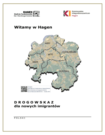 Witamy w Hagen DROGOWSKAZ dla nowych imigrantów POLSKI Spis treści Wstęp nadburmistrza 4 Pierwsze punkty informacyjne Urząd ds. obcokrajowców 6 Urzędy spraw obywatelskich 7 Ogólne doradztwo socjalne 8 Agencje integracji 8 Doradztwo migracyjne dla dorosłych 9 Doradztwo dla uchodźców i osób starających się o azyl 10 Oferty dla dzieci i młodzieży 12 Nauka niemieckiego Nauka niemieckiego w bibliotece miejskiej 13 Oferty na kursy integracyjne 14 Kształcenie językowe dla dzieci i młodzieży Oferty na kształcenie językowe 15 Kształcenie i praca Oferty w dziedzinie edukacji i pracy 16 Rodzina Wydział Młodzieży i Spraw Społecznych 19 Powszechna Służba Społeczna 19 Poradnia dla rodziców, dzieci i młodzieży miasta Hagen 20 Opiekunki rodzinne 20 Przedszkola i żłobki 21 Praca z dziećmi i młodzieżą w centrach młodzieżowych 21 Doradztwo wychowawcze, rodzinne i ogólne kościołów ewangelickiego i katolickiego 22 Kasa rodzinna Iserlohn (zasiłki rodzinne) 22 Centra rodzinne 23 2 Położne rodzinne 23 Poradnie ds. konfliktów związanych z ciążą 23 Specjalistyczna poradnia dla kobiet 24 Mieszkalnictwo 25 Kultura i religia 25 Zdrowie jest najważniejsze 26 Czas wolny i sport 26 Naturalizacja 27 3 Wstęp W Hagen mieszkają ludzie reprezentujący ponad 130 różnych narodowości, kultur i historii pochodzenia. Dla wielu to miasto nad Volme jest ojczyzną od lat, nawet kilkudziesięciu, a dla innych, którzy mieszkają tutaj od niedawna, dopiero się nią stanie. Niejednokrotnie muszą oni sprostać temu czy innemu wyzwaniu. Integracja imigrantów jest zadaniem społecznym o kluczowym znaczeniu dla wzajemnych relacji społecznych w Hagen. Niezbędną podstawą takiej integracji jest edukacja i znajomość języka. Dzieci i młodzież – niezależnie od pochodzenia – muszą mieć równe szanse edukacyjne i zawodowe, a ich talenty muszą być wspierane. Ważną rolę odgrywają tutaj przedszkola i szkoły, ale również kluby sportowe i instytucje kulturalne. Niniejszy Drogowskaz pomoże w szukaniu odpowiednich instytucji i osób do kontaktu dla osób młodszych i starszych. Od razu można zauważyć, że w tym mieście jest dużo instytucji, które mogą udzielić pomocy w sposób kompetentny i nieskomplikowany. 4 Miasto Hagen wspólnie z różnymi partnerami opracowało miejską koncepcję integracji. Wszystkie zainteresowane strony pokazują w niej, że chcą rozmawiać nie tylko o sobie, lecz również ze sobą, aby się od siebie uczyć i ze sobą współpracować. Na tej wspólnej drodze ten drogowskaz integracji jest propozycją, która ułatwia rozeznanie się w bogatej ofercie pomocy integracyjnej w Hagen - nie tylko dla osób z przeszłością migracyjną. Mam w związku z tym nadzieję, że niniejszy drogowskaz zgodnie ze swoją nazwą i jako informacyjny i praktyczny poradnik odpowie Państwu na najważniejsze pytania, a także wskaże drogę do znalezienia kompetentnych osób kontaktowych. Hagen, grudzień 2015 r. Erik O. Schulz Nadburmistrz 5 Pierwsze punkty informacyjne Oprócz urzędu ds. cudzoziemców istnieją punkty informacyjne, które udzielają pomocy w zakresie orientacji i integracji - często również w różnych językach. Punkty te udzielają pomocy w zakresie spraw związanych z pobytem, utrzymaniem i mieszkaniem, rodziną, przedszkolem i szkołą, edukacją i pracą, a także w wielu innych, nierzadko trudnych sytuacjach życiowych. Porady udzielane przez takie punkty konsultacyjne są oczywiście poufne i profesjonalne. Prawdo do pobytu obowiązek meldunkowy Obowiązek meldunkowy W Niemczech istnieje ustawowy obowiązek zameldowania się w nowym miejscu zamieszkania w gminnym urzędzie/biurze spraw obywatelskich. Przy opuszczaniu kraju należy się wymeldować. Osoby spoza UE Osoby niebędące obywatelami UE po zameldowaniu się zwracają się do biura/urzędu spraw obywatelskich o przyznanie prawa pobytu. Urząd ds. obcokrajowców Wskazówka: Pierwszym krokiem jest zawsze zameldowanie się w jednym z urzędów spraw obywatelskich miasta Hagen, o ile miejsce zamieszkania nie jest ograniczone. Böhmerstr. 1, 58095 Hagen Przynależność zależy od początkowej litery nazwiska. Parter: pokoje 1–7; pierwsze piętro: pokoje 103-111 Obywatele UE: pierwsze piętro pokoje 101, 102 i 112 Godziny otwarcia: poniedziałki, środy i piątki poniedziałki i czwartki w godz. 8.30 -12.00 w godz. 14.30 -17.00 W Hagen nie trzeba się umawiać. Zaleca się korzystanie z przedpołudniowych godzin przyjęć. 6 Urzędy spraw obywatelskich Centralny Urząd Spraw Obywatelskich - Obsługa Obywateli Śródmieście Rathausstr. 11, 58095 Hagen tel.: 02331/207-5777 Godziny otwarcia: poniedziałki i wtorki środy i piątki czwartki soboty godz. godz. godz. godz. 8.00 8.00 8.00 9.30 - 17.00 12.00 18.00 12.30 Urząd Spraw Obywatelskich Boele Schwerter Str. 168, 58099 Hagen tel.: 02331/207-4400 Godziny otwarcia: poniedziałki i wtorki środy i piątki czwartki godz. 8.00 - 17.00 godz. 8.00 - 12.00 godz. 8.00 - 18.00 Urząd Spraw Obywatelskich Haspe Kölner Str. 1, 58135 Hagen tel.: 02331/207-4401 Godziny otwarcia: poniedziałki i wtorki środy i piątki czwartki godz. 8.00 - 17.00 godz. 8.00 - 12.00 godz. 8.00 - 18.00 Urząd Spraw Obywatelskich Hohenlimburg Freiheitstr. 3, 58119 Hagen tel.: 02331/207-4402 Godziny otwarcia: poniedziałki i wtorki środy i piątki czwartki godz. 8.00 - 17.00 godz. 8.00 - 12.00 godz. 8.00 - 18.00 7 Ogólne doradztwo socjalne Ogólne doradztwo socjalne jest skierowane do osób z historią imigracyjną. Doradztwo może obejmować wszelkie sprawy. Osoba kontaktowa: Organizacja Caritas (Caritasverband Hagen e.V.) pan Wagner, pani Kremkau i pani Kaiser, Bergstr. 81, 58095 Hagen tel.: 02331/9184-37; 0233179184-81 lub 02331/79184-38 Godziny otwarcia: poniedziałki, Bergstr. 81 wtorki, Im Weinhof 8 wtorki, Friedensstr. 107 piątki, Boeler Kirchplatz 5 godz. 9.30 - 12.30 godz. 10.00 - 12.00 godz. 9.00 - 12.00 godz. 9.00 - 11.00 Agencje integr