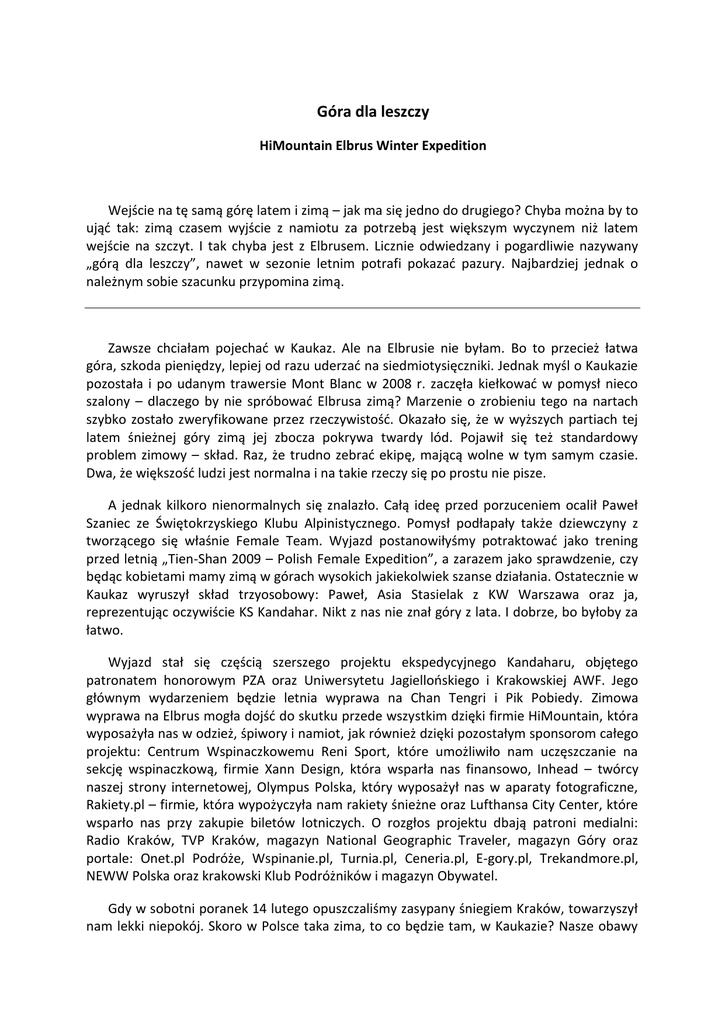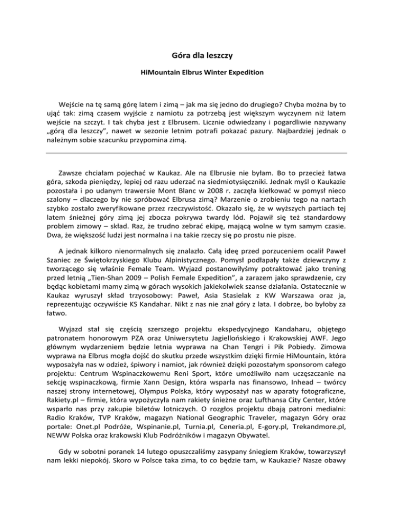 Góra dla leszczy HiMountain Elbrus Winter Expedition Wejście na tę samą górę latem i zimą – jak ma się jedno do drugiego? Chyba można by to ująd tak: zimą czasem wyjście z namiotu za potrzebą jest większym wyczynem niż latem wejście na szczyt. I tak chyba jest z Elbrusem. Licznie odwiedzany i pogardliwie nazywany „górą dla leszczy”, nawet w sezonie letnim potrafi pokazad pazury. Najbardziej jednak o należnym sobie szacunku przypomina zimą. Zawsze chciałam pojechad w Kaukaz. Ale na Elbrusie nie byłam. Bo to przecież łatwa góra, szkoda pieniędzy, lepiej od razu uderzad na siedmiotysięczniki. Jednak myśl o Kaukazie pozostała i po udanym trawersie Mont Blanc w 2008 r. zaczęła kiełkowad w pomysł nieco szalony – dlaczego by nie spróbowad Elbrusa zimą? Marzenie o zrobieniu tego na nartach szybko zostało zweryfikowane przez rzeczywistośd. Okazało się, że w wyższych partiach tej latem śnieżnej góry zimą jej zbocza pokrywa twardy lód. Pojawił się też standardowy problem zimowy – skład. Raz, że trudno zebrad ekipę, mającą wolne w tym samym czasie. Dwa, że większośd ludzi jest normalna i na takie rzeczy się po prostu nie pisze. A jednak kilkoro nienormalnych się znalazło. Całą ideę przed porzuceniem ocalił Paweł Szaniec ze Świętokrzyskiego Klubu Alpinistycznego. Pomysł podłapały także dziewczyny z tworzącego się właśnie Female Team. Wyjazd postanowiłyśmy potraktowad jako trening przed letnią „Tien-Shan 2009 – Polish Female Expedition”, a zarazem jako sprawdzenie, czy będąc kobietami mamy zimą w górach wysokich jakiekolwiek szanse działania. Ostatecznie w Kaukaz wyruszył skład trzyosobowy: Paweł, Asia Stasielak z KW Warszawa oraz ja, reprezentując oczywiście KS Kandahar. Nikt z nas nie znał góry z lata. I dobrze, bo byłoby za łatwo. Wyjazd stał się częścią szerszego projektu ekspedycyjnego Kandaharu, objętego patronatem honorowym PZA oraz Uniwersytetu Jagiellooskiego i Krakowskiej AWF. Jego głównym wydarzeniem będzie letnia wyprawa na Chan Tengri i Pik Pobiedy. Zimowa wyprawa na Elbrus mogła dojśd do skutku przede wszystkim dzięki firmie HiMountain, która wyposażyła nas w odzież, śpiwory i namiot, jak również dzięki pozostałym sponsorom całego projektu: Centrum Wspinaczkowemu Reni Sport, które umożliwiło nam uczęszczanie na sekcję wspinaczkową, firmie Xann Design, która wsparła nas finansowo, Inhead – twórcy naszej strony internetowej, Olympus Polska, który wyposażył nas w aparaty fotograficzne, Rakiety.pl – firmie, która wypożyczyła nam rakiety śnieżne oraz Lufthansa City Center, które wsparło nas przy zakupie biletów lotniczych. O rozgłos projektu dbają patroni medialni: Radio Kraków, TVP Kraków, magazyn National Geographic Traveler, magazyn Góry oraz portale: Onet.pl Podróże, Wspinanie.pl, Turnia.pl, Ceneria.pl, E-gory.pl, Trekandmore.pl, NEWW Polska oraz krakowski Klub Podróżników i magazyn Obywatel. Gdy w sobotni poranek 14 lutego opuszczaliśmy zasypany śniegiem Kraków, towarzyszył nam lekki niepokój. Skoro w Polsce taka zima, to co będzie tam, w Kaukazie? Nasze obawy pogłębiły się na widok zimowej scenerii Szeremietiewa. Na razie wszystko szło niespodziewanie świetnie. Bez przygód jednak nie mogło się obejśd. Po noclegu na karimatach na Szeremietiewie II, niespodziewanie zobaczyliśmy, że jedyny samolot o godzinie, w której miał odlatywad nasz, leci nie do Mineralnych Wód, a do... Hongkongu. Nasz, jak się okazało, miał lecied z Szeremietiewa I. W trzy minuty zwinęliśmy cały „lotniskowy biwak”, znaleźliśmy wyjście, dopadliśmy autobus, uniemożliwili kierowcy odjazd bez części ekipy oraz plecaków. Na samolot zdążyliśmy. W Mineralnych Wodach zaskoczyła nas... wiosna. Podobnie wiosenny krajobraz roztaczał się wokół nas podczas całej podróży busikiem z szalonym panem kierowcą do Azau u stóp Elbrusa. Ceny noclegów są tu dostosowane do zamożnej moskiewskiej klienteli, przyjeżdżającej na narty. Rozbiliśmy więc namiot niedaleko dolnej stacji kolejki. Była niedziela wieczór. W poniedziałek obudziliśmy się podduszeni. Na 2200 m n.p.m - co jest? Okazało się, że w nocy zima wróciła w Kaukaz. Byliśmy zasypani po dach. „Wyprawa” do położonego kilka kilometrów niżej Terskola w celu zakupu gazu i jedzenia oraz zarejestrowania się u ratowników, okazała się nie lada przedsięwzięciem. Na szczęście maldunek OVIR za niedużą opłatą zdeklarowała się zorganizowad pani z kiosku w Azau. We wtorek w góry nie wyszliśmy. Załamanie pogody trwało nadal. Chcąc umyd zęby zaproponowaliśmy panu, odśnieżającemu parking przed hotelem Alpina - jak się miało okazad kierownikowi tegoż hotelu – biznes. Odśnieżymy parking w zamian za możliwośd skorzystania z dobra cywilizacji, jakim jest łazienka. Skooczyło się na... spaniu, jedzeniu, prysznicu, możliwości zostawienia depozytu. Za darmo! Trochę się stresowaliśmy, zwłaszcza damska częśd wyprawy. Okazało się jednak, że to po prostu gościnnośd, jaką nakazuje kultura zamieszkujących te tereny Bałkarów. Na szczęście od imprezy się wykręciliśmy, bo inaczej kolejnego dnia też byśmy w góry nie wyszli. W środę wreszcie przywitała nas piękna pogoda. Dylemat, czy w imię czystości stylu iśd nartostradami wzdłuż kolejki, czy może chcąc zmieścid się w oknie pogodowym skorzystad z niej, rozwiązał się sam. Dolna kolejka nie działała. Kolejny odcinek działał, jednak pogardziliśmy luksusem. Moskiewscy narciarze, dla których byliśmy atrakcją turystyczną, nie mogli zrozumied, dlaczego idziemy pieszo niosąc po 30 kg. Tego dnia dotarliśmy w okolicę stacji Mir (3500 m n.p.m.) i tam spaliśmy w namiocie. Znów zimno, szron w namiocie, mokre śpiwory – czyli po hotelowych luksusach wszystko wraca do normy. Kolejny dzieo to podejście do położonego na 4100 m n.p.m. obok ruin Prijuta 1