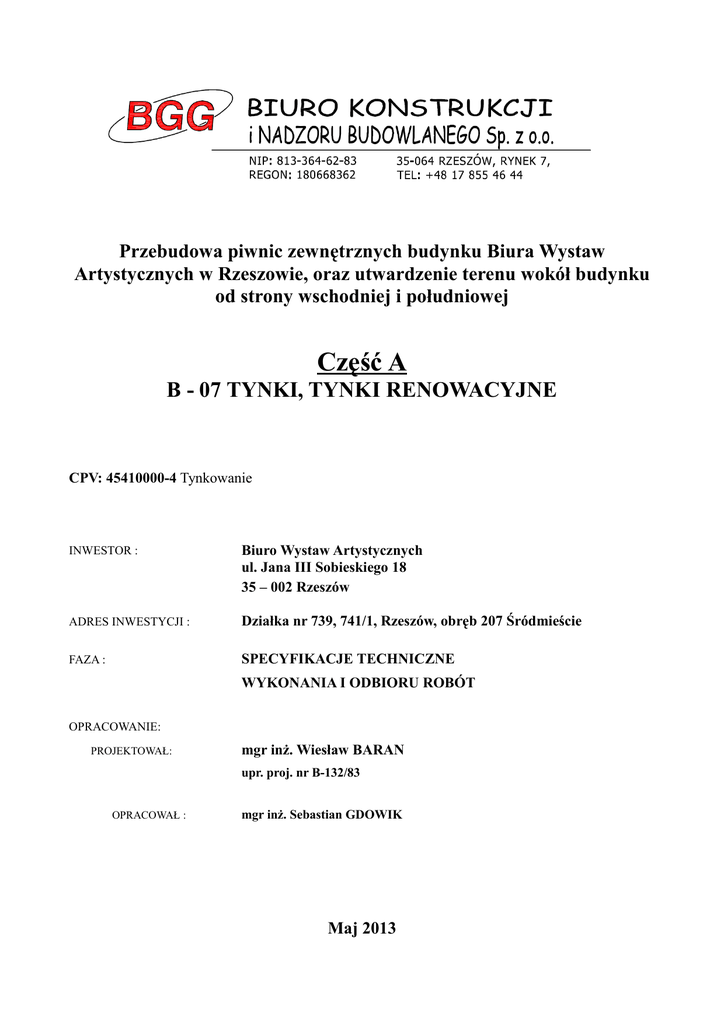 Przebudowa piwnic zewnętrznych budynku Biura Wystaw Artystycznych w Rzeszowie, oraz utwardzenie terenu wokół budynku od strony wschodniej i południowej Część A B - 07 TYNKI, TYNKI RENOWACYJNE CPV: 45410000-4 Tynkowanie INWESTOR : Biuro Wystaw Artystycznych ul. Jana III Sobieskiego 18 35 – 002 Rzeszów ADRES INWESTYCJI : Działka nr 739, 741/1, Rzeszów, obręb 207 Śródmieście FAZA : SPECYFIKACJE TECHNICZNE WYKONANIA I ODBIORU ROBÓT OPRACOWANIE: PROJEKTOWAŁ: mgr inż. Wiesław BARAN upr. proj. nr B-132/83 OPRACOWAŁ : mgr inż. Sebastian GDOWIK Maj 2013 SZCZEGÓŁOWA SPECYFIKACJA TECHNICZNA – TYNKI, OKŁADZINY ŚCIENNE 1. Wstęp 1.1 Przedmiot SST. Przedmiotem niniejszej specyfikacji technicznej są wymagania ogólne dotyczące wykonania i odbioru prac budowlanych dla zadania: „Przebudowa piwnic zewnętrznych budynku Biura Wystaw Artystycznych w Rzeszowie, oraz utwardzenie terenu wokół budynku od strony wschodniej i południowej”. 1.2. Zakres stosowania ST. Szczegółowe Specyfikacje Techniczne stanowią część Dokumentów Przetargowych i należy je stosować w zlecaniu i wykonaniu robót opisanych w podpunkcie 1.1. 1.3. Zakres robót objętych ST Ustalenia zawarte w niniejszej specyfikacji obejmują wymagania dla robót tynkarskich objętych realizacją zadania jak w p. 1.1. t j. - wykonanie tynków zwykłych wewnętrznych na ścianach w miejscu wyburzonej klatki schodowej - uzupełnienie tynków zwykłych, - wykonanie tynków renowacyjnych 1.4. Określenia podstawowe. Określenia podane w niniejszej SST są zgodne z obowiązującymi odpowiednimi normami i wytycznymi. Użyte w SST wymienione poniżej określenia należy rozumieć w każdym przypadku następująco: 1.4.1. Roboty budowlane - wszystkie prace budowlane związane z wykonaniem tynków zgodnie z ustaleniami w dokumentacji kosztorysowej. Pozostałe określenia użyte w niniejszej SST są zgodne z obowiązującymi nomami i określeniami podanymi w ST B – 00 Część ogólna. 1.5. Ogólne wymagania dotyczące robót. Wykonawca jest odpowiedzialny za jakość wykonanych robót, bezpieczeństwo wszelkich czynności na terenie budowy, metody użyte przy budowie oraz za ich zgodność z dokumentacją projektową, SST i poleceniami Inspektora Nadzoru i Projektanta. 1.6. Tynki zwykłe i okładziny. - ze względu na miejsce stosowania, rodzaj podłoża, rodzaj zaprawy, liczbę warstw i technikę wykonania powinny odpowiadać normie PN-70/B-10100 podłoża w zależności od ich rodzaju powinny być przygotowane zgodnie z wymaganiami normy PN-73/B-10100. 2. Materiały Materiałami stosowanymi przy wykonywaniu robót według zasad niniejszej specyfikacji są: 2.1. Woda Do przygotowania zaprawy stosować wodę odpowiadającą wymaganiom normy PN-88/B-32250 – Materiały budowlane. Woda do betonów i zapraw. Można stosować wodę pitną wodociągową 2.2. Piasek Piasek nie powinien zawierać domieszek organicznych i mieć frakcje różnych wymiarów, a mianowicie: piasek drobnoziarnisty 0,25-0,5 mm, piasek średnioziarnisty bez domieszek organicznych 0,5-1,0 mm, piasek gruboziarnisty 1.0-2,0mm. 2.2.1. do spodnich warstw tynku należy stosować piasek gruboziarnisty odmiany 1, do warstw wierzchnich - średnioziarnisty odmiany 2. 2.2.2. do gładzi piasek powinien być drobnoziarnisty i przechodzić całkowicie przez sito o prześwicie 0,5 mm. 2.3. Wapno - PN-86/B-30020 do zapraw stosować wapno suchogaszone. 2.4. Zaprawy budowlane cementowo – wapienne. Do zapraw murarskich stosować: piasek rzeczny lub kopany, cement portlandzki 25 z dodatkami, wapno suchogaszone. Skład objętościowy zapraw należy dobierać doświadczalnie w zależności od wymaganej marki zaprawy, zgodnie z normą PN-90/B-14501. Przygotowanie zapraw winno odbywać się mechanicznie. Zaprawę należy przygotować w takiej ilości, aby mogła być wbudowana możliwie szybko po jej przygotowaniu, tj w okresie około 3 godzin. 2.5 Preparat gruntujący AIDA KIESOL lub równoważny Płynny koncentrat krzemionkujący stosowany w systemach uszczelnienia i renowacji budowli. Stosowany m.in. do prac renowacyjnych w starym budownictwie, do iniekcji przeciw wilgoci podciąganej kapilarnie, do uszczelniania piwnic od wewnątrz i renowacji cokołów. 2.6 Tynki renowacyjne. Tynk Funcosil Sanierputz lub równoważny. Fabrycznie wymieszana sucha zaprawa ze spoiwem mineralnym, odpornym na siarczany wg DIN 1164, mineralnym spoiwem wg DIN 1060 oraz naturalnymi, mineralnymi kruszywami wg DIN 4226. Dane techniczne produktu: - DIN 18550 część 2, grupa zapraw tynkarskich P II - wytrzymałość na ściskanie 2,5 N/mm2 - nasiąkliwość kapilarna > 0,3 kg/m2 - głębokość wnikania wody 5 mm - współczynnik oporu dyfuzyjnego w stosunku do pary wodnej µ < 12 - DIN 4102 właściwości przeciwpożarowe niepalnego materiału budowlanego, klasa materiału budowlanego A1, Stosować sprzęt dostosowany do rodzaju robot. Sprzęt powinien być sprawny i spełniać wszystkie wymagania przepisów BHP 4. Transport 4.1. Transport materiałów może odbywać się dowolnymi środkami transportu, ze zwróceniem szczególnej uwagi na zabezpieczenie ładunku przed utratą stateczności i uszkodzeniami. 4.1.1. Transport cementu i wapna suchogaszonego powinien odbywać się zgodnie z normą BN-8/6731-08. Cement i wapno workowane można przewozić dowolnymi środkami transportu, odpowiednio zabezpieczone przed zawilgoceniem. 5. Wykonanie robót 5.1. Tynki cementowo - wapienne kat. III - Przed przystąpieniem do wykonania robót tynkowych powinny być zakończone wszystkie roboty stanu surowego, roboty instalacyjne podtynkowe, zamurowane przebicia i bruzdy, osadzone ościeżnice drzwiowe. Zaleca się przystąpienie do wykonywania tynków po okresie osiadania i skurczów murów tj po upływie 4-6 miesięcy po zakończeniu stanu surowego (jeżeli to jest możliwe). Tynki należy wykonywać w temperaturze nie niższej niż +5°C pod warunkiem że w ciągu doby nie nastąpi spadek temperatu
