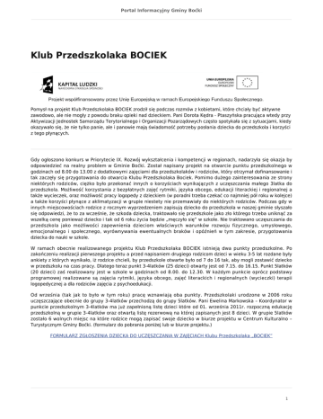 Portal Informacyjny Gminy Boćki Klub Przedszkolaka BOCIEK Pomysł na projekt Klub Przedszkolaka BOCIEK zrodził się podczas rozmów z kobietami, które chciały być aktywne zawodowo, ale nie mogły z powodu braku opieki nad dzieckiem. Pani Dorota Kędra - Ptaszyńska pracująca wtedy przy Aktywizacji Jednostek Samorządu Terytorialnego i Organizacji Pozarządowych często spotykała się z sytuacjami, kiedy okazywało się, że nie tylko panie, ale i panowie mają świadomość potrzeby posłania dziecka do przedszkola i korzyści z tego płynących. Gdy ogłoszono konkurs w Priorytecie IX. Rozwój wykształcenia i kompetencji w regionach, nadarzyła się okazja by odpowiedzieć na realny problem w Gminie Boćki. Został napisany projekt na otwarcie punktu przedszkolnego w godzinach od 8.00 do 13.00 z dodatkowymi zajęciami dla przedszkolaków i rodziców, który otrzymał dofinansowanie i tak zaczęły się przygotowania do otwarcia Klubu Przedszkolaka Bociek. Pomimo dużego zainteresowania ze strony niektórych rodziców, ciężko było przekonać innych o korzyściach wynikających z uczęszczania małego 3latka do przedszkola. Możliwość korzystania z bezpłatnych zajęć rytmiki, języka obcego, edukacji literackiej i regionalnej a także wycieczek, oraz możliwość pracy logopedy z dzieckiem (w poradni trzeba czekać co najmniej pół roku w kolejce) a także korzyści płynące z aklimatyzacji w grupie niestety nie przemawiały do niektórych rodziców. Podczas gdy w innych miejscowościach rodzice z rocznym wyprzedzeniem zapisują dziecko do przedszkola w naszej gminie słyszało się odpowiedzi, że to za wcześnie, że szkoda dziecka, traktowało się przedszkole jako zło którego trzeba uniknąć za wszelką cenę ponieważ dziecko i tak od 6 roku życia będzie „męczyło się” w szkole. Nie traktowano uczęszczania do przedszkola jako możliwości zapewnienia dzieciom właściwych warunków rozwoju fizycznego, umysłowego, emocjonalnego i społecznego, wyrównywania ewentualnych braków i opóźnień w tym zakresie, przygotowania dziecka do nauki w szkole. W ramach obecnie realizowanego projektu Klub Przedszkolaka BOCIEK istnieją dwa punkty przedszkolne. Po zakończeniu realizacji pierwszego projektu a przed napisaniem drugiego rodzicom dzieci w wieku 3-5 lat rozdane były ankiety z których wynikało, iż rodzice chcieli, by przedszkole otwarte było od 7 do 16 tak, aby mogli zostawić dziecko w przedszkolu na czas pracy. Dlatego teraz punkt 3-4latków (25 dzieci) otwarty jest od 7.15. do 16.15. Punkt 5latków (20 dzieci) zaś realizowany jest w szkole w godzinach od 8.00. do 12.30. W każdym punkcie oprócz podstawy programowej realizowane są zajęcia rytmiki, języka obcego, zajęć literackich i regionalnych (wycieczki) terapii logopedycznej a dla rodziców zajęcia z psychoedukacji. Od września (tak jak to było w tym roku) pracę wznawiają oba punkty. Przedszkolaki urodzone w 2006 roku uczęszczające obecnie do grupy 3-4latków przechodzą do grupy 5latków. Pani Ewelina Markowska – Koordynator w punkcie przedszkolnym 3-4latków ma już zapełnioną listę dzieci które od 01. września 2011r. rozpoczną edukację przedszkolną w grupie 3-4latków oraz otwartą listę rezerwową na której zapisanych jest 8 dzieci. W grupie 5latków zostało 6 wolnych miejsc na które rodzice mogą zapisać swoje dziecko w biurze projektu w Centrum Kulturalno – Turystycznym Gminy Boćki. (formularz do pobrania poniżej lub w biurze projektu.) FORMULARZ ZGŁOSZENIA DZIECKA DO UCZĘSZCZANIA W ZAJĘCIACH Klubu Przedszkolaka „BOCIEK” 1 Portal Informacyjny Gminy Boćki 2