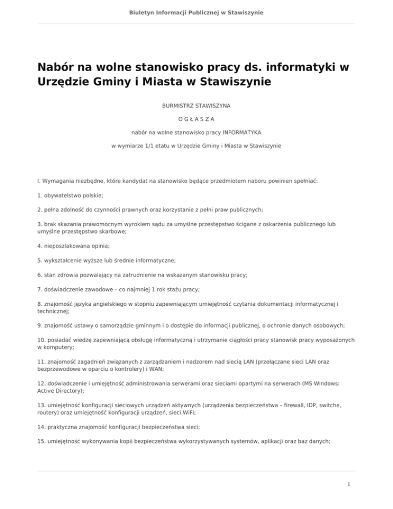 Biuletyn Informacji Publicznej w Stawiszynie Nabór na wolne stanowisko pracy ds. informatyki w Urzędzie Gminy i Miasta w Stawiszynie BURMISTRZ STAWISZYNA OGŁASZA nabór na wolne stanowisko pracy INFORMATYKA w wymiarze 1/1 etatu w Urzędzie Gminy i Miasta w Stawiszynie I. Wymagania niezbędne, które kandydat na stanowisko będące przedmiotem naboru powinien spełniać: 1. obywatelstwo polskie; 2. pełna zdolność do czynności prawnych oraz korzystanie z pełni praw publicznych; 3. brak skazania prawomocnym wyrokiem sądu za umyślne przestępstwo ścigane z oskarżenia publicznego lub umyślne przestępstwo skarbowe; 4. nieposzlakowana opinia; 5. wykształcenie wyższe lub średnie informatyczne; 6. stan zdrowia pozwalający na zatrudnienie na wskazanym stanowisku pracy; 7. doświadczenie zawodowe – co najmniej 1 rok stażu pracy; 8. znajomość języka angielskiego w stopniu zapewniającym umiejętność czytania dokumentacji informatycznej i technicznej; 9. znajomość ustawy o samorządzie gminnym i o dostępie do informacji publicznej, o ochronie danych osobowych; 10. posiadać wiedzę zapewniającą obsługę informatyczną i utrzymanie ciągłości pracy stanowisk pracy wyposażonych w komputery; 11. znajomość zagadnień związanych z zarządzaniem i nadzorem nad siecią LAN (przełączane sieci LAN oraz bezprzewodowe w oparciu o kontrolery) i WAN; 12. doświadczenie i umiejętność administrowania serwerami oraz sieciami opartymi na serwerach (MS Windows: Active Directory); 13. umiejętność konfiguracji sieciowych urządzeń aktywnych (urządzenia bezpieczeństwa – firewall, IDP, switche, routery) oraz umiejętność konfiguracji urządzeń, sieci WiFi; 14. praktyczna znajomość konfiguracji bezpieczeństwa sieci; 15. umiejętność wykonywania kopii bezpieczeństwa wykorzystywanych systemów, aplikacji oraz baz danych; 1 Biuletyn Informacji Publicznej w Stawiszynie 16. znajomość systemów operacyjnych i pakietów biurowych firmy Microsoft; 17. umiejętność diagnozowania usterek w oprogramowaniu, sieci i sprzęcie; 18. znajomość tzw. „dobrych praktyk” w bezpieczeństwie przetwarzania danych; 19. dyspozycyjność. II. Wymagania dodatkowe: 1. zdolność analitycznego myślenia i umiejętność pracy w zespole; 2. komunikatywność, samodzielność; 3. umiejętność planowania i organizacji pracy własnej; 4. podstawowa wiedza z zakresu tworzenia i publikacji treści w Internecie; 5. umiejętność obsługi programów graficznych; 6. wysoka kultura osobista. III. Zakres wykonywanych zadań na stanowisku: 1. prowadzenie i nadzorowanie całości spraw związanych z siecią informatyczną w Urzędzie; 2. prowadzenie, uzupełnianie, aktualizacja oraz odpowiedzialność za Biuletyn Informacji Publicznej oraz gminną stronę internetową; 2. pełnienie funkcji Administratora systemu zgodnie z ustawą o ochronie informacji niejawnych i ponoszenie odpowiedzialności za funkcjonowanie systemów lub sieci teleinformatycznych oraz przestrzeganie zasad i wymagań bezpieczeństwa systemów sieci teleinformatycznych; 2. zarządzanie licencjami oprogramowania posiadanymi przez Urząd oraz dbałość o legalność oprogramowania użytkowanego przez Urząd; 2. aktualizacja systemów operacyjnych, oprogramowania antywirusowego, oraz programowania biurowego wykorzystywanego przez Urząd na warunkach zgodnych z umowami licencyjnymi; 2. aktualizacja oprogramowania, oraz wsparcie w kwestiach technicznych dla użytkowników tego oprogramowania; 2. zarządzanie systemami kopii zapasowych, tworzenie harmonogramów kopii zapasowych, ustalanie zasad przechowywania kopii zapasowych, wykonywanie kopii zapasowych informacji znajdujących się na serwerach Urzędu; 2. zarządzanie, konfiguracja, ustalanie reguł filtrujących dla zapory sprzętowej firewall zabezpieczającej nieuprawniony dostęp z sieci Internet do zasobów Urzędu zawartych w systemach komputerowych; 2. w odniesieniu do sieci wewnętrznej Urzędu przeprowadzanie bieżących zmian w konfiguracji sieci, rozwój sieci, rozbudowa, oraz przebudowa sieci w zależności od aktualnych potrzeb; 2. konserwacja sprzętu komputerowego będącego na wyposażeniu Urzędu; 2. nadzór nad właściwym wywiązywaniem się z zapisów zawartych w umowach w przypadku świadczenia usług związanych z siecią komputerową, sprzętem komputerowym, bądź oprogramowaniem przez firmy trzecie; 2 Biuletyn Informacji Publicznej w Stawiszynie 2. planowanie wydatków związanych z rozwojem sieci teleinformatycznej w Urzędzie na każdy kolejny rok budżetowy; 2. odpowiedzialność za funkcjonowanie systemu, oraz sieci teleinformatycznej Urzędu oraz przestrzeganie zasad i wymagań bezpieczeństwa; 2. pełnienie funkcji administratora bezpieczeństwa informacji zgodnie z ustawą o ochronie danych osobowych; 2. usuwanie w miarę możliwości awarii sieci, urządzeń komputerowych oraz oprogramowania; 2. wdrażanie i nadzór nad podpisem elektronicznym i elektronicznym obiegiem dokumentów. IV. Wymagane dokumenty: 1. List motywacyjny oraz szczegółowy życiorys zawodowy (CV); 2. Oświadczenie kandydata o wyrażeniu zgody na przetwarzanie danych osobowych do celów rekrutacji; 2. Kwestionariusz osobowy; 2. Kserokopia lub odpis dokumentów potwierdzających: ⦁ staż pracy i zatrudnienie (świadectwa pracy lub inne dokumenty), ⦁ posiadane kwalifikacje i umiejętności (kserokopia dyplomów, zaświadczeń) niepełnosprawność, ⦁ w przypadku kandydatów, którzy zamierzają skorzystać z uprawnienia do pierwszeństwa do zatrudnienia na stanowiskach urzędniczych, z wyłączeniem kierowniczych stanowisk urzędniczych; 2. Oświadczenie o niekaralności oraz że nie toczy się przeciwko kandydatowi postępowanie karne za umyślne przestępstwa ścigane z oskarżenia publicznego lub umyślne przestępstwa skarbowe (wybrany kandydat zobowiązany będzie do przedłożenia zaświadczenia niekaralności wydanego przez Krajowy Rejestr Karny); 2. Oświadczen