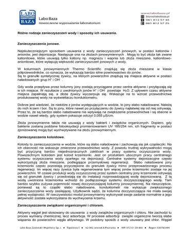 Różne rodzaje zanieczyszczeń wody i sposoby ich usuwania. Zanieczyszczenia jonowe. Najskuteczniejszym sposobem usuwania z wody zanieczyszczeń jonowych, w postaci kationów i anionów, jest dejonizacja. Następuje ona na złożach jonowymiennych . Mogą to być złoża tak zwane kationitowe, które usuwają tylko kationy np. magnezu i wapnia lub złoża mieszane, kationitowoanionitowe, które wyłapują większość zanieczyszczeń jonowych z wody. W kolumnach jonowymiennych Thermo Scientific znajdują się złoża mieszane w klasie półprzewodników, co oznacza, że wykazują bardzo silne powinowactwo do jonów. Są to granulki syntetycznej żywicy, na których powierzchni znajdują się miejsca aktywne w postaci naładowanych grup H+ i OH- . Gdy woda przepływa przez kolumny jony zostają przyciągane przez centra aktywne i przyłączają się w ich miejsce. W rezultacie z uwolnionych jonów H+ i OH- powstaje H2O. Z upływem czasu aktywne miejsca zapełniają się, a złoże żywicy wyczerpuje się. Wskazuje na to wzrost przewodnictwa produkowanej wody na wyświetlaczu konduktometru. Dobrze jest wiedzieć, że niektóre z jonów występujących w wodzie, to jony słabo naładowane. Należą do nich krzem i bor. Są to jony, które nawet po przyłączeniu do żywicy najłatwiej się od niej odrywają. Przez to, że są bardzo słabo naładowane nie wpływają na zwiększenie przewodnictwa i są obecne w wodzie nawet wtedy, gdy system pokazuje odczyt 0,055 µS/cm. Złoża jonowymienne także nie usuwają z wody bakterii i związków organicznych. Dopiero, gdy bakterie zostaną poddane fotooksydacji promieniowaniem UV 185/254 nm, ich fragmenty w postaci zjonizowanej mogą być wychwytywane na złożu jonowymiennym. Zanieczyszczenia koloidowe. Koloidy to zanieczyszczenia w wodzie, które są słabo naładowane i zachowują się jak cząsteczki. Na ich obecność nie wskazuje zmierzone przewodnictwo wody. Z powodu trudnej wykrywalności mogą być przyczyną bardzo niejednoznacznych zakłóceń w pracy systemu oczyszczania wody. Powszechnym koloidem jest koloid krzemionki. Jest on produktem ubocznym pracy centralnego systemu oczyszczania wody opartego na dejonizacji. Centralne systemy dejonizacyjne często wykorzystują złoża mieszane, podlegające przemysłowej regeneracji. Słabo naładowane jony krzemionki często pozostają przyczepione do granulek żywicy mimo przeprowadzonego procesu regeneracji. Im więcej razy żywica była regenerowana tym więcej jonów krzemionki zostaje na jej powierzchni. W czasie produkcji wody oczyszczonej przez system centralny jony krzemionki odrywają się od granulek żywicy i przedostają się do instalacji rozprowadzającej wodę dejonizowaną. Z tą wodą uwolniona krzemionka wchodzi do podłączonego systemu doczyszczającego wodę. Tam bardzo szybko zużywa pojemność nowej doczyszczającej kolumny jonowymiennej. Na nieszczęście, ponieważ są to cząstki słabo naładowane, konduktometr nie wykazuje zwiększonego zanieczyszczenia wody zasilającej. Użytkownik sądzi, że kolumna doczyszczająca nie miała swojej pełnej wydajności. W rzeczywistości moduł jonowymienny wykonywał swoje zadanie normalnie a jego aktywność została wykorzystana do wychwycenia krzemu. Zanieczyszczenie związkami organicznymi i chlorem. Aktywny węgiel jest stosowany do usuwania z wody związków organicznych i chloru. Nie zachodzi tu proces wymiany chemicznej, lecz adsorbcja. W procesie adsorbcji związki organiczne tworzą słabe wiązania do powierzchni węgla aktywnego. W podobny sposób z wody usuwany jest chlor. Węgiel może być wykorzystywany do różnych zadań w systemach oczyszczania wody. Może być użyty w ramach filtracji wstępnej, albo może być użyty w procesie doczyszczania do wody ultraczystej. Węgiel jest w stanie zredukować TOC nawet do 10 ppb. Jeśli potrzebujemy uzyskać TOC jeszcze niższy trzeba zastosować inną technologię np. fotooksydację. Zanieczyszczenia TOC. Aby znacznie zredukować zawartość TOC w wodzie ultraczystej w systemach oczyszczania wody wykorzystuje się promieniowanie UV. Żarniki o długości fali 254 nm, tzw. sterylizujące, niszczą bakterie i są w stanie zredukować TOC poniżej 30 ppb. Żarniki o podwójnej długości fali 185/254 nm tzw. fotooksydujące nie tylko sterylizują wodę, ale także rozrywają wiązania związków organicznych w wyniku czego pozostaje woda, dwutlenek węgla i pozostałe jony. W ten sposób TOC może zostać zredukowany do wartości poniżej 5 ppb, a uwolnione jony zostają łatwo usunięte przez kolumny jonowymienne. Światło UV jest tym skuteczniejsze im ma bliższy kontakt z wodą. Dlatego efektywniej działają lampy UV przepływowe, niż zanurzeniowe. W lampach przepływowych woda ma bliski kontakt ze światłem UV podczas regularnej recyrkulacji w systemie. Lampy zanurzeniowe umieszczone w zbiorniku z wodą działają na całą jej objętość i dalsze obszary są słabiej napromieniowywane. Przy czym recyrkulacja wody jest w tym przypadku bardzo istotna, bo dzięki niej fotooksydacja następuje na bieżąco przed poborem wody. Jeśli pracuje się nad analizami śladowymi i redukcja TOC jest istotna, warto pomyśleć o wyposażeniu stacji wody w moduł UV już przy konfigurowaniu sprzętu. Istotne jest bowiem, aby moduł UV był wbudowany w system we właściwym miejscu a nie dodany później na końcu obiegu. Trzeba wiedzieć, że żarnik UV z czasem traci intensywność promieniowania, dlatego właściwą praktyką jest regularna jego wymiana. Żywotność żarnika zależy od ilości przepracowanych godzin, ale średnio można powiedzieć, że wynosi około 2 lat. Cząstki i bakterie. Cząstki i bakterie, które jeszcze w jakiś sposób pojawiły się w wodzie w systemie są wyłapywane na filtrze końcowym. Jest to filtr sterylny, a to oznacza, że zatrzymuje wszystkie cząstki o średnicy większej od 0,2 µm. Znajduje się on na zewnątrz obwodu recyrkulacyjne