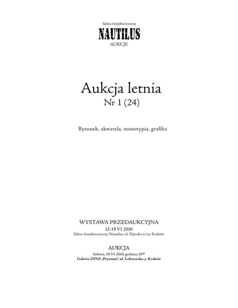 Salon Antykwaryczny AUKCJE Aukcja letnia Nr 1 (24) Rysunek, akwarela, monotypia, grafika WYSTAWA PRZEDAUKCYJNA 12-19 VI 2010 Salon Antykwaryczny Nautilus, ul. Pijarska 5/2a, Kraków AUKCJA Sobota, 19 VI 2010, godzina 1200 Galeria ZPAP „Pryzmat”, ul. Łobzowska 3, Kraków Salon Antykwaryczny Michał Maksymiuk, Maciej Żywolewski ul. Pijarska 5/2a 31-015 Kraków tel.: + 48 12 422 91 60 fax: + 48 12 432 94 40 kom.: 0695899895 e-mail: [email protected] www.antique.com.pl; www.artlist.pl; www.nautilus-art.pl BANK PEKAO S.A. III O/ KRAKÓW Nr konta: 46124022941111000037089120 OPRACOWANIE KATALOGU: Michał Maksymiuk, Roman Marcinek, Maciej Żywolewski Współpraca: Aleksandra Madej, Agnieszka Mazoń SKŁAD, ZDJĘCIA: Aleksandra Madej, Agnieszka Mazoń, Maciej Żywolewski COPYRIGHT: © Nautilus Salon Antykwaryczny 2010 poz. 262 Zawartość katalogu I. II. III. IV. V. VI. VII. Plany, widoki, mapy Akwarela, monotypia, rysunek Grafika dawna Dawne portrety Grafika XX i XXI wieku Biogramy Indeksy poz. poz. poz. poz. poz. 1-51 52-108 109-122 123-140 141-302 s. 50 s. 58 Reprodukcje wszystkich prac można zobaczyć na stronie internetowej www.artlist.pl Aukcja Letnia nr 1 (24) poz. 19 poz. 3 poz. 49 4| poz. 21 poz. 20 | Akwarela, monotypia, rysunek | Grafika dawna | Portrety | Grafika widokowa | Biogramy | Indeks | poz. 27 poz. 33 poz. 8 poz. 9 poz. 29.2 poz. 4 |5 Plany, widoki, mapy poz. 7 poz. 1 poz. 2 1. Zamek w Bobrownikach Mann C.A., 1851 Litografia tonowana; wym. komp.: 115 x 197 mm (wym. pl.: 155 x 240 mm); sygn. pł.: Lith. v. C.A. Mann (gedr. v Otto Grote); Lith. Inst. V. C.G. Kanter in Marienwerder; polsko-niemieckie napisy tytułowe. Stan zachowania: zbrązowienie w obrębie kompozycji. Grafika z: F. Brändstater, „Die Weichsel historisch, topographisch, malerisch unter Mitwirkung einer Anzahl von Kundigen Manner beschrieben von …”, Marienwerder (Kwidzyn), 1851. Cena wyw.: 300 2. Chełmno nad Wisłą [Przeprawa promowa i panorama] Mann C.A., 1851 Litografia tonowana; wym. komp.: 117 x 198 mm (wym. pl.: 155 x 240 mm); sygn. pł.: Lith. v. C.A. Mann (gedr. v Otto Grote); Lith. Inst. V. C.G. Kanter in Marienwerder; niemieckie napisy tytułowe. Stan zachowania: zbrązowienie w obrębie kompozycji. Grafika z jw. Cena wyw.: 300 3. Częstochowa. Oblężenie Jasnej Góry przez wojska szwedzkie Bodenehr Gabriel St., początek XVIII w. Miedzioryt; wym.: 169 x 280 mm; sygn. p.d. G. Bodenehr fec. et exc. A.V [Aug. Vind. (=Augsburg)]; po prawej i lewej stronie grafiki opisy w językach polskim i niemieckim, komentujące przebieg działań wojennych. Grafika (nr 39) pochodzi z dzieła G. Bodenehra „Curiose Staats und Kriegs Theatrum in Polen durch unterschiedliche geographische, topographische und historische Land-Carten, Grundrisse und Prospect Erläutert”. Augspurg (Augsburg) b.r. (ok. 1730). (il. s. 4) Cena wyw.: 1200 poz. 5 poz. 6 6| 4. Fantastyczny widok polskiego miasta Schedel Hartmann, 1493 Drzeworyt; wym.: 192 x 223, wym. karty: 443 x 299 mm; karta z Liber Chronicarum, Nuremberg (oficyna Antona Kobergera), 1493; ilustracja towarzyszy opisowi Polski; na odwrocie opisy Moraw i Śląska; karta z 1 edycji (łacińskiej) z lipca 1493. (il. s. 5) Cena wyw.: 1000 5. Gdańsk. Wydmy koło Górek Zachodnich Mann C.A., 1851 Litografia tonowana; wym. komp.: 119 x 199 mm (wym. pl.: 155 x 240 mm); sygn. pł.: Gez. u. Lith. v. C.A. Mann; Lith. Inst. v. C.G. Kanter in Marienwerder; niemieckie napisy tytułowe. Stan zachowania: zbrązowienie w obrębie kompozycji. Grafika z: F. Brändstater, „Die Weichsel historisch, topographisch, malerisch unter Mitwirkung einer Anzahl von Kundigen Manner beschrieben von …”, Marienwerder (Kwidzyn), 1851. Cena wyw.: 300 7. Gdańsk. Zielona Brama i Zielony Most na Motławie Mann C.A., 1851 Litografia tonowana; wym. komp.: 119 x 197 mm (wym. pl.: 155 x 240 mm); sygn. pł.: Gez. u. Lith. v. C.A. Mann; Lith. Inst. V. C.G. Kanter in Marienwerder; niemieckie napisy tytułowe. Stan zachowania: zbrązowienie w obrębie kompozycji. Grafika z jw. Cena wyw.: 300 poz. 11 8. Gdańsk. Widok przeprawy przy Gęsiej Karczmie Mann C.A., 1851 Litografia tonowana; wym. komp.: 119 x 201 mm (wym. pl.: 155 x 240 mm); sygn. pł.: Gez. u. Lith. v. C.A. Mann; Lith. Inst. V. C.G. Kanter in Marienwerder; polsko-niemieckie napisy tytułowe. Stan zachowania: zbrązowienie w obrębie kompozycji. Grafika z jw. (il. s. 5) Cena wyw.: 300 9. Gdańsk. Dworzec kolejowy i Biskupia Górka Mann C.A., 1851 Litografia tonowana; wym. komp.: 120 x 200 mm (wym. pl.: 155 x 240 mm); sygn. pł.: N.D. Natur gez. (gedr. v Otto Grote); Lith. Inst. V. C.G. Kanter in Marienwerder; niemieckie napisy tytułowe. Stan zachowania: zbrązowienie w obrębie kompozycji. Grafika z jw. (il. s. 5) Cena wyw.: 300 poz. 13 10. Gdańsk. Wejście do portu Mann C.A. Litografia tonowana; wym. komp.: 120 x 201 mm (wym. pl.: 155 x 240 mm); sygn. pł.: Gez. u. Lith. v. C.A. Mann; Lith. Inst. V. C.G. Kanter in Marienwerder; polsko napisy tytułowe. Stan zachowania: zbrązowienie w obrębie kompozycji. Grafika z jw. Cena wyw.: 300 11. Gdańsk. Plac Dominikański Mann C.A. Litografia tonowana; wym. komp.: 119 x 199 mm (wym. pl.: 155 x 240 mm); sygn. pł.: Gez. u. Lith. v. C.A. Mann; Lith. Inst. V. C.G. Kanter in Marienwerder; niemieckie napisy tytułowe. Stan zachowania: zbrązowienie w obrębie kompozycji. Grafika z jw. Cena wyw.: 400 12. Gdańsk. Klasztor w Oliwie Mann C.A. Litografia tonowana; wym. komp.: 119 x 198 mm (wym. pl.: 155 x 240 mm); sygn. pł.: Gez. u. Lith. v. C.A. Mann; Lith. Inst. V. C.G. Kanter in Marienwerder; niemieckie napisy tytułowe. Stan zachowania: zbrązowienie w obrębie kompozycji, niewielkie ślady odbitego druku. Grafika z jw. Cena wyw.: 300 13. Genua i Florencja Camocio G. F., ok. 1572 Miedzioryt; wym.: 330 x 480 mm; nie sygn.; w opisach pod kompozycjami: cum priuilegio. Widoki panoramiczne miast, opisy w kartuszach; widok Genui uzupełniony o opisy przedmiejskich poz. 14 umocnień i infrastruktury portu