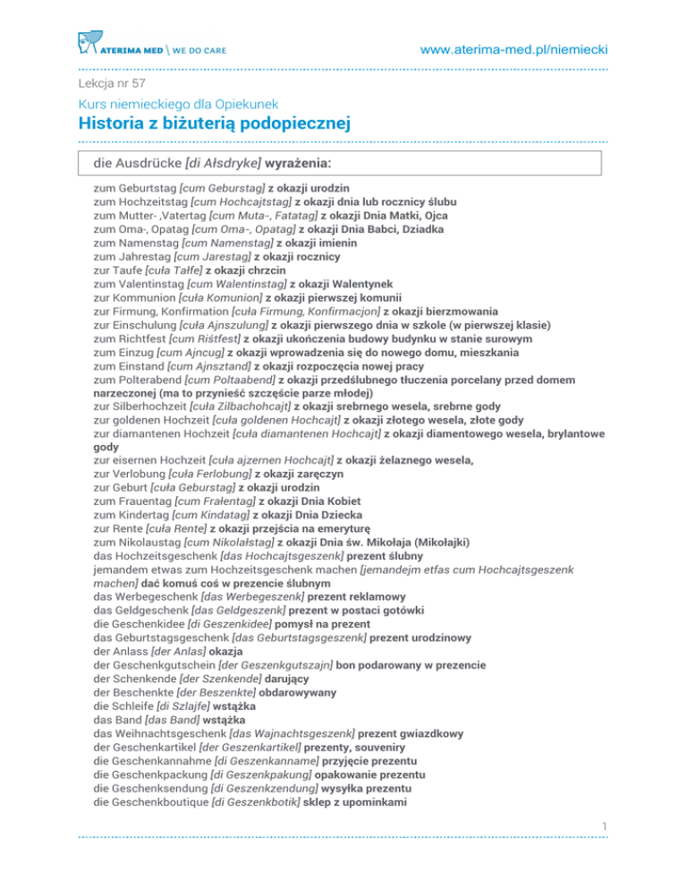 www.aterima-med.pl/niemiecki Lekcja nr 57 Kurs niemieckiego dla Opiekunek Historia z biżuterią podopiecznej die Ausdrücke [di Ałsdryke] wyrażenia: zum Geburtstag [cum Geburstag] z okazji urodzin zum Hochzeitstag [cum Hochcajtstag] z okazji dnia lub rocznicy ślubu zum Mutter- ,Vatertag [cum Muta-, Fatatag] z okazji Dnia Matki, Ojca zum Oma-, Opatag [cum Oma-, Opatag] z okazji Dnia Babci, Dziadka zum Namenstag [cum Namenstag] z okazji imienin zum Jahrestag [cum Jarestag] z okazji rocznicy zur Taufe [cuła Tałfe] z okazji chrzcin zum Valentinstag [cum Walentinstag] z okazji Walentynek zur Kommunion [cuła Komunion] z okazji pierwszej komunii zur Firmung, Konfirmation [cuła Firmung, Konfirmacjon] z okazji bierzmowania zur Einschulung [cuła Ajnszulung] z okazji pierwszego dnia w szkole (w pierwszej klasie) zum Richtfest [cum Riśtfest] z okazji ukończenia budowy budynku w stanie surowym zum Einzug [cum Ajncug] z okazji wprowadzenia się do nowego domu, mieszkania zum Einstand [cum Ajnsztand] z okazji rozpoczęcia nowej pracy zum Polterabend [cum Poltaabend] z okazji przedślubnego tłuczenia porcelany przed domem narzeczonej (ma to przynieść szczęście parze młodej) zur Silberhochzeit [cuła Zilbachohcajt] z okazji srebrnego wesela, srebrne gody zur goldenen Hochzeit [cuła goldenen Hochcajt] z okazji złotego wesela, złote gody zur diamantenen Hochzeit [cuła diamantenen Hochcajt] z okazji diamentowego wesela, brylantowe gody zur eisernen Hochzeit [cuła ajzernen Hochcajt] z okazji żelaznego wesela, zur Verlobung [cuła Ferlobung] z okazji zaręczyn zur Geburt [cuła Geburstag] z okazji urodzin zum Frauentag [cum Frałentag] z okazji Dnia Kobiet zum Kindertag [cum Kindatag] z okazji Dnia Dziecka zur Rente [cuła Rente] z okazji przejścia na emeryturę zum Nikolaustag [cum Nikolałstag] z okazji Dnia św. Mikołaja (Mikołajki) das Hochzeitsgeschenk [das Hochcajtsgeszenk] prezent ślubny jemandem etwas zum Hochzeitsgeschenk machen [jemandejm etfas cum Hochcajtsgeszenk machen] dać komuś coś w prezencie ślubnym das Werbegeschenk [das Werbegeszenk] prezent reklamowy das Geldgeschenk [das Geldgeszenk] prezent w postaci gotówki die Geschenkidee [di Geszenkidee] pomysł na prezent das Geburtstagsgeschenk [das Geburtstagsgeszenk] prezent urodzinowy der Anlass [der Anlas] okazja der Geschenkgutschein [der Geszenkgutszajn] bon podarowany w prezencie der Schenkende [der Szenkende] darujący der Beschenkte [der Beszenkte] obdarowywany die Schleife [di Szlajfe] wstążka das Band [das Band] wstążka das Weihnachtsgeschenk [das Wajnachtsgeszenk] prezent gwiazdkowy der Geschenkartikel [der Geszenkartikel] prezenty, souveniry die Geschenkannahme [di Geszenkanname] przyjęcie prezentu die Geschenkpackung [di Geszenkpakung] opakowanie prezentu die Geschenksendung [di Geszenkzendung] wysyłka prezentu die Geschenkboutique [di Geszenkbotik] sklep z upominkami 1 www.aterima-med.pl/niemiecki die Geschenktipps [di Geszenktyps] wskazówki, rady co kupić na prezent der Geschenkumschlag [der Geszenkumszlag] koperta upominkowa der Geschenkanhänger [der Geszenkanhenga] wisiorek die Geschenkkarte [di Geszenkkarte] karta podarunkowa das Geschenkpapier [das Geszenkpapija] papier do pakowania prezentów etwas in Papier packen [etfas in Papija paken] zapakowac coś w papier das Klebeband/ der Klebestreifen [das Klebeband / der Klebesztrajfen] taśma klejąca doppelseitiges Klebeband [dopelzajtiges Klebeband] dwustronna taśma klejąca die Geschenktüte [di Geszenktyte] torebka na prezent ein großzügiges Geschenk [ajn groscygiges Geszenk] wspaniałomyślny prezent ein ausgefallenes Geschenk [ajn ałsgefalenes Geszenk] wyszukany prezent jemandem ein Geschenk machen [jemandejm ajn Geszenk machen] zrobić komuś prezent Geschenke verteilen [Geszenke fertajlen] rozdawać prezenty ein Geschenk aussuchen, erhalten, annehmen [ajn Geszenk ałs-zuchen, erhalten, annejmen] wybrać, otrzymać, przyjąć prezent er überhäufte ihn mit Geschenken [er ybahojfte in mit Geszenken] zasypał go prezentami etwas als Geschenk verpacken [etfas als Geszenk ferpaken] zapakować jako prezent eine Schleife um das Geschenk herummachen [ajne Szlajfe um das Geszenk herummachen] przewiązać prezent wstążką jemandem den Abschied mit einem Geschenk versüßen [jemandejm den Abszid mit ajnem Geszenk fer-zysen] osłodzić komuś pożeganienie prezentem jemandem etwas zum Geburtstag schenken [jemandejm etfas cum Geburtstag szenken] podarować coś komuś na urodziny etwas von jemandem geschenkt bekommen [etfas fon jemandejm geszenkt bekomen] otrzymać coś od kogoś w prezencie geschenkt ist geschenkt, wiederholen ist gestohlen [geszenkt yst geszenkt, widaholen yst gesztolen] kto daje i odbiera, ten się w piekle poniewiera einen geschenkten Gaul sieht man nicht ins Maul [ajnen geszenkten Gałl zit man niśt ins Małl] darowanemu koniowi nie zagląda się w zęby ein Geschenk des Himmels [ajn Geszenk des Hymels] dar niebios kleine Geschenke erhalten die Freundschaft [klajne Geszenke erhalten di Frojndszaft] drobne upominki podtrzymują przyjaźń Geschenke bringen Ränke [Geszenke bringen Renke] prezenty zobowiązują jemandem eine Kleinigkeit schenken [jemandejm ajne Klajniśkajt szenken] podarować komuś jakiś drobiazg jemanden mit etwas beschenken [jemandejn mit etfas beszenken] obdarować kogoś czymś ein Geschenk für jeden Anlass [ajn Geszenk fyr jeden Anlas] prezent na każdą okazję Materiał stanowi własność firmy ATERIMA Sp. z o.o. Sp. K. ul. Puszkarska 7f, 30-644 Kraków. Reprodukcja, rozpowszechnianie lub inne wykorzystywanie całości lub części materiału w jakiejkolwiek formie dla celów innych, niż cele niekomercyjne i osobiste jest zakazane. 2 Powered by TCPDF (www.tcpdf.org)