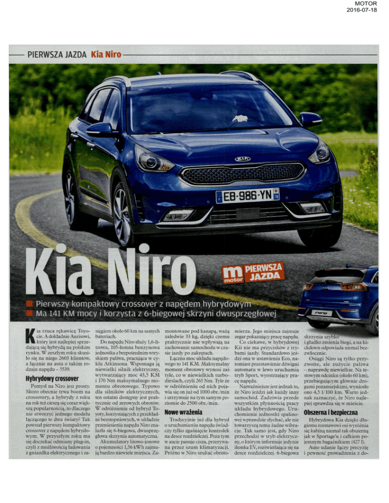 MOTOR 2016-07-18 PIERWSZA JAZDA Kia Niro . WEB-986 •• f I K ia rzuca rękawicę Toyo cie. A dokładnie Aurisowi, który jest najlepiej sprze dającą się hybrydą na polskim rynku. W zeszłym roku skusi ło się na niego 2603 klientów, a łącznie na auta o takim ro dzaju napędu- 5539. Hybrydowy crossover Pomysł na Niro jest prosty. Skoro obecnie trwa boom na crossovery, a hybrydy z roku na rok też cieszą się coraz więk szą popularnością, to dlaczego nie stworzyć jednego modelu łączącego te dwa światy? Tak powstał pierwszy kompaktowy crossover z napędem hybrydo wym. W przyszłym roku ma się doczekać odmiany plug-in, czyli z możliwością ładowania z gniazdka elektrycznegoi za sięgiem około 60 km na samych bateriach. Do napędu Niro służy 1,6-litrowa, 105-konna benzynowa jednostka z bezpośrednimwtry skiem paliwa, pracująca w cy klu Atkinsona. Wspomaga ją niewielki silnik elektryczny, wytwarzający moc 43,5 KM i 170 Nm maksymalnego mo mentu obrotowego. Typowo dla silników elektrycznych, ten ostatni dostępny jest prak tycznie od zerowych obrotów. W odróżnieniu od hybryd To yoty, korzystających z przekład ni bezstopniowych, w układzie przeniesienia napęduNiro zna lazła się 6-biegowa, dwusprzęgłowa skrzynia automatyczna. Akumulatory litowo-jonowe o pojemności 1,56 kWh zajmu ją bardzo niewiele miejsca. Za montowane pod kanapą, ważą zaledwie 33 kg, dzięki czemu praktycznie nie wpływają na zachowanie samochodu w cza sie jazdy po zakrętach. Łączna moc układu napędo wego to 141 KM. Maksymalny moment obrotowy wynosi zaś tyle, co w niewielkich turbodieslach, czyli 265 Nm. Tyle że w odróżnieniu od nich poja wia się on już od 1000 obr./min i utrzymuje na tym samym po ziomie do 2500 obr./min. mierza. Jego miejsca zajmuje zegar pokazujący pracę napędu. Co ciekawe, w hybrydowej Kii nie ma przycisków z try bami jazdy. Standardowo jeź dzi ona w ustawieniu Eco, na tomiast przestawienie dźwigni automatu w lewo uruchamia tryb Sport, wyostrzający pra cę napędu. Najważniejsze jest jednak to, że Niro jeździ jak każdy inny samochód. Zadziwia przede wszystkim płynnością pracy układu hybrydowego. Uru Nowe wrażenia chomienie jednostki spalino Tradycyjnie już dla hybryd wej wprawdzie słychać, ale nie o uruchomieniu napędu świad towarzyszą temu żadne wibra czy tylko zgaśnięcie kontrolek cje. Tak samo jest, gdy Niro na desce rozdzielczej. Poza tym przechodzi w tryb elektrycz w aucie panuje cisza,przerywa ny, o którym informuje jedynie na przez szum klimatyzacji. ikonka EV,rozświetlająca się na Próżno w Niro szukać obroto desce rozdzielczej. 6-biegowa skrzynia szybko i gładko zmienia biegi, a na kickdown odpowiada niemalbez zwłocznie. Osiągi Niro są tylko przy zwoite, ale zużycie paliwa - naprawdę niewielkie. Na te stowym odcinku (około 60 km), przebiegającym głównie dro gami pozamiejskimi, wyniosło ono 4,5 1/100 km. Warto jed nak zaznaczyć, że Niro najle piej sprawdza się w mieście. Obszerna i bezpieczna Hybrydowa Kia dzięki dłu giemu rozstawowi osi wyróżnia się kabiną niemal tak obszerną jak w Sportage'u i całkiem po jemnym bagażnikiem (4271). Auto udanie łączy precyzję i pewność prowadzenia z do- MOTOR 2016-07-18 Sylwetka Niro może się podobać. Auto prowadzi się przewi dywalnie i zapewnia dobry komfort. Po dobnie jak inne mo dele Kii, jest objęte aż 7-letnią gwarancją mechaniczną. Deskę rozdzielczą w górnej części wykończono miękkim materiałem. Ogólna jakość jest dobra, a obsługa - nieskomplikowana. W miej* scu obrotomierza znalazł się wskaźnik pokazujący sposób pracy napędu hybrydowego. Nieco dziwi nożny hamulec postojowy. f1Energy Flow C-") ——^ Fuet mgmj Kia może być wyposażona m.in. w asysten tów martwego pola oraz pasa ruchu. Bettery Na centralnym ekranie można obserwować przepływ energii w napędzie hybrydowym. Drym komfortem. Oferuje też bogate wyposażenie z zakresu bezpieczeństwa, m.in. systemy autonomicznego hamowania iutrzymywania w pasie ruchu, czy też aktywny tempomat. Czas pokaże, czy Niro za grozi hybrydowemu Aurisowi, kosztującemu od 79 900 zi (po rabacie). W końcu ma ku temu Pozycja za kierownicą jest niemal typowa dla zwyczaj mnóstwo argumentów. TEKST: M.STRUK. ZDJĘCIA: KIA, AUTOR _^El*trk motor nych aut osobowych. Z przodu miejsca nie brakuje. Indukcyjna ładowarka do telefonu to wy posażenie seryjne najdroższej odmiany XL. Bagażnik ma niezłą pojemność 4271. Pod podłogą znala zły się funkcjonal ne przegródki. Z tyłu podłoga jest prawie płaska. Dużo miejsca dla pasażerów. DANE TECHNICZNE I KIA NIRO Silnik Pojemność skokowa Układ cylindrów/zawory Kia Niro na tle innych modeli koreańskiego producenta Kia Cee'd: od 56 990 zł Kia Sportage: od 75 990 zł Kia Niro: od 86 900 zł benz. + elektr. 1580 cm3 R4/16 Moc maksymalna* 141KM/5700 Maks. moment obrotowy* 265 Nm/1000 OSIĄGI Prędkość maksymalna Przyspieszenie O-lOO km/h Zużycie paliwa** 162 km/h 11,5 S 3,8/3,9/3,8 86 900 ZŁ 265 cm 431 cm r* 270 cm 436 cm •; 267 cm 448 cm •; 29/2016 Motor