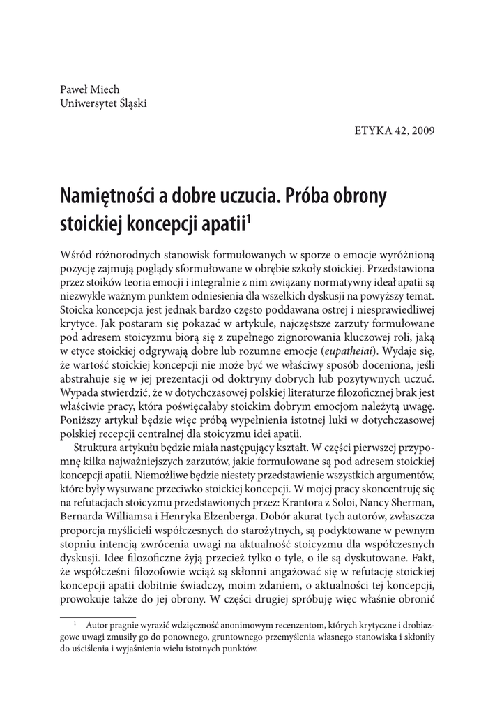 Paweł Miech Uniwersytet Śląski ETYKA 42, 2009 Namiętności a dobre uczucia. Próba obrony stoickiej koncepcji apatii1 Wśród różnorodnych stanowisk formułowanych w sporze o emocje wyróżnioną pozycję zajmują poglądy sformułowane w obrębie szkoły stoickiej. Przedstawiona przez stoików teoria emocji i integralnie z nim związany normatywny ideał apatii są niezwykle ważnym punktem odniesienia dla wszelkich dyskusji na powyższy temat. Stoicka koncepcja jest jednak bardzo często poddawana ostrej i niesprawiedliwej krytyce. Jak postaram się pokazać w artykule, najczęstsze zarzuty formułowane pod adresem stoicyzmu biorą się z zupełnego zignorowania kluczowej roli, jaką w etyce stoickiej odgrywają dobre lub rozumne emocje (eupatheiai). Wydaje się, że wartość stoickiej koncepcji nie może być we właściwy sposób doceniona, jeśli abstrahuje się w jej prezentacji od doktryny dobrych lub pozytywnych uczuć. Wypada stwierdzić, że w dotychczasowej polskiej literaturze filozoficznej brak jest właściwie pracy, która poświęcałaby stoickim dobrym emocjom należytą uwagę. Poniższy artykuł będzie więc próbą wypełnienia istotnej luki w dotychczasowej polskiej recepcji centralnej dla stoicyzmu idei apatii. Struktura artykułu będzie miała następujący kształt. W części pierwszej przypomnę kilka najważniejszych zarzutów, jakie formułowane są pod adresem stoickiej koncepcji apatii. Niemożliwe będzie niestety przedstawienie wszystkich argumentów, które były wysuwane przeciwko stoickiej koncepcji. W mojej pracy skoncentruję się na refutacjach stoicyzmu przedstawionych przez: Krantora z Soloi, Nancy Sherman, Bernarda Williamsa i Henryka Elzenberga. Dobór akurat tych autorów, zwłaszcza proporcja myślicieli współczesnych do starożytnych, są podyktowane w pewnym stopniu intencją zwrócenia uwagi na aktualność stoicyzmu dla współczesnych dyskusji. Idee filozoficzne żyją przecież tylko o tyle, o ile są dyskutowane. Fakt, że współcześni filozofowie wciąż są skłonni angażować się w refutację stoickiej koncepcji apatii dobitnie świadczy, moim zdaniem, o aktualności tej koncepcji, prowokuje także do jej obrony. W części drugiej spróbuję więc właśnie obronić Autor pragnie wyrazić wdzięczność anonimowym recenzentom, których krytyczne i drobiazgowe uwagi zmusiły go do ponownego, gruntownego przemyślenia własnego stanowiska i skłoniły do uściślenia i wyjaśnienia wielu istotnych punktów. 1 138 Paweł Miech stoicką koncepcję przed jej krytykami poprzez wskazanie, że Stoa nie wymaga wcale wykorzenienia wszelkich emocji (co przypisują szkole jej krytycy). Celem zalecanej przez uczniów Zenona z Kition terapii emocjonalnej jest jedynie wykorzenienie emocji destruktywnych, czyli pathe. By dowieść tej tezy najpierw przedstawię właściwy sens pojęcia pathe, czyli namiętności. Następnie w części trzeciej przejdę do analizy głównych założeń stoickiej teorii dobrych emocji (eupatheiai). Moja prezentacja doktryny stoickiej może się narazić na zarzut pewnej ahistoryczności. Omawiam bowiem stoicyzm jako jedność, abstrahując od oczywistego faktu historycznej ewolucji stoicyzmu w ogóle, a także samej stoickiej doktryny apatii. Takie ujednolicenie stoicyzmu jest jednak podyktowane chęcią zwrócenia uwagi na aktualność i wartość tej teorii dla współczesnych dyskusji. Rozbicie stoicyzmu na ciąg kolejno następujących po sobie szkół i myślicieli, drobiazgowe przedstawienie całego historycznego zróżnicowania tego ruchu utrudnia lub w ogóle uniemożliwia wprowadzenie stoickiej koncepcji apatii do współczesnych dyskusji filozoficznych, co jest intencją mojego artykułu. Omówienie ewolucji doktryny stoickiej wymagałoby bowiem przeanalizowania wewnętrznych sporów i dyskusji toczących się w obrębie szkoły, a to niejako od wewnątrz podważałoby stoickie stanowisko i szykowało łatwy tryumf jego oponentom. Z drugiej strony, za moim potraktowaniem stoicyzmu jako pewnego jednolitego nurtu stoi także głębokie przekonanie, iż mimo historycznej ewolucji i wewnętrznego zróżnicowania istnieją jednak pewne fundamentalne założenia, które wyróżniają stoicyzm jako pewne klarowne i warte obrony stanowisko filozoficzne. Teoria dobrych emocji, którą omawiam w punkcie trzecim artykułu zalicza się moim zdaniem właśnie do tego typu założeń fundamentalnych, jej elementy znajdujemy bowiem zarówno u założycieli szkoły (Zenona i Chryzypa)2, jak i u stoików rzymskich (Seneki, Epikteta, Marka Aureliusza), czego dowodem są teksty im przypisywane3. Przedmiotem artykułu 2 W literaturze można spotkać czasem pogląd (prezentowany m.in. przez jednego z recenzentów niniejszego artykułu), że doktryna eupatheiai jest rezultatem ewolucji stoicyzmu, dokonywanej w odpowiedzi na krytyczne zarzuty pod adresem stoików. Gdyby pogląd ten był prawdziwy, to fałszem byłaby historyczno–filozoficzna teza „doktryna eupatheiai była częścią doktryny Starej Stoi”. Mój artykuł zakłada tę tezę, lecz dowodzenie jej prawdziwości wykracza poza ramy niniejszego artykułu. Dość powiedzieć, że o tym, że doktryna eupatheiai istniała już w Starej Stoi świadczą następujące fragmenty u Diogenesa Laertiosa: DL, VII, 116 (ogólna klasyfikacja eupatheiai, przypisana Starej Stoi), DL, VII 33 (tylko ludzie cnotliwi mogą być dobrymi przyjaciółmi, a przyjaźń to jedno z dobrych uczuć), DL, VII, 120 („miłość rodziców ku dzieciom uważają za uczucie naturalne, którego nie znają jednak ludzie źli”), DL, VII, 124 („Stoicy mówią także, że przyjaźń możliwa jest tylko wśród ludzi dobrych”), DL, VII, 130 (nie tylko Zenon, ale i Chryzyp napisał traktat „O miłości”, w którym wypowiadał się o niej pozytywnie), DL, VII, 131 („Mędrcy powinni mieć wspólne żony” ponieważ tyko „wtedy jednakowo kochaliby wszystkie dzieci”. Wszystkie 