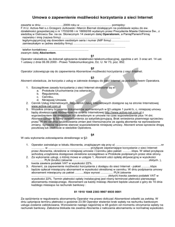 Umowa o zapewnienie moŜliwości korzystania z sieci Internet zawarta w dniu ...........................2009 roku w ...................................... pomiędzy: F.H.U. Active-Net s.c.Grzegorz Jurkowski i Marcin Biernat działającym na podstawie wpisu do ew. działalności gospodarczej o nr 17032/06 i nr 16692/06 wydanym przez Prezydenta Miasta Ostrowca Św., z siedzibą w Ostrowcu Św. na os. Słonecznym 14 zwanym dalej Operatorem, a Panią/Panem/Firmą: nazwisko i imię (nazwa firmy) ........................................................................ legitymującym(cą) się dowodem osobistym seria i numer (NIP firmy) ...................... zamieszkałym w (adres siedziby firmy) .................................................. ................................................................................................................................ telefon kontaktowy .................................................. zwanym dalej Abonentem. §1 Operator oświadcza, Ŝe dokonał zgłoszenia działalności telekomunikacyjnej, zgodnie z art. 3 oraz art. 14 ust. 1 ustawy z dnia 06.09.2000 - Prawo Telekomunikacyjne, Dz. U. Nr 73, poz. 852. §2 Operator zobowiązuje się do zapewnienia Abonentowi moŜliwości korzystania z sieci Internet. §3 Abonent oświadcza, Ŝe korzysta z usług w zakresie dostępu do sieci Internet za pośrednictwem Operatora. 1. Szczegółowe zasady korzystania z sieci Internet określone są w: a. Protokole Uruchomienia (na odwrocie), b. Regulaminie, c. Cenniku, d. Niniejszej Umowie. 2. Cennik Usług Internetowych, Regulamin Usług Internetowych dostępne są na stronie Internetowej www.active-net.com.pl 3. Wszelkie zmiany brzmienia dokumentów wymienionych w §3 ustępie 1 punkt b, c, niniejszej umowy będą obwieszczane Abonentowi na stronie Internetowej http://www.active-net.com.pl z wyprzedzeniem nie mniejszym niŜ określonym w umowie na czas wypowiedzenia plus 14 dni. Abonent uznaje tę formę powiadomienia za satysfakcjonującą. Brak wniesienia pisemnego sprzeciwu przez 14 dni od dnia opublikowania zmian jest równoznaczne ze zgodą abonenta na wprowadzone zmiany. Sprzeciw na piśmie stanowi wypowiedzenie niniejszej umowy. Abonent wnosi sprzeciw drogą pocztową lub osobiście w siedzibie Operatora. §4 W celu wykonania zobowiązania określonego w §2: 1. Operator zainstaluje w lokalu Abonenta, znajdującym się przy ul. .......................................................nr ................ w ................................................... przyłącze zapewniające korzystanie z sieci Internet przez Abonenta, określone w niniejszej umowie i Cenniku jako pakiet: ...........kbps. W skład przyłącza wchodzą urządzenia dostępowe określone szczegółowo w Protokole podpisanym przez obie strony. 2. Za wykonanie usługi, o której mowa w ustępie 1, Abonent uiści opłatę aktywacyjną w wysokości ............... PLN (brutto) (słownie .............................................................................................złotych. ), kwota zawiera podatek VAT w wysokości 22%. 3. Abonent, za zapewnienie moŜliwości korzystania z dostępu do sieci Internet - pakiet ...........kbps będzie opłacał miesięczny abonament w wysokości określonej w cenniku. W dniu podpisania umowy abonament miesięczny za pakiet ...........kbps wynosi ............... PLN (słownie ............................................................................................. złotych) kwota zawiera podatek VAT w wysokości 22%. Termin płatności opłaty instalacyjnej jest równy terminowi płatności pierwszego abonamentu miesięcznego. Abonament za kaŜdy miesiąc Abonent będzie uiszczał z góry do 10 dnia kaŜdego miesiąca na rachunek bankowy : 81 1910 1048 2303 9907 6935 0001 Za opóźnienia w regulowaniu abonamentu Operator ma prawo doliczać Abonentowi odsetki za zwłokę. W dniu upłynięcia terminu płatności o godzinie 23.59 Operator stwierdzi brak wpłaty na rachunku bankowym usługa zostanie zablokowana. Wznowienie nastąpi najpóźniej w 48 godzin od momentu otrzymania wpłaty na rachunek bankowy. ZałoŜona blokada nie zwalnia Abonenta z naliczania abonamentu w normalnej wysokości. Za prawidłowy termin zapłaty uznaje się termin wpłynięcia naleŜności na rachunek Operatora. Urządzenia dostępowe pozostawione Abonentowi do uŜywania stanowią własność Operatora. Ilość i rodzaj urządzeń określono w Protokole podpisanym przez Abonenta. Abonent zobowiązuje się na kaŜde Ŝyczenie udostępnić te urządzenia w celu dokonania ich przeglądu technicznego lub konserwacji. §5 Dokumenty wymienione w §3 ust. 1 stanowią integralną część niniejszej umowy. §6 Prawa i obowiązki Abonenta określa Regulamin. W szczególności Abonent nie ma prawa do: • • • • • • • Uruchamiania więcej niŜ jednego komputera przy uŜyciu przyłącza, w tym maszyn korzystających z techniki maskowania adresów IP, chyba Ŝe umowa - aneks na to pozwoli. Stosowania innej, niŜ powierzona przez Operatora, karty sieciowej. Wykorzystywania przyłącza do dokonywania przestępstw i naduŜyć komputerowych takich jak: a. włamań do systemów komputerowych Operatora, innych abonentów podłączonych do sieci Operatora oraz innych systemów podłączonych do sieci Internet. b. kradzieŜy danych i oprogramowania, w tym nielegalne kopiowanie zasobów chronionych prawem autorskim c. kradzieŜ numerów kart kredytowych oraz dokonywania nielegalnych transakcji d. rozpowszechnianie materiałów niezgodnych z prawem e. podszywanie się pod innych uŜytkowników sieci Internet w tym uŜytkowników sieci Operatora za pomocą zmiany adresu IP, zmiany adresu MAC oraz zmiany innych parametrów przyłącza. f. rozpowszechnianie treści nielegalnych z prawem RP g. masowe rozpowszechnianie, niechcianej przez odbiorców poczty elektronicznej (tzw. spam) h. rozpowszechnianie wirusów komputerowych, koni trojańskich oraz innego oprogramowania o szkodl